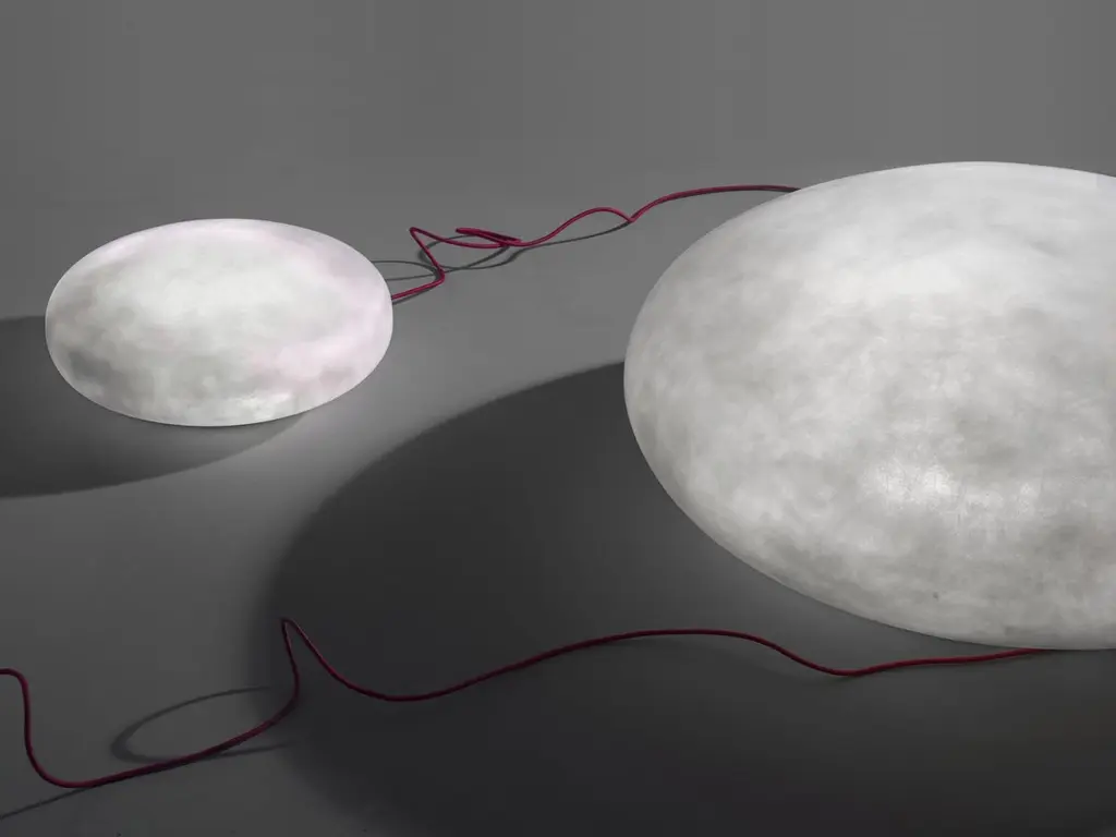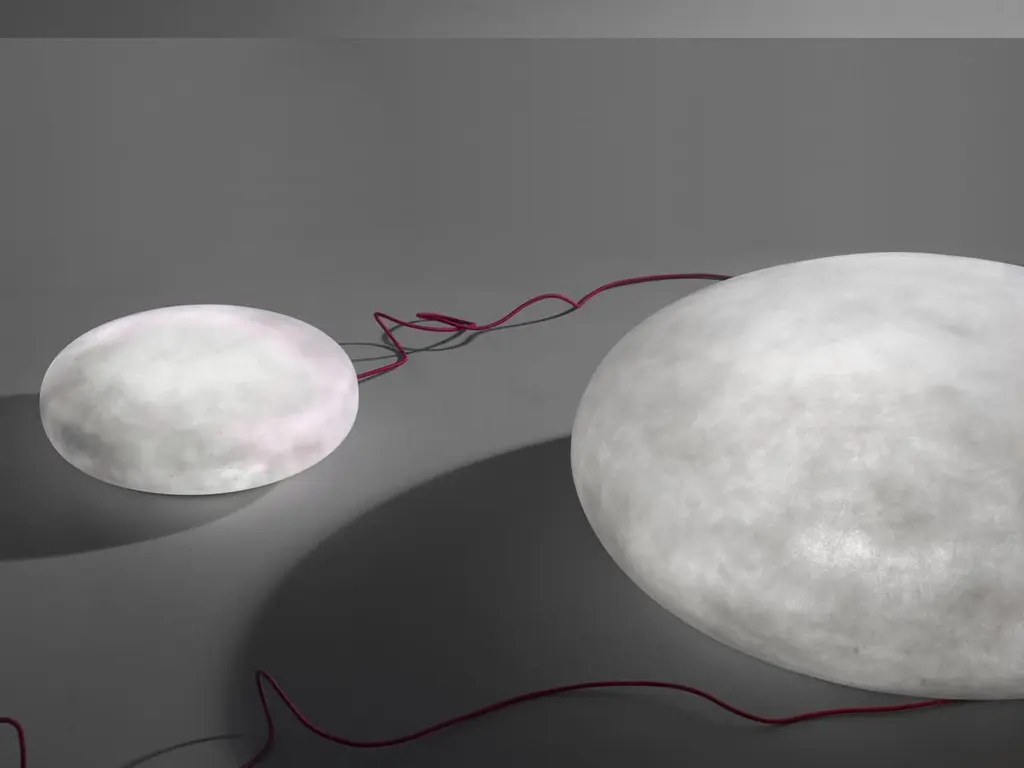 Etty lamp by Imperfettolab2015Designer : Verter TurroniDimensions: Ø 100 x 41 cmMaterials: Fibreglass Lamp in fibreglass.Imperfetto labWho we are ? We are a family.Verter Turroni, Emanuela Ravelli and our children Elia, Margherita and Eusebio.All together, we are separate parts and their expansion.The laboratory is in the care of Verter.From the sketch on paper he mixes materials, shapes and colours to the definition of the object.His intuitive and visionary research is performed with the complicity, recognition and practical support of his brother Erich.Emanuela is the voice of a vivid and silent work.She connects Imperfettolab with the other and with the rest of the world, respecting its nature and identity.She watches over its wholeness and authenticity.The playful spirit is entrusted to our children.They are the ones who test our works, certify their durability, functionality and enjoyment.We believe it is their expression, after all, that validates and makes our work universal.Since 1992, our thoughts and actions have moved, grown and taken shape in the land of Romagna.Between hills of cherry and olive trees, cultivated plains and piles of recyclable steel and iron.In between, the ancient Roman road via Emilia.A contrasting and mutating landscape that reflects in our furnishing sculptures.Ours is an open space, the times of art and life seamlessly merge.