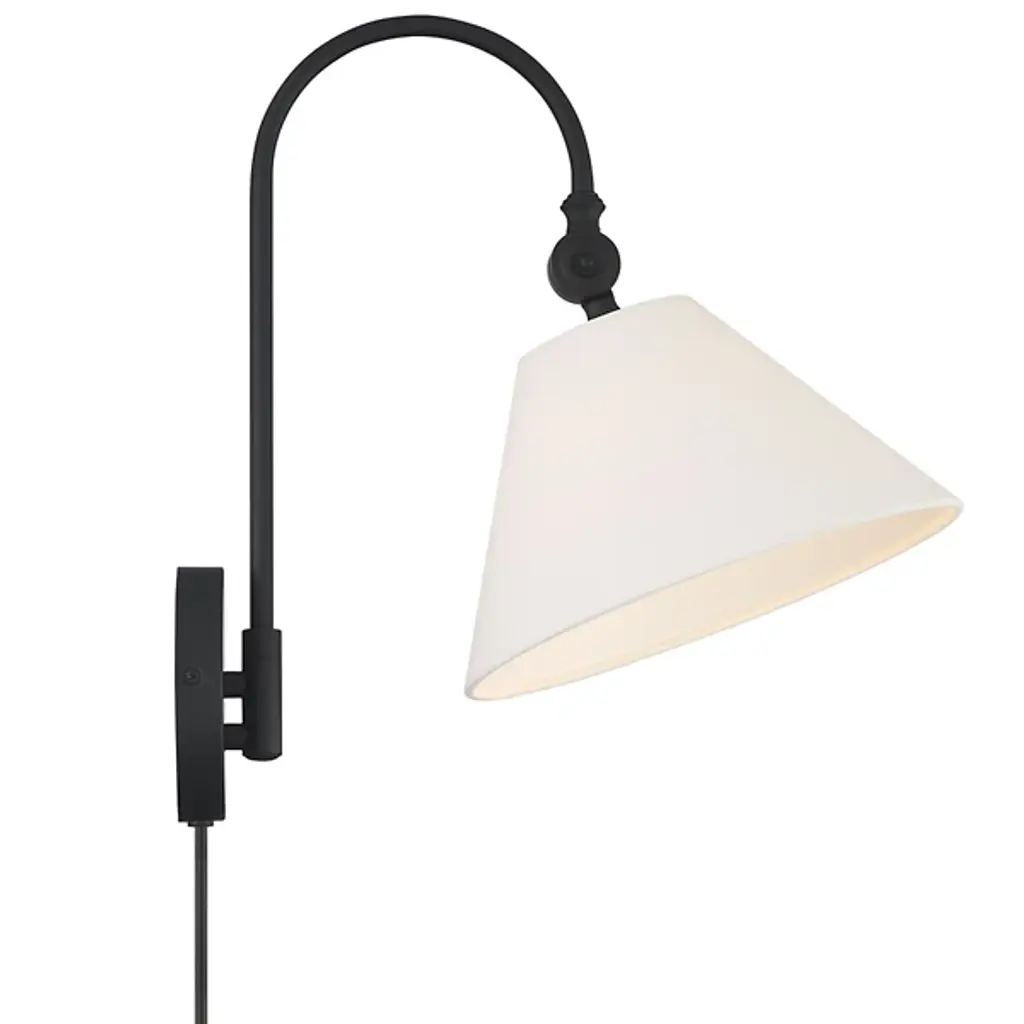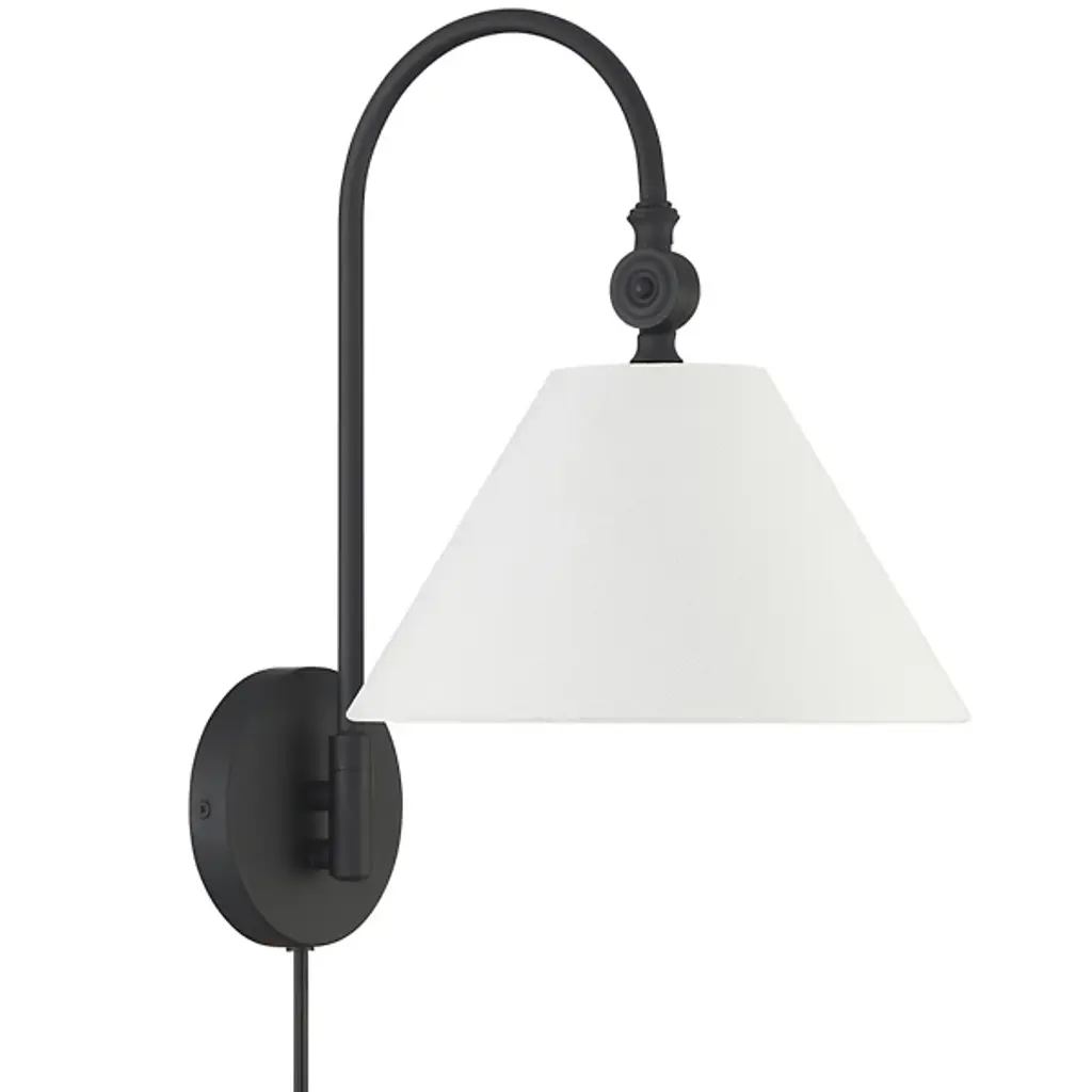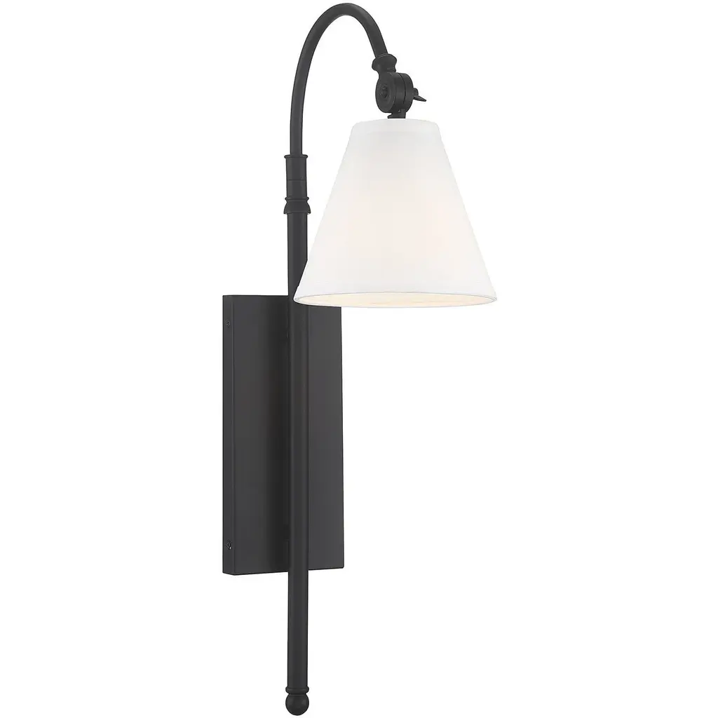 The Evan Wall Sconce from Alder & Ore features a simple, memorable design. The fixture emerges from a circular wall mount via a single curving arm, embodying subtle Bohemian notes. This damp-listed fixture pairs a metal frame with a white fabric shade, creating a soft, inviting glow. The adjustable arm creates flexible lighting options, making it a great fit for transitional interiors and classic decor. It casts an ambient glow in all directions.