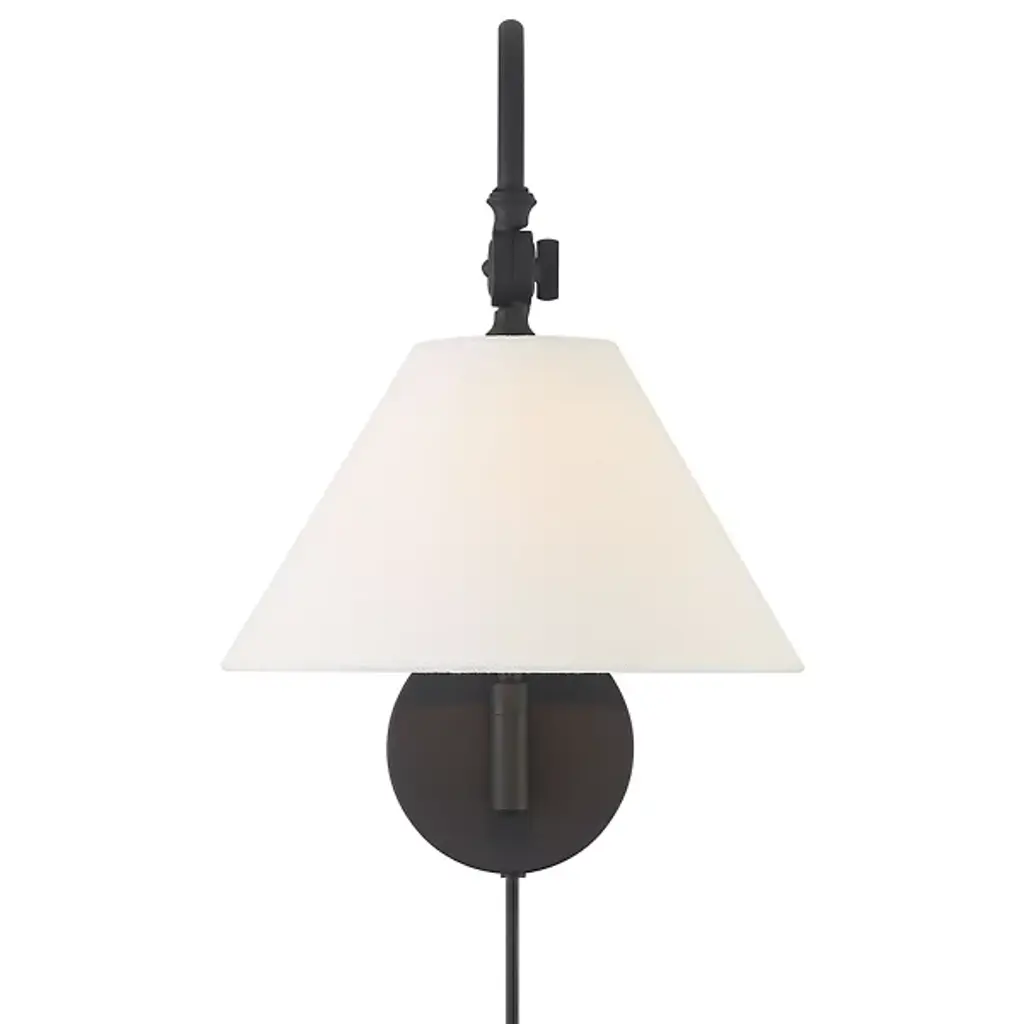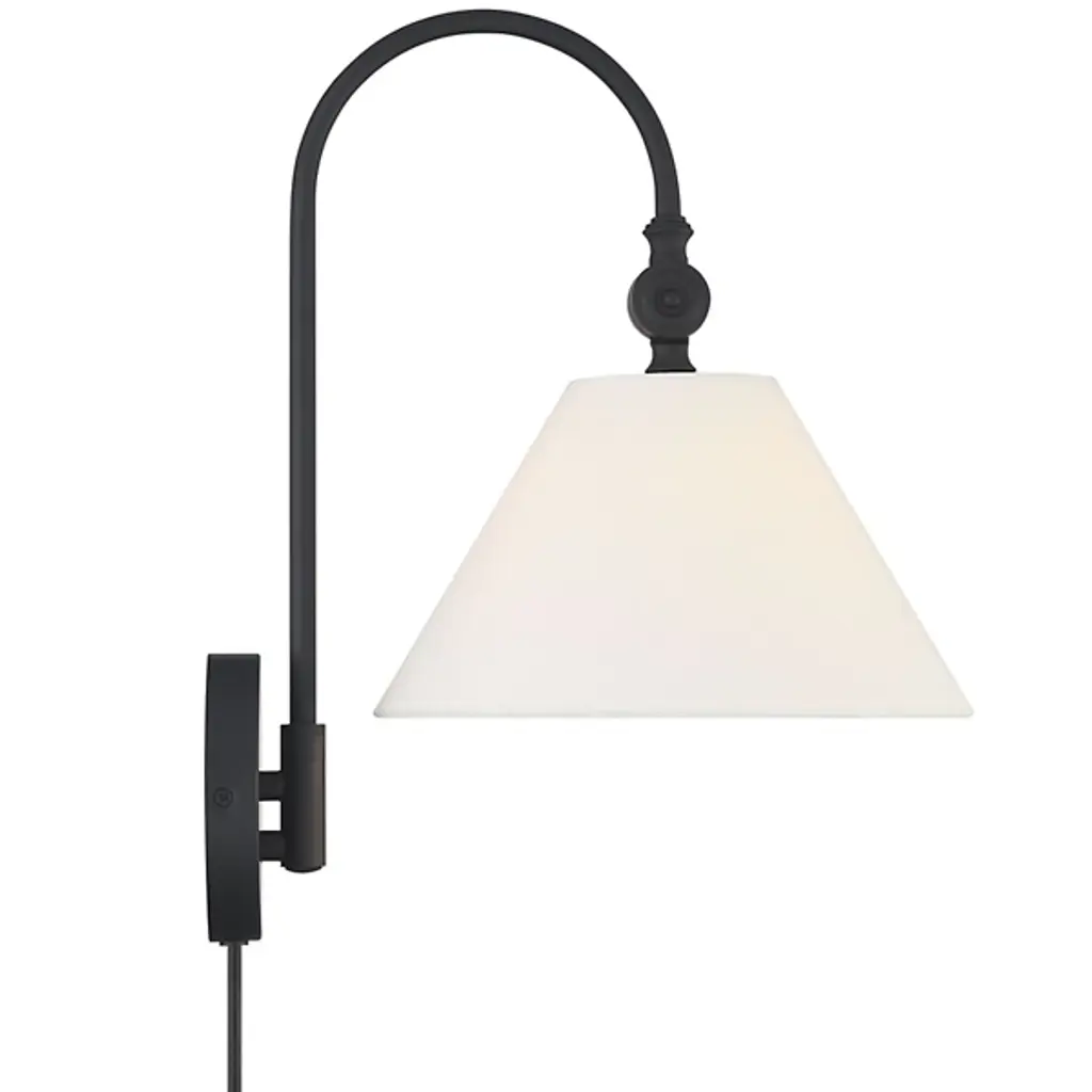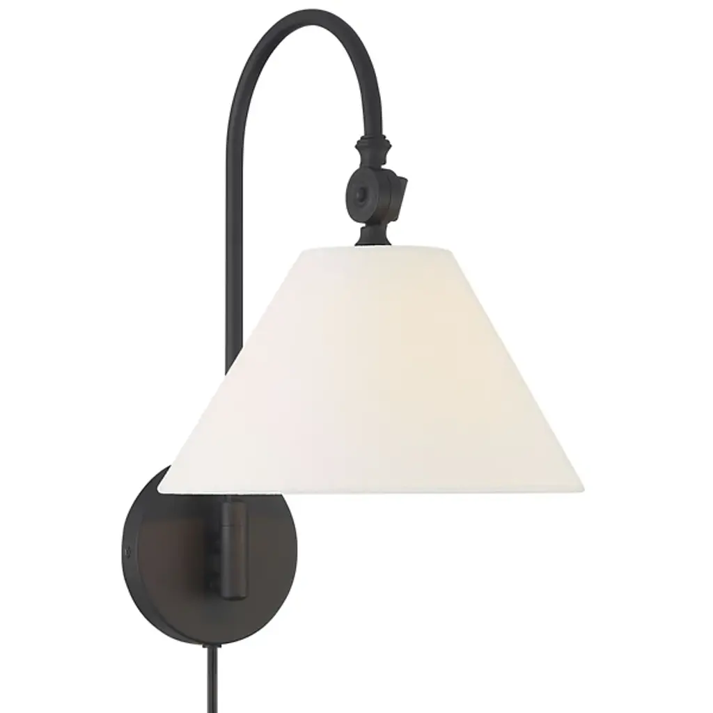 The Evan Wall Sconce from Alder & Ore features a simple, memorable design. The fixture emerges from a circular wall mount via a single curving arm, embodying subtle Bohemian notes. This damp-listed fixture pairs a metal frame with a white fabric shade, creating a soft, inviting glow. The adjustable arm creates flexible lighting options, making it a great fit for transitional interiors and classic decor. It casts an ambient glow in all directions.