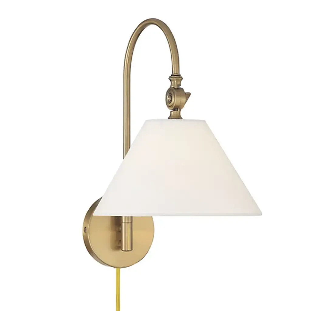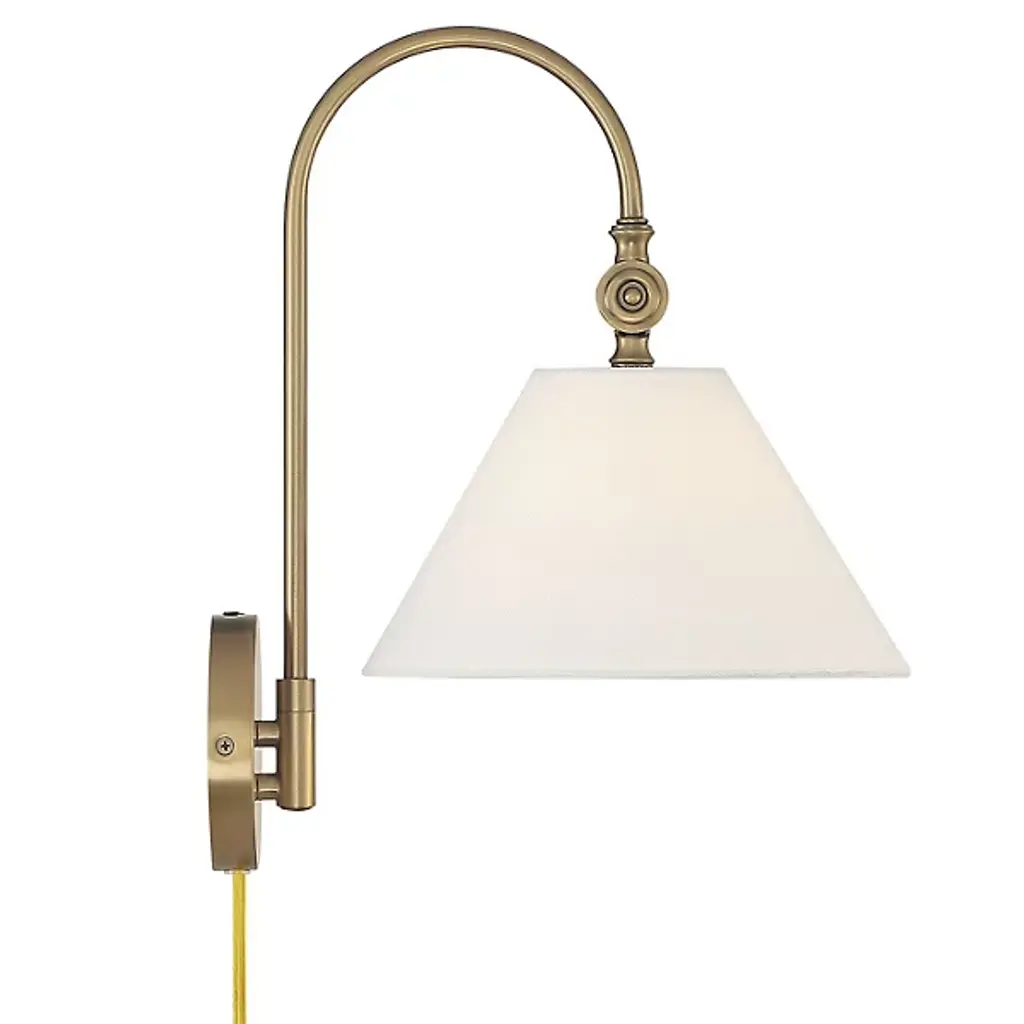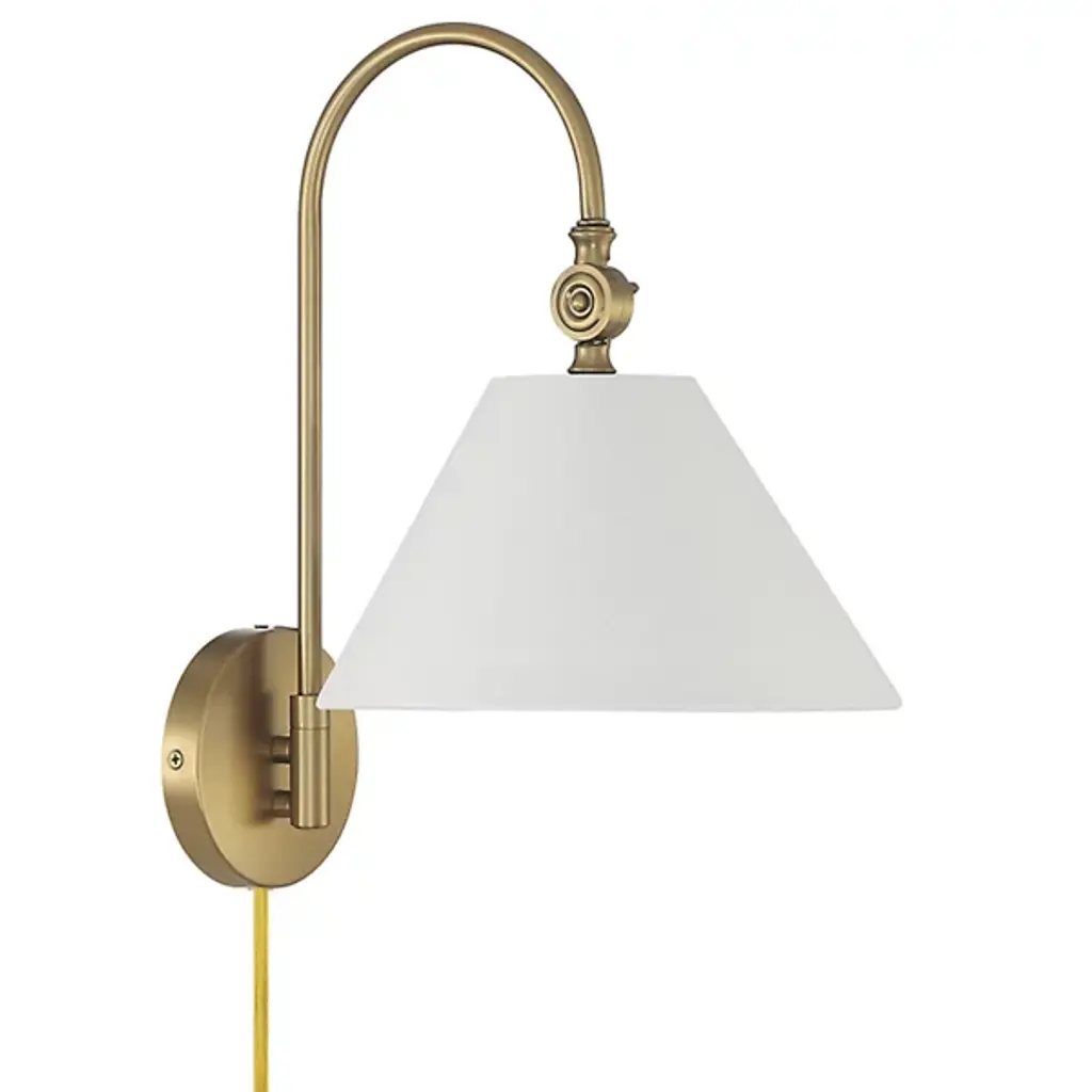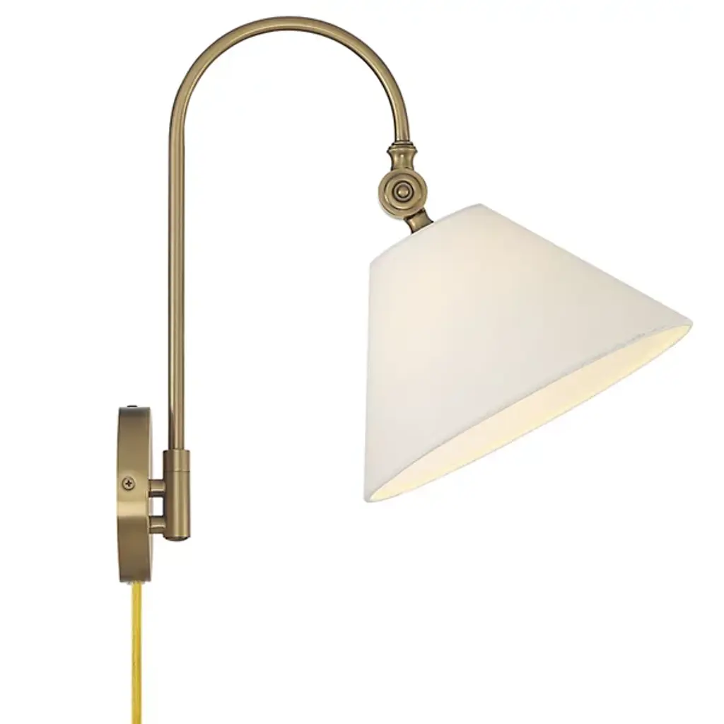 The Evan Wall Sconce from Alder & Ore features a simple, memorable design. The fixture emerges from a circular wall mount via a single curving arm, embodying subtle Bohemian notes. This damp-listed fixture pairs a metal frame with a white fabric shade, creating a soft, inviting glow. The adjustable arm creates flexible lighting options, making it a great fit for transitional interiors and classic decor. It casts an ambient glow in all directions.
