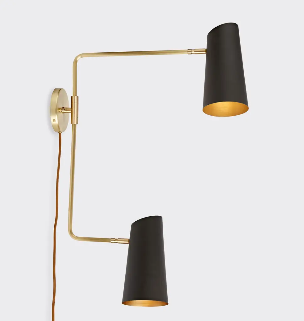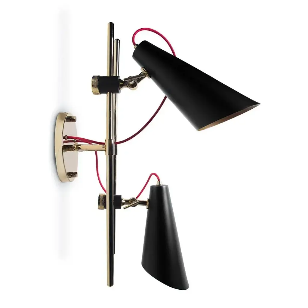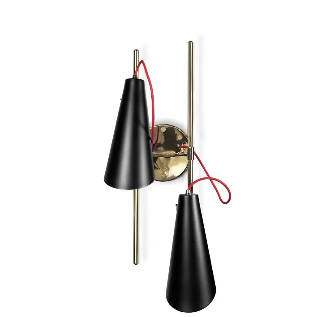 Evans is a contemporary wall light with a heavy mid-century modern influence, making it an exquisite lighting design. This modern wall sconce is designed and handmade in Portugal, ensuring a high level of craftsmanship and the best final product. Both the lamp mount and the body are handmade in brass with a gold-plated finish, while the lamp shades are made of aluminum, with a standard matte black finish. Up to 250V (Europe/UK Standard).