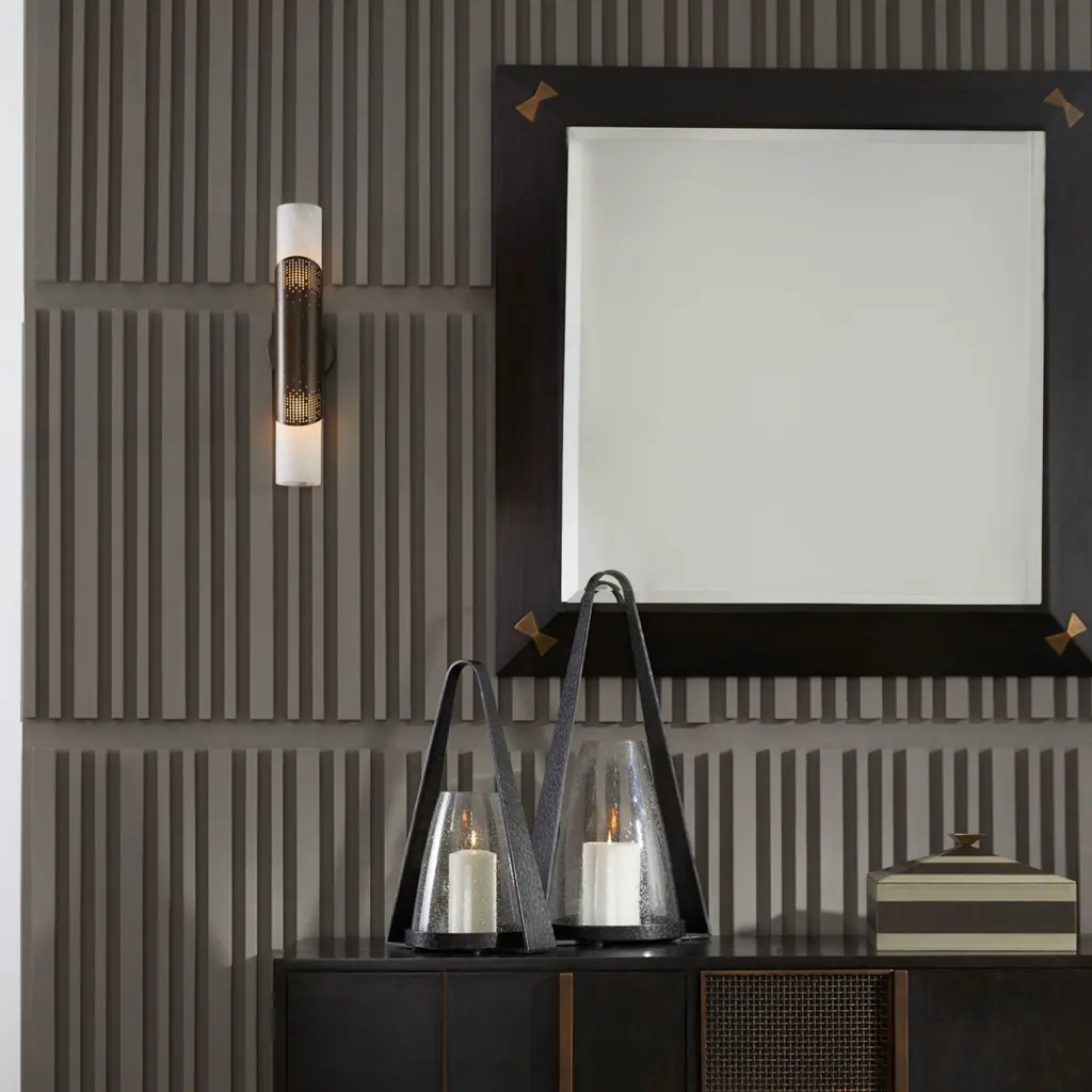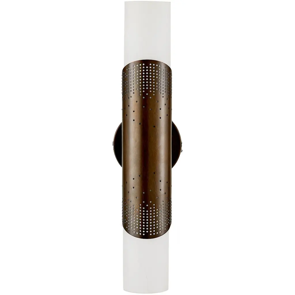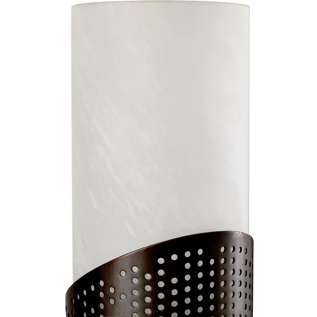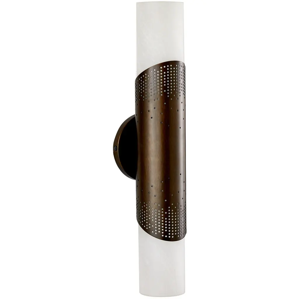 A softly rounded column of matte swirl glass is held by an English bronze-plated steel shield, perforated to let accents of light shine through. This linear style may also recall celestial constellations of the night sky.