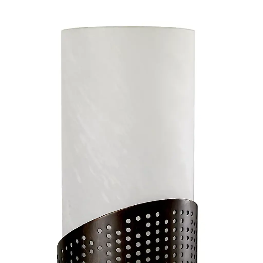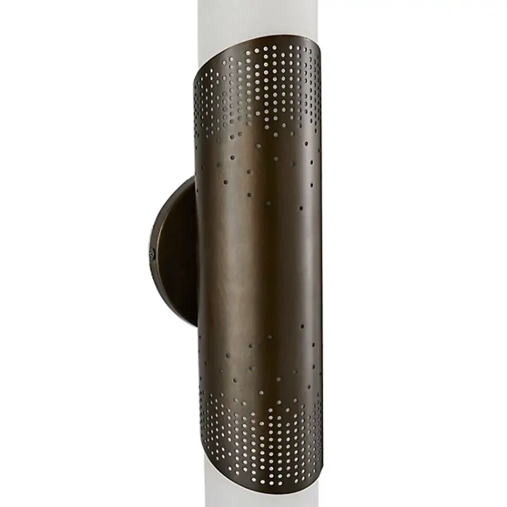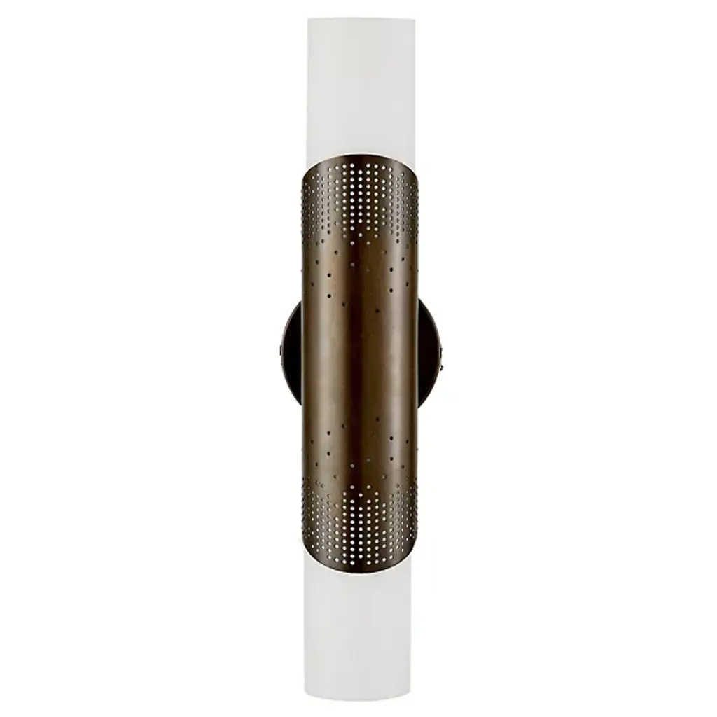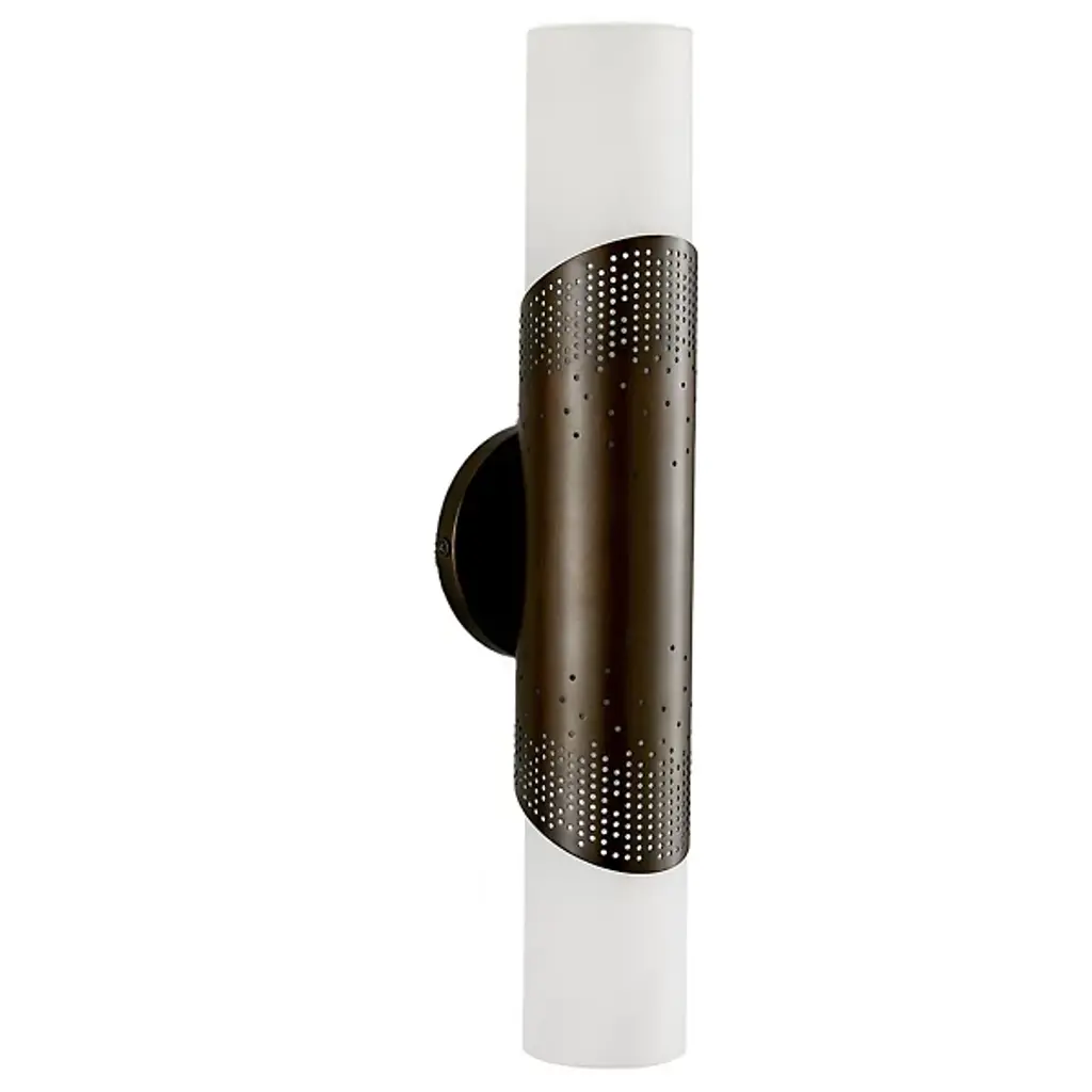 The Exelsior Wall Sconce from Arteriors is a stunning blend of contemporary elegance and celestial inspiration. This exquisite fixture features a softly rounded column of matte swirl glass, beautifully encased by an English bronze-plated steel shield. The shield is artfully perforated, allowing accents of light to shine through, creating a mesmerizing effect reminiscent of the constellations in the night sky. With its linear design and a glass shade, this wall sconce adds refinement to your space, whether illuminating a hallway, accenting a living room, or enhancing a bedroom.