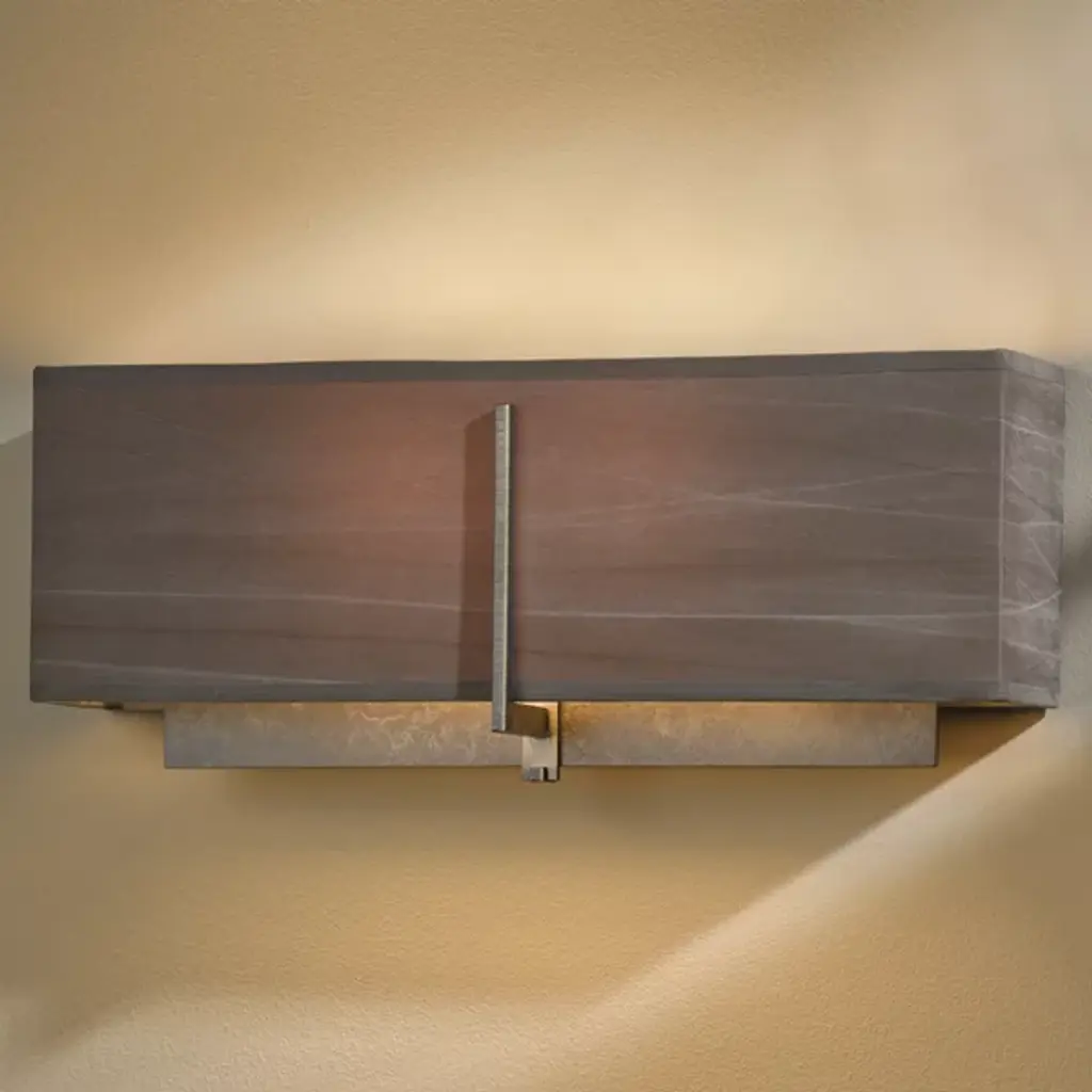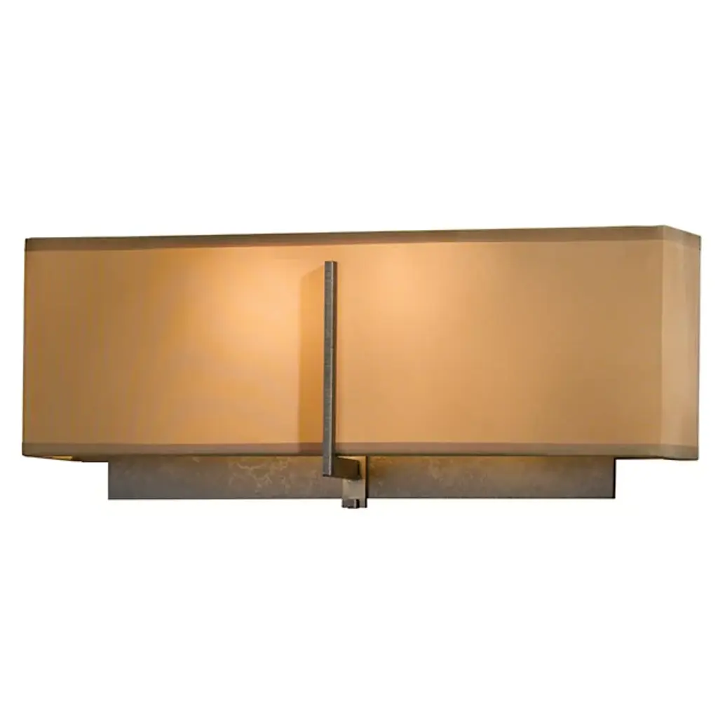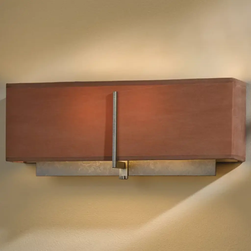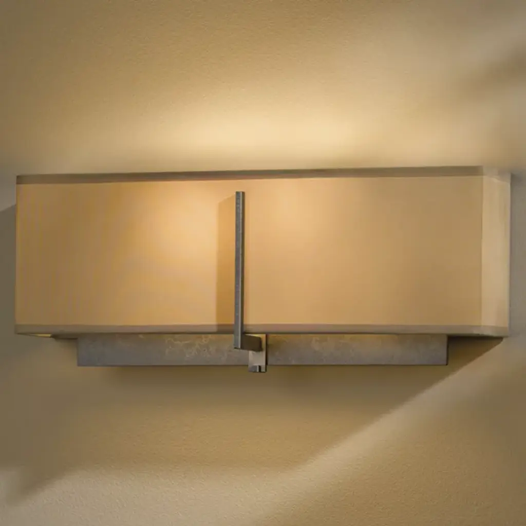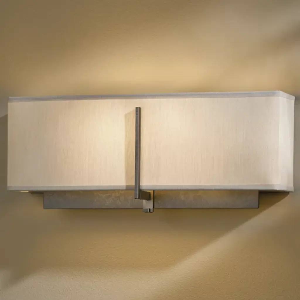 The Exos Wall Sconce from Hubbardton Forge is a rather unassuming piece that uses subtle Iron accents to complement the overall design. A hand-forged Iron mount peeks out the bottom of the shade, with a linear Iron segment splitting it in half to create a simple symmetrical effect. The piece produces a soft ambient glow, and because of the fabric lamp shades rectangular design, it fans light upwards and downwards. Use it along your hallway as a transitional light or to add elegant ambient lighting next to your bed.