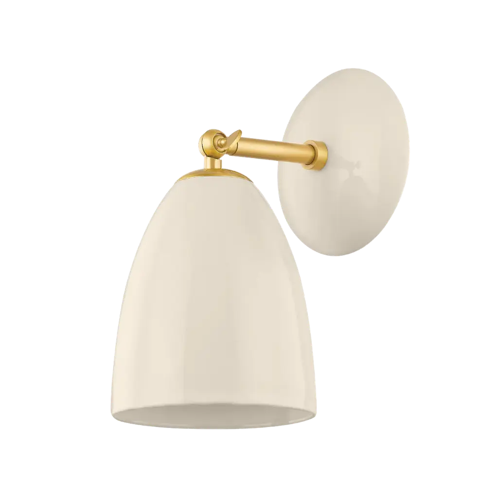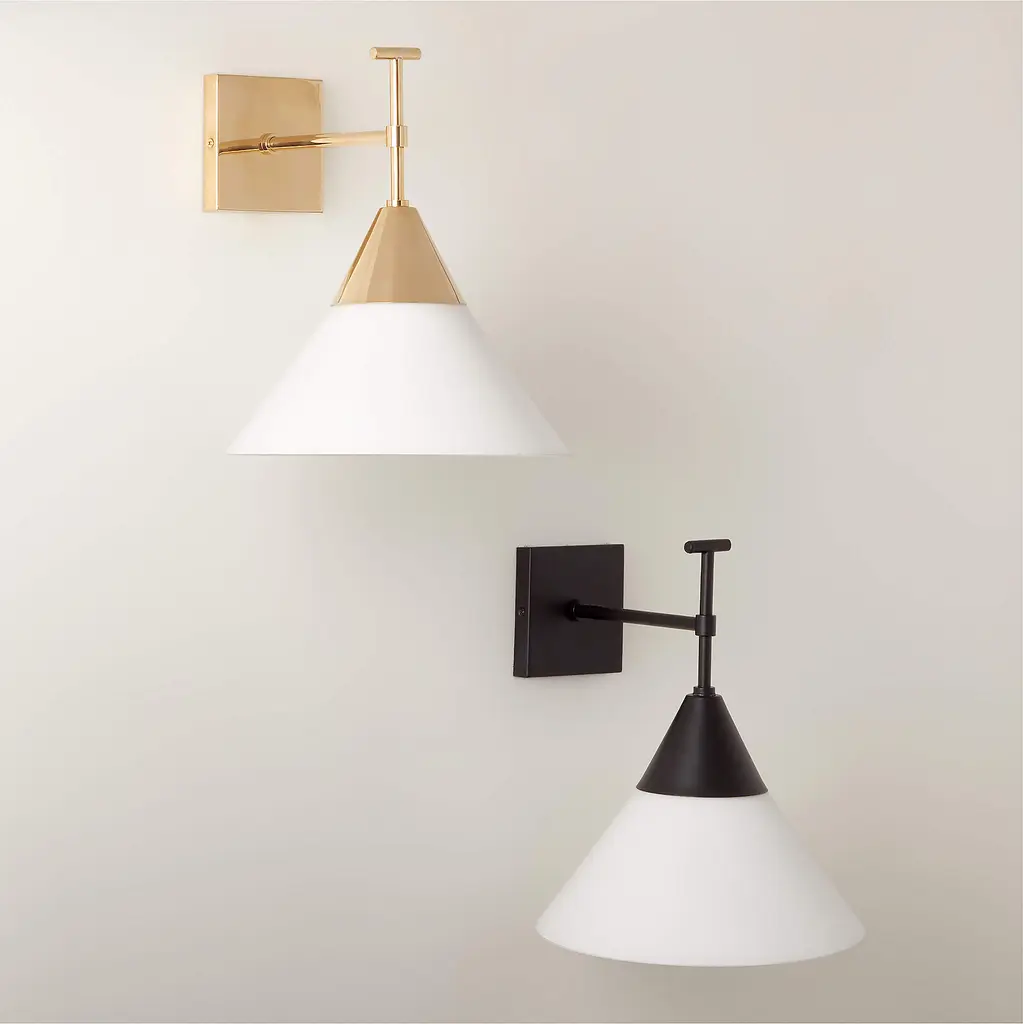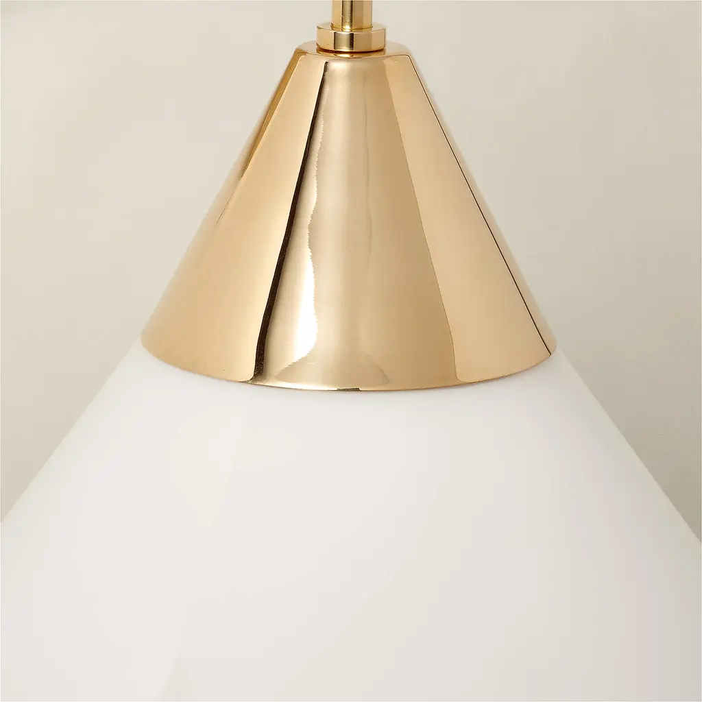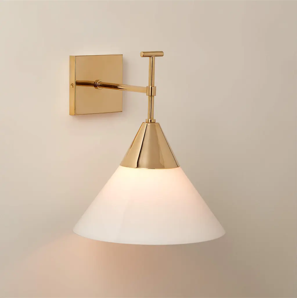 Polished brass wall sconce debuted as part of Paul McCobb's second series of lighting, first introduced in 1952 and just as stunning today. Solid polished unlacquered brass and opaline glass shade spotlight the timeless forms and considered ideology typical of Paul McCobb. Each major component is a custom design unique to Paul McCobb lighting. CB2 exclusive. Due to the nature of the material, brass patina will vary in color and darken over time.