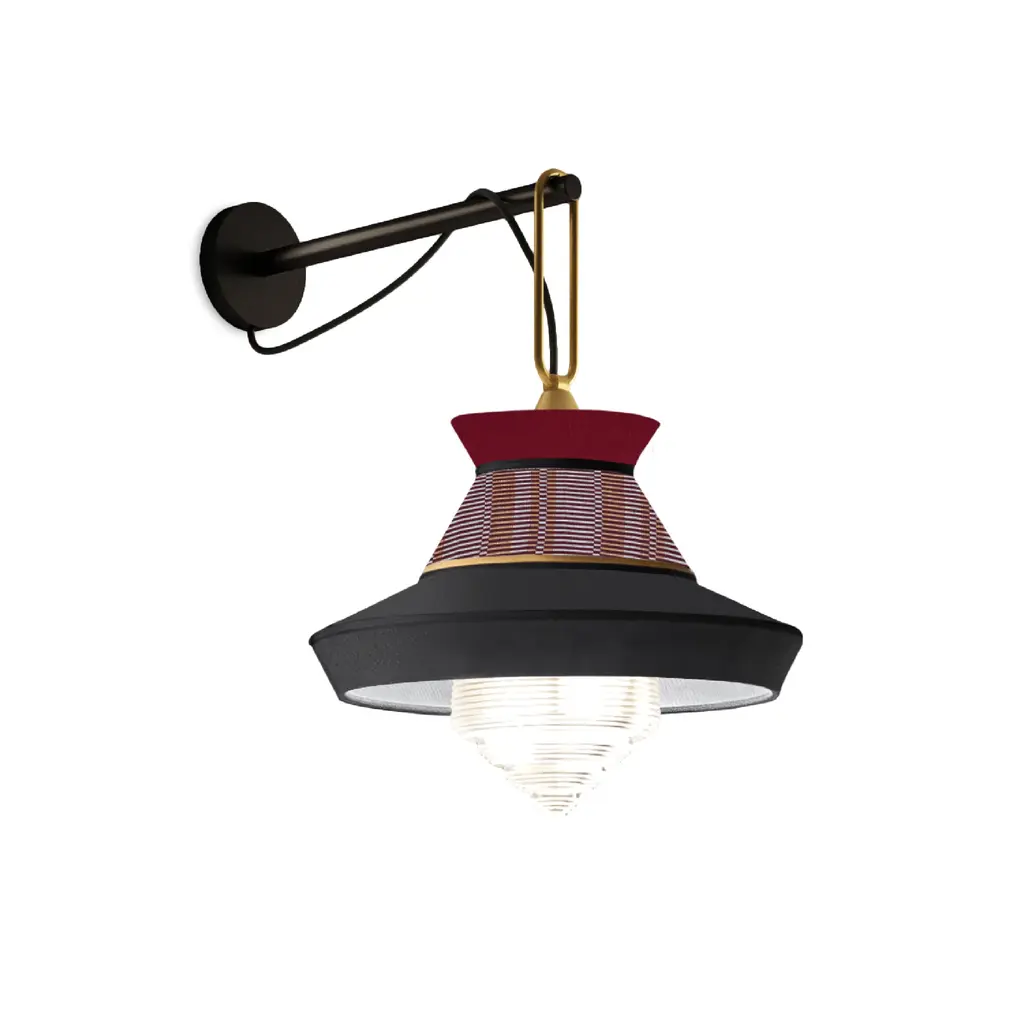 Inspired by the art deco period, which found its maximum expression in the 1920s and is characterized by a modern and geometric taste, the new Calypso Ap skilfully mixes, as in a perfect recipe, fabrics with rigorous textures and patterns with bright colors inspired by South American and tropical culture, in a whimsical combination that makes Calypso an exclusive product with a strong visual impact. The wall lamp version is characterized by a thin and elegant arm with a matt silk black lacquered finish. It also has a satin brass ring that supports the lamp. The fabric lampshade, capable of playing with different materials, in the Antigua, Guadalupe, and Martinique models is composed of different shapes, decorations and colors to complete spaces in the name of creative freedom. The diffuser, made of transparent glass, contains a dimmable LED bulb
