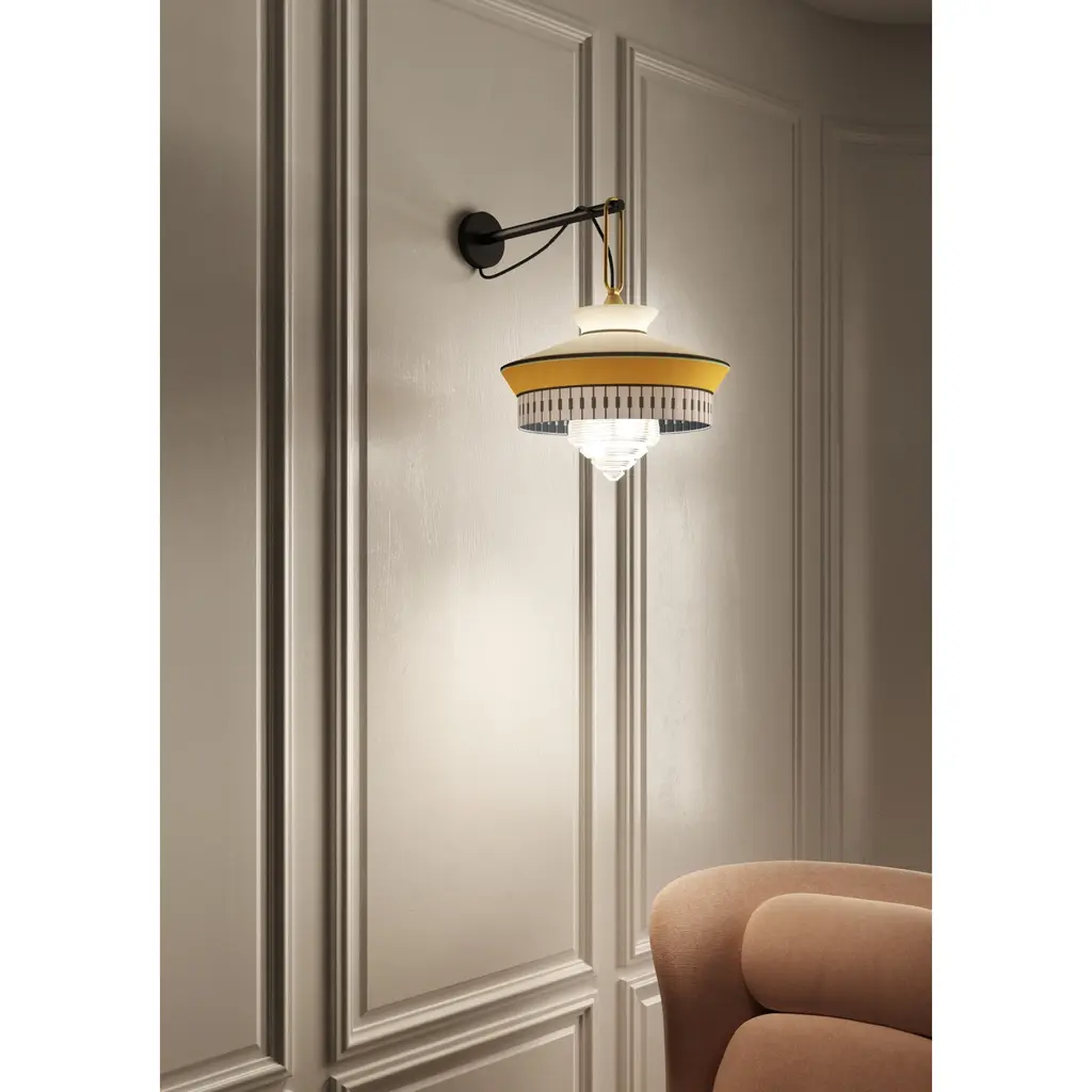 Inspired by the art deco period, which found its maximum expression in the 1920s and is characterized by a modern and geometric taste, the new Calypso Ap skilfully mixes, as in a perfect recipe, fabrics with rigorous textures and patterns with bright colors inspired by South American and tropical culture, in a whimsical combination that makes Calypso an exclusive product with a strong visual impact. The wall lamp version is characterized by a thin and elegant arm with a matt silk black lacquered finish. It also has a satin brass ring that supports the lamp. The fabric lampshade, capable of playing with different materials, in the Antigua, Guadalupe, and Martinique models is composed of different shapes, decorations and colors to complete spaces in the name of creative freedom. The diffuser, made of transparent glass, contains a dimmable LED bulb