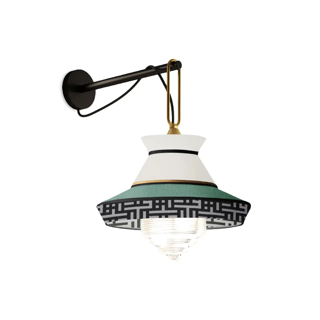 Inspired by the art deco period, which found its maximum expression in the 1920s and is characterized by a modern and geometric taste, the new Calypso Ap skilfully mixes, as in a perfect recipe, fabrics with rigorous textures and patterns with bright colors inspired by South American and tropical culture, in a whimsical combination that makes Calypso an exclusive product with a strong visual impact. The wall lamp version is characterized by a thin and elegant arm with a matt silk black lacquered finish. It also has a satin brass ring that supports the lamp. The fabric lampshade, capable of playing with different materials, in the Antigua, Guadalupe, and Martinique models is composed of different shapes, decorations and colors to complete spaces in the name of creative freedom. The diffuser, made of transparent glass, contains a dimmable LED bulb