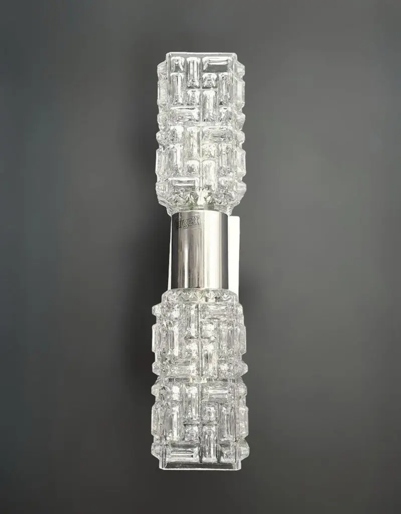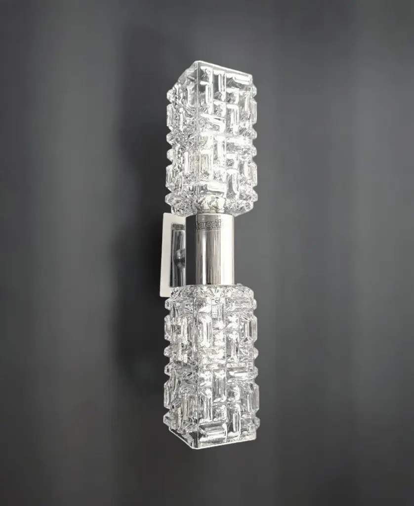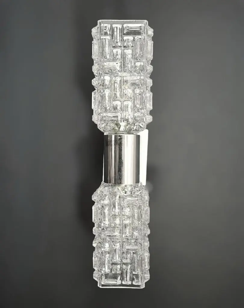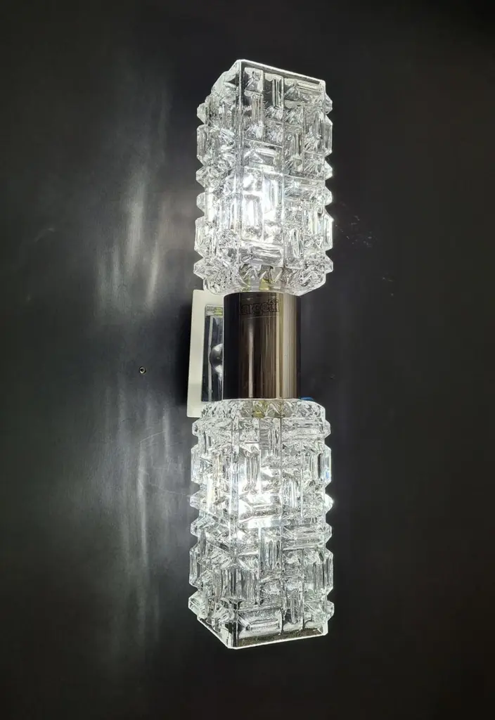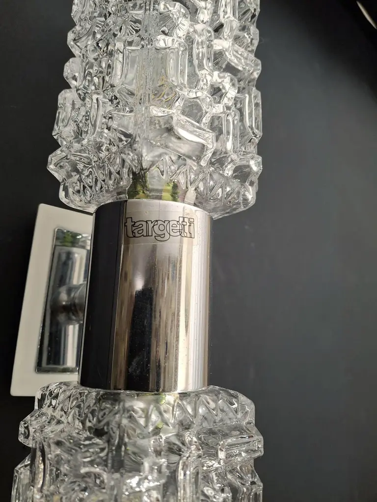 Vintage Italian wall light with clear faceted crystal shades / Made in Italy by Targetti, circa 1970sOriginal maker's mark on the frameHeight: 13.5 inches / Width: 3.5 inches / Depth: 4 inches2 lights / E14 type / max 40W each18 available in stock in Italy, price listed is for each itemOrder reference #: FABIOLTD K103