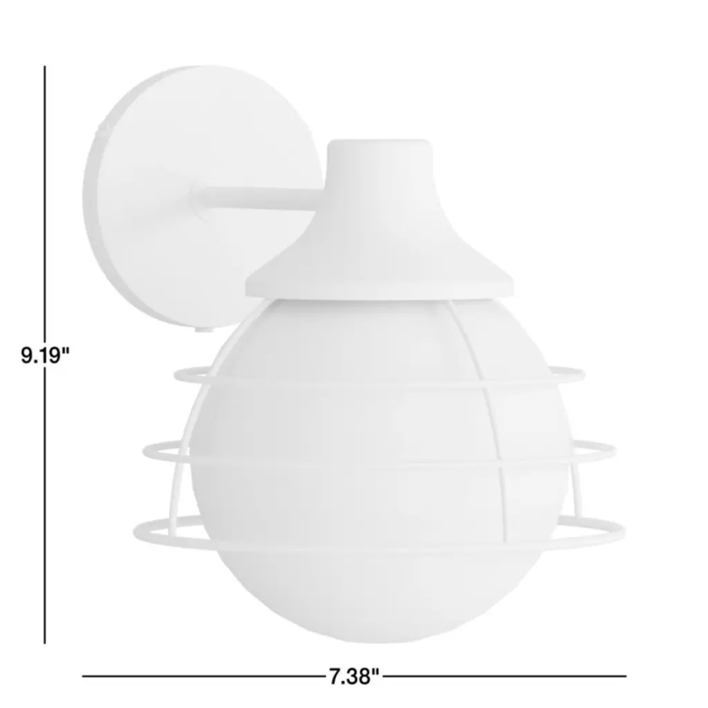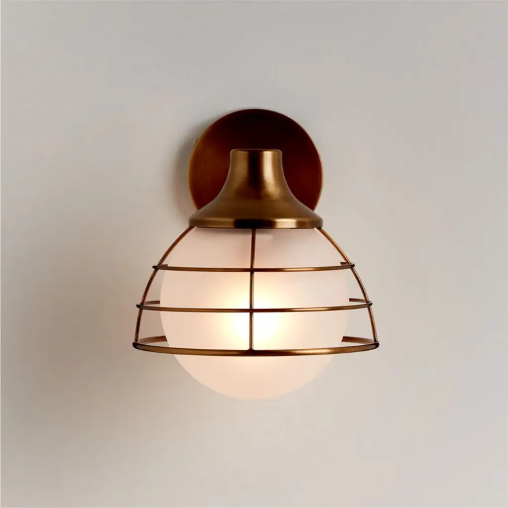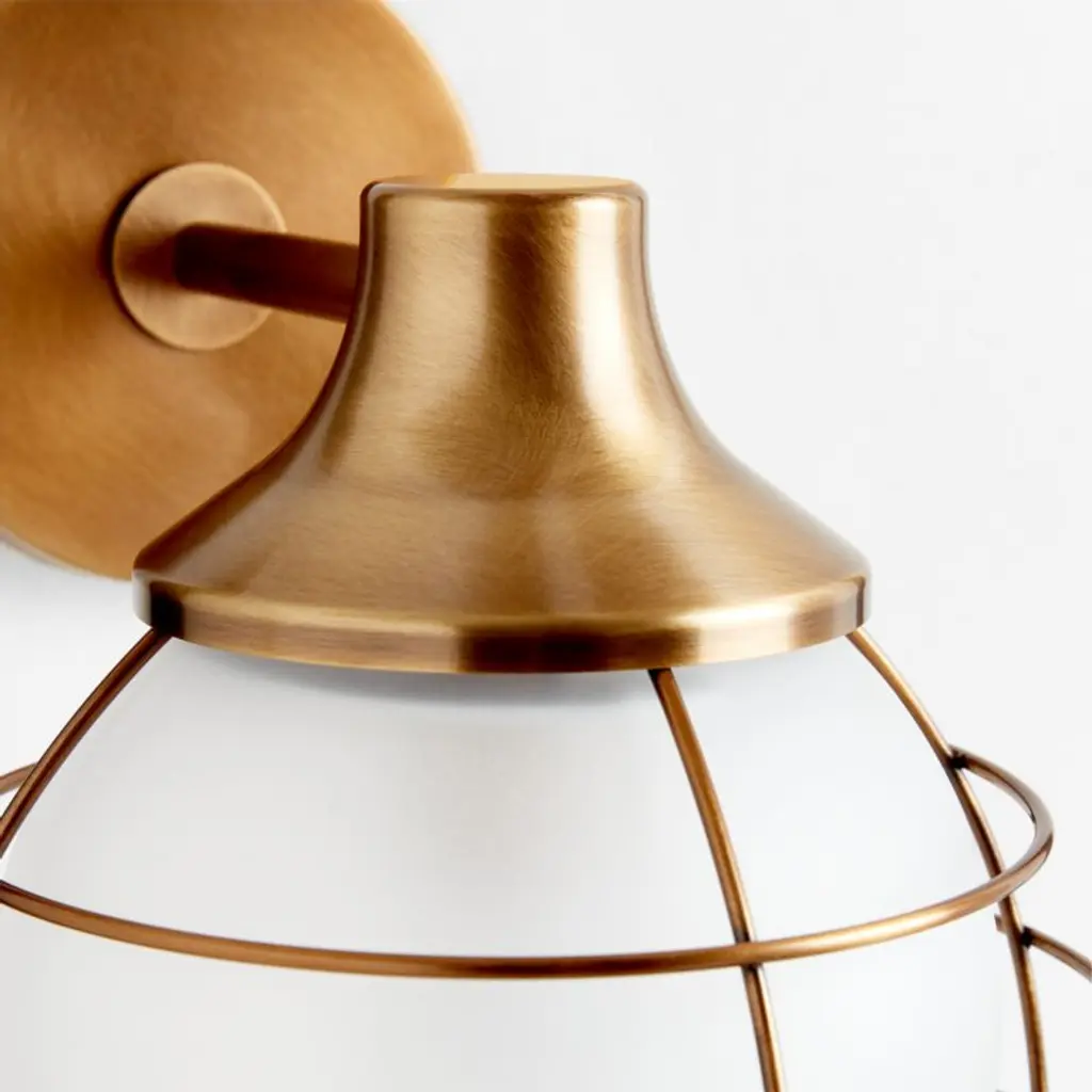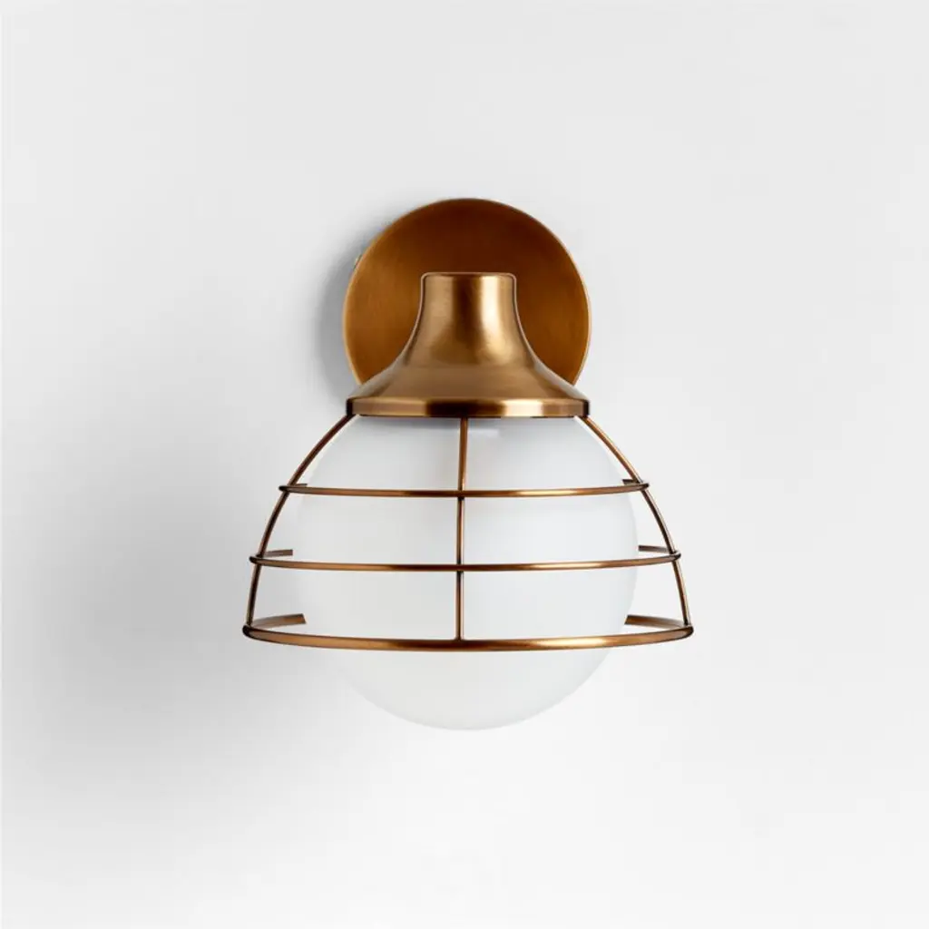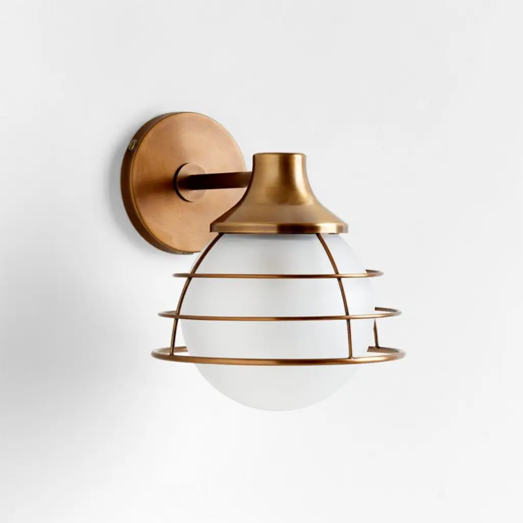 Our modern take on the iconic industrial cage light opens up the wire frame to show off the glowing white globe within. The gleaming sconce pairs a burnished brass finish with etched glass that casts a soft illumination. Designed as an update to classic outdoor lighting, Fairfax is right at home on a front porch, flanking a garage door or brightening a balcony.