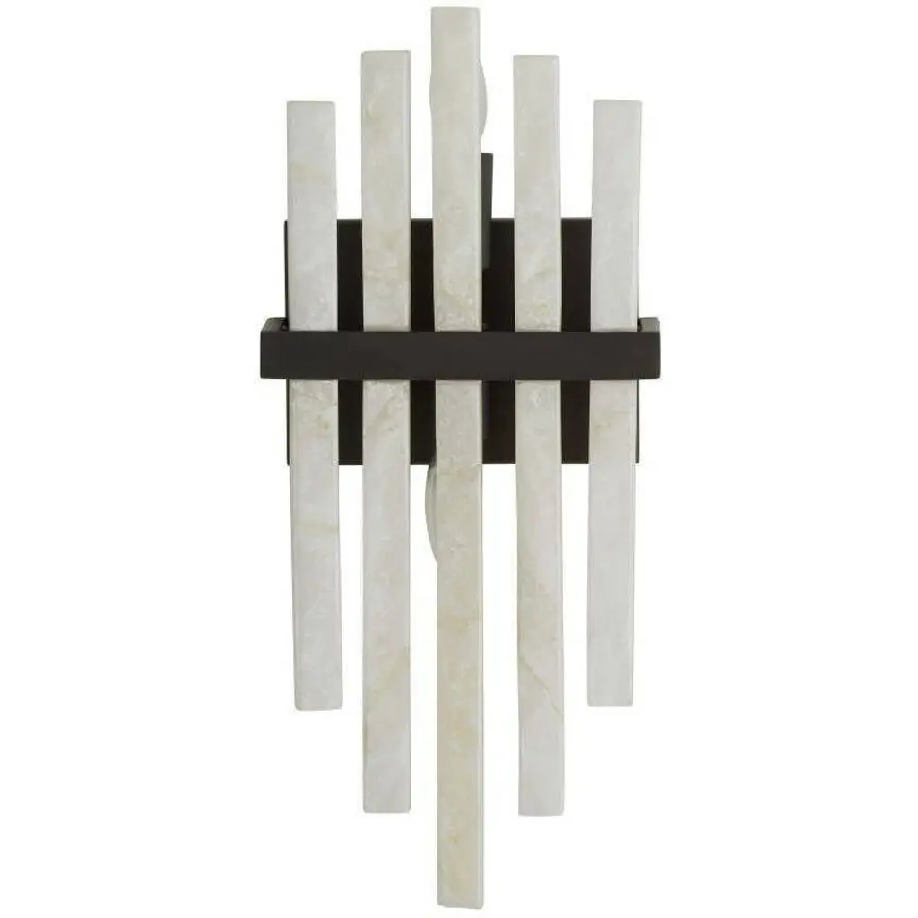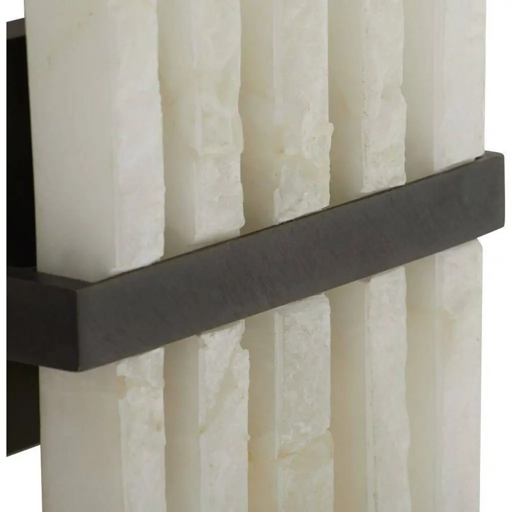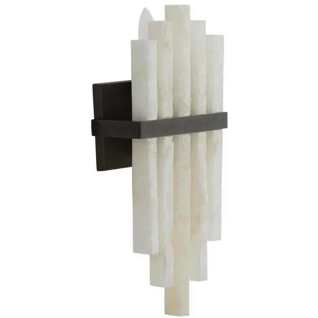 With a silhouette inspired by the ranks of a pipe organ, echoing forms of white chiseled alabaster are mounted on a rectangular backplate of English bronze-plated iron. The raw chiseled edges of each unique piece of stone highlight the character of Fairfax's materials. Damp-rated, although limited covered outdoor areas may affect finish. Finish will vary.
