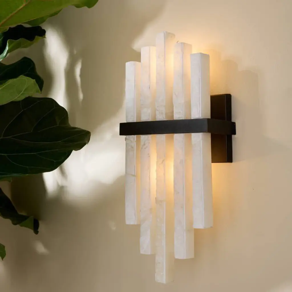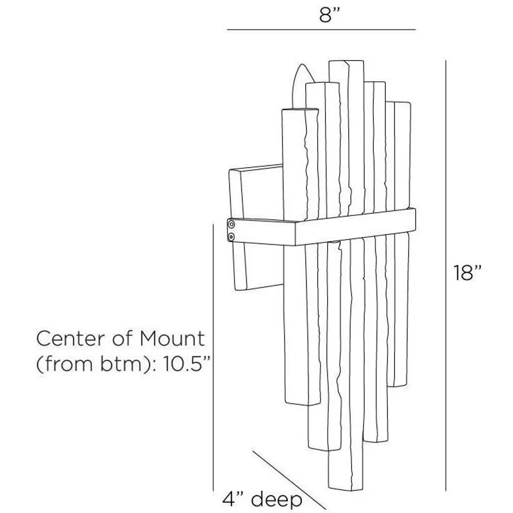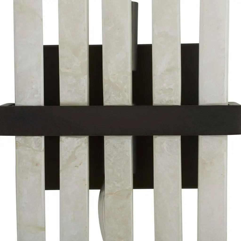 With a silhouette inspired by the ranks of a pipe organ, echoing forms of white chiseled alabaster are mounted on a rectangular backplate of English bronze-plated iron. The raw chiseled edges of each unique piece of stone highlight the character of Fairfax's materials. Damp-rated, although limited covered outdoor areas may affect finish. Finish will vary.