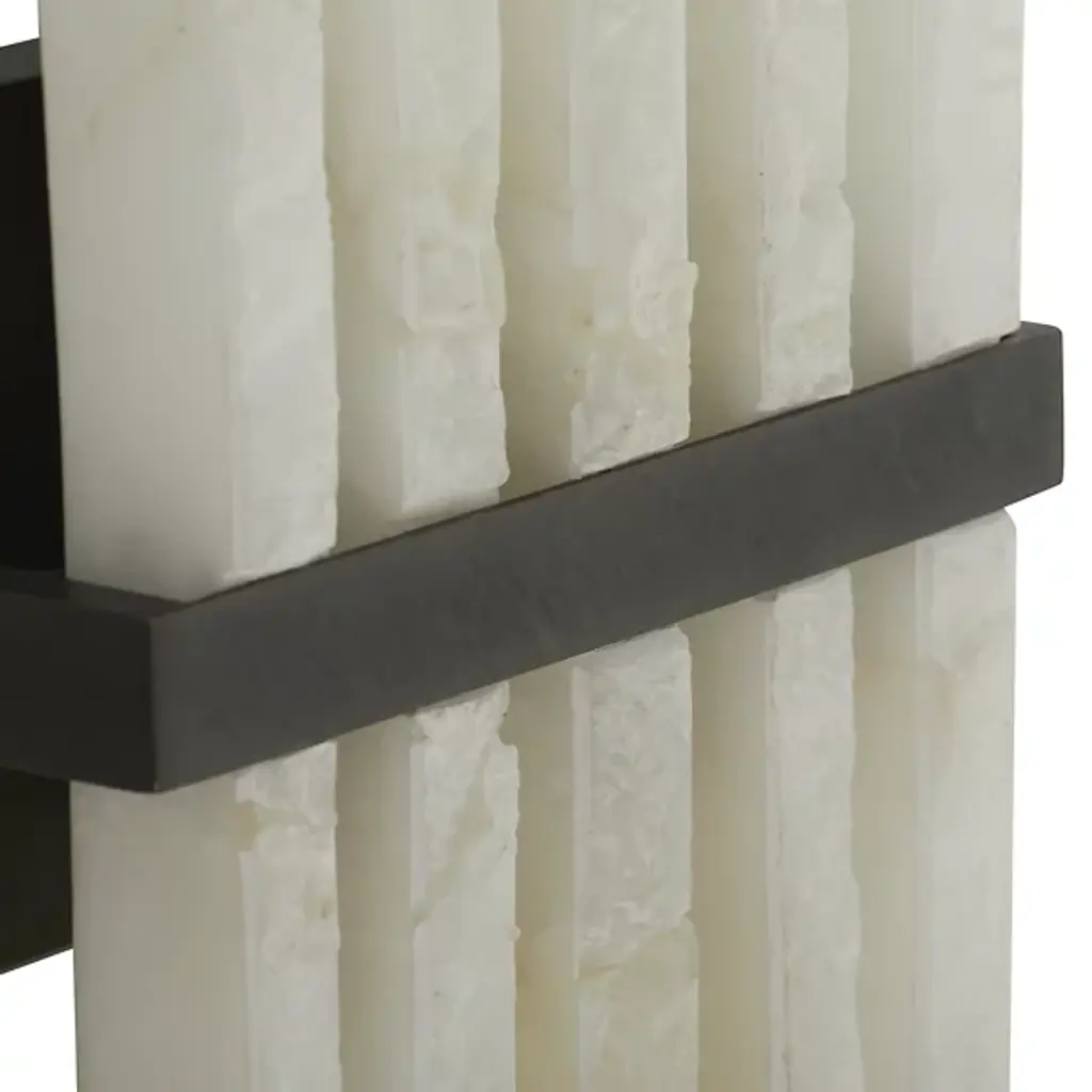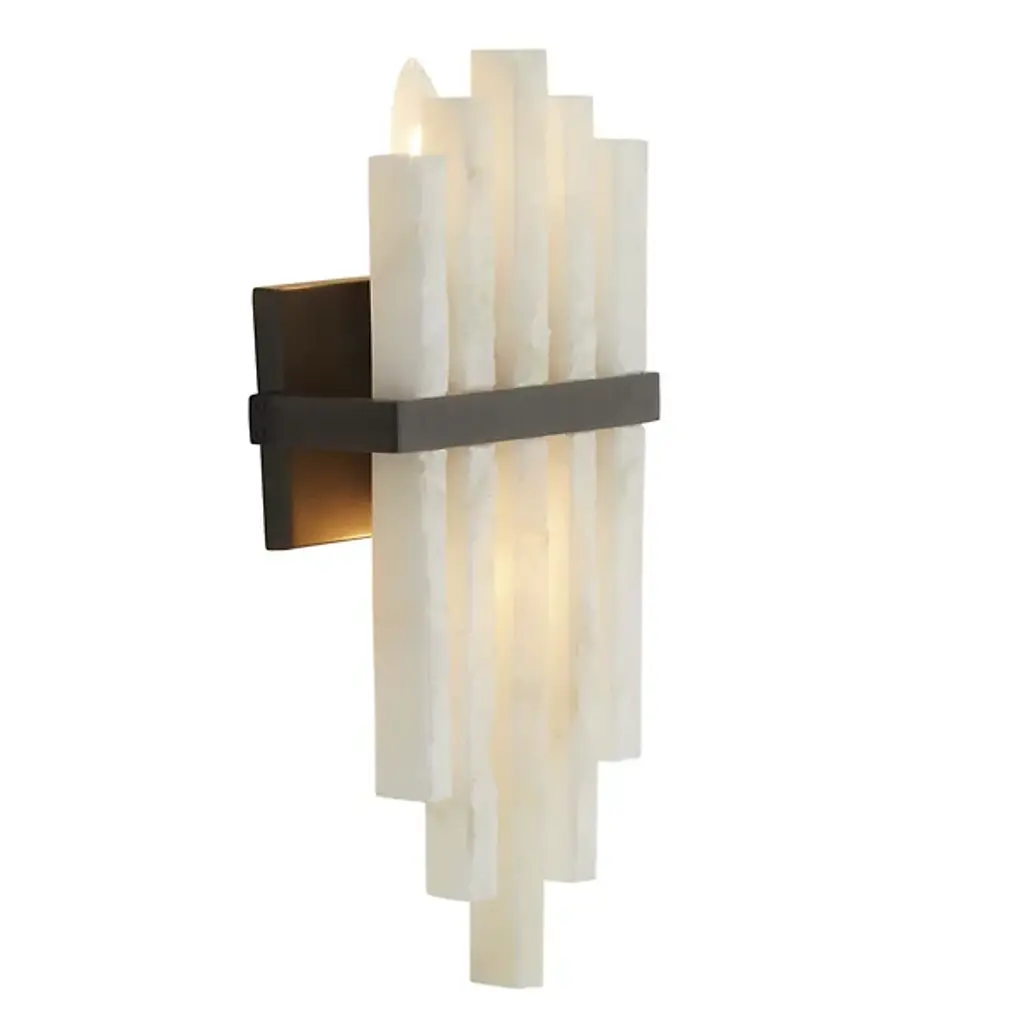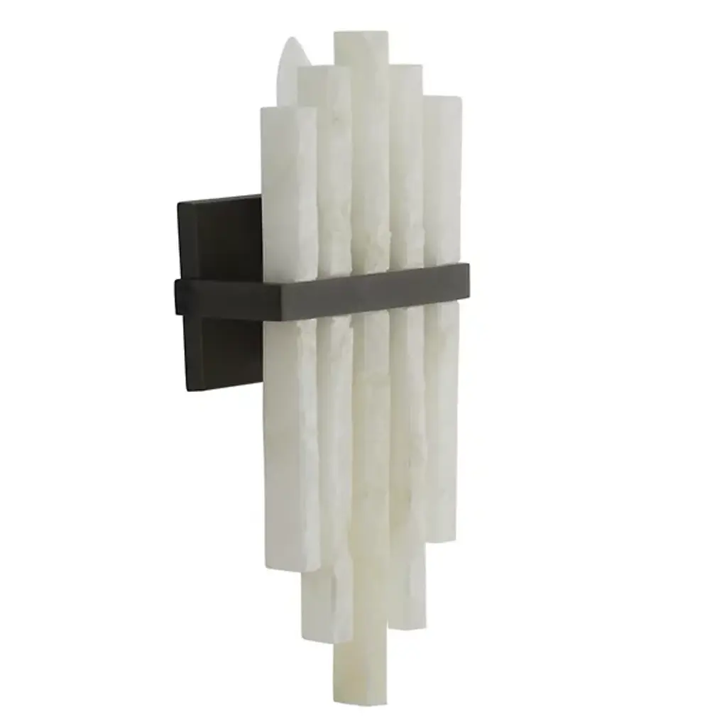 The Fairfax Wall Sconce from Arteriors showcases dramatic alabaster columns arranged in a unique formation. Drawing inspiration from classical pipe organs, this striking fixture features rhythmic columns of alabaster mounted against a sophisticated backplate. Each raw-edged alabaster piece tells its own story through unique variations in the stone's character, creating an interplay of light and texture. While damp-rated for versatility, this dimmable masterpiece requires thoughtful placement in covered outdoor areas to preserve its distinctive finish. The Fairfax Wall Sconce's dramatic vertical composition makes it an architectural statement piece for distinguished interiors.