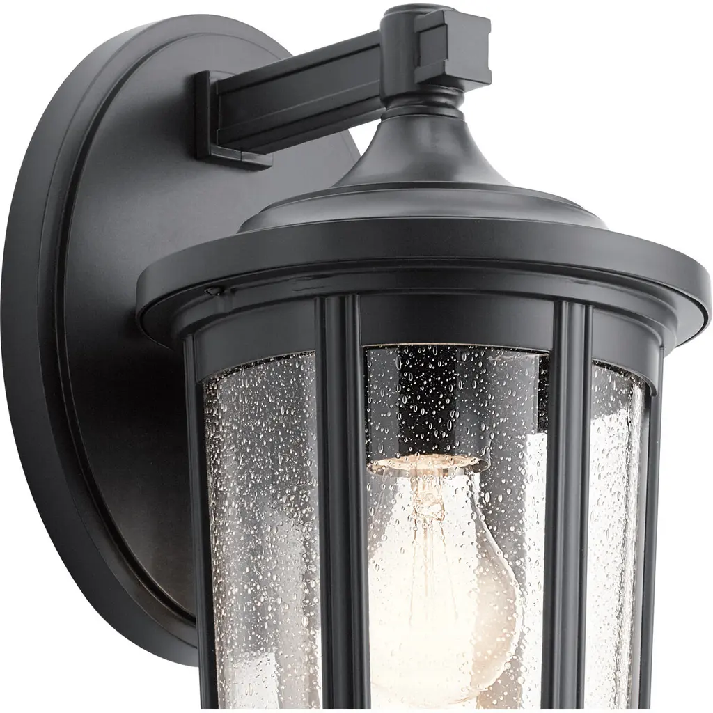 The 14.5 inch 1 light outdoor wall light with clear seeded glass and Black finish offers a modern take on a traditional outdoor lantern. This beautiful outdoor wall light fits nicely with traditional architectural styles, making it the perfect piece for your home.