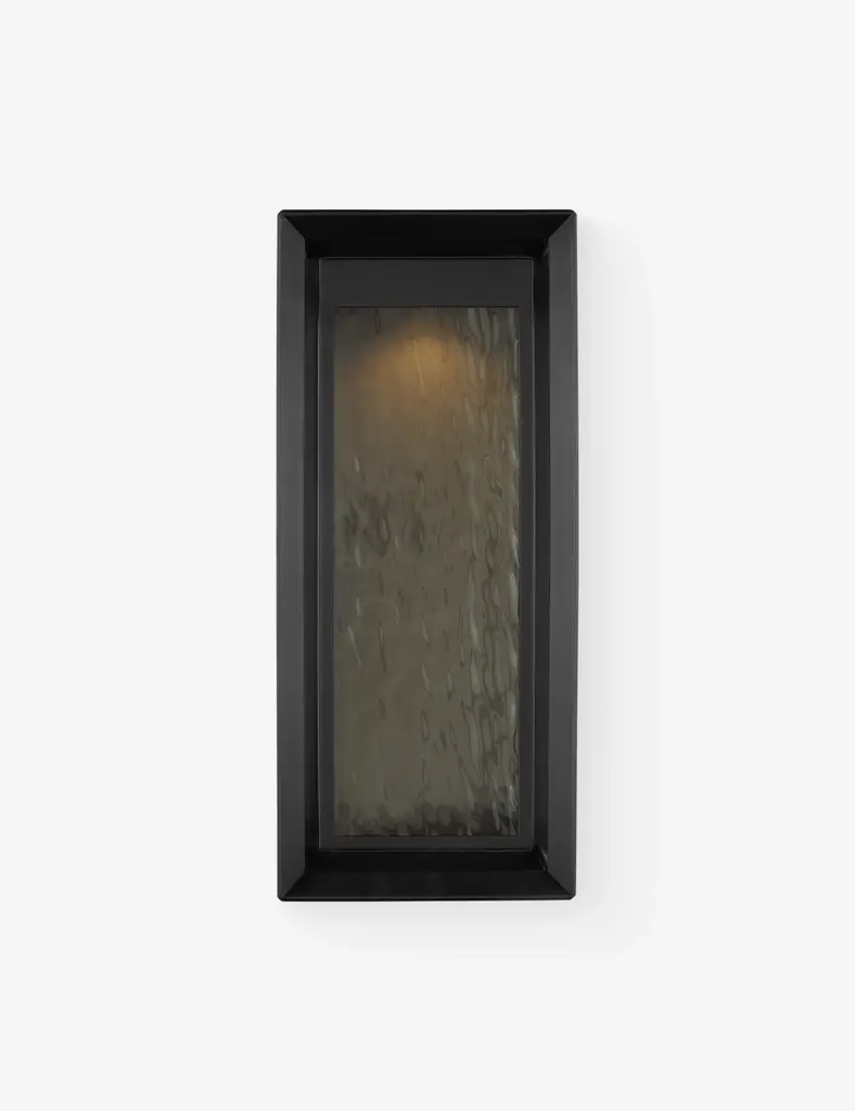 This outdoor lantern brings a modern edge to a timeless box lantern silhouette. Its layered metal frame is fitted with rippled glass panels, diffusing the light with a soft, inviting glow. Its clean lines and burnished finish strike the perfect balancebringing architectural interest with lasting elegance to your exterior.