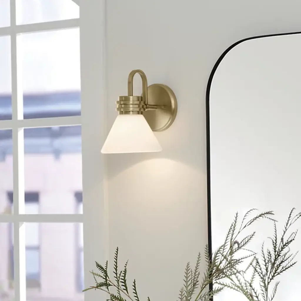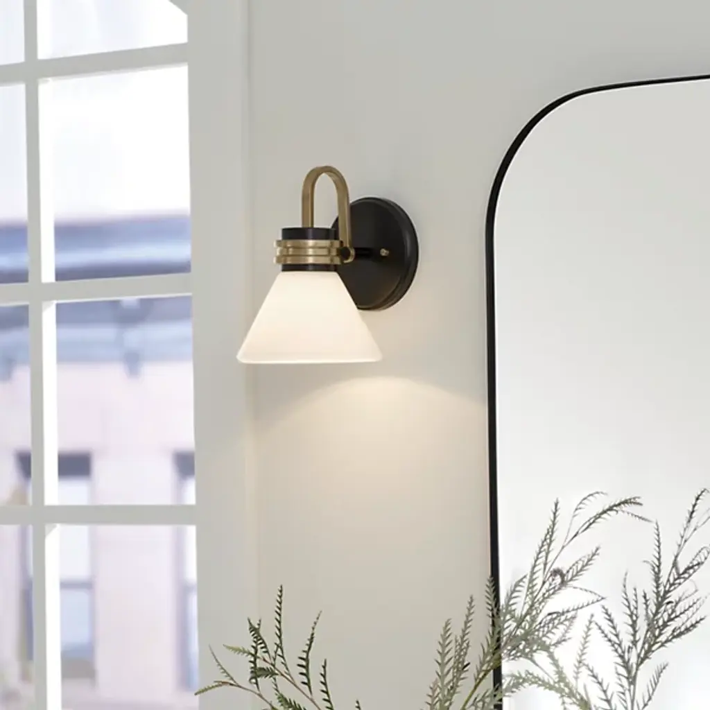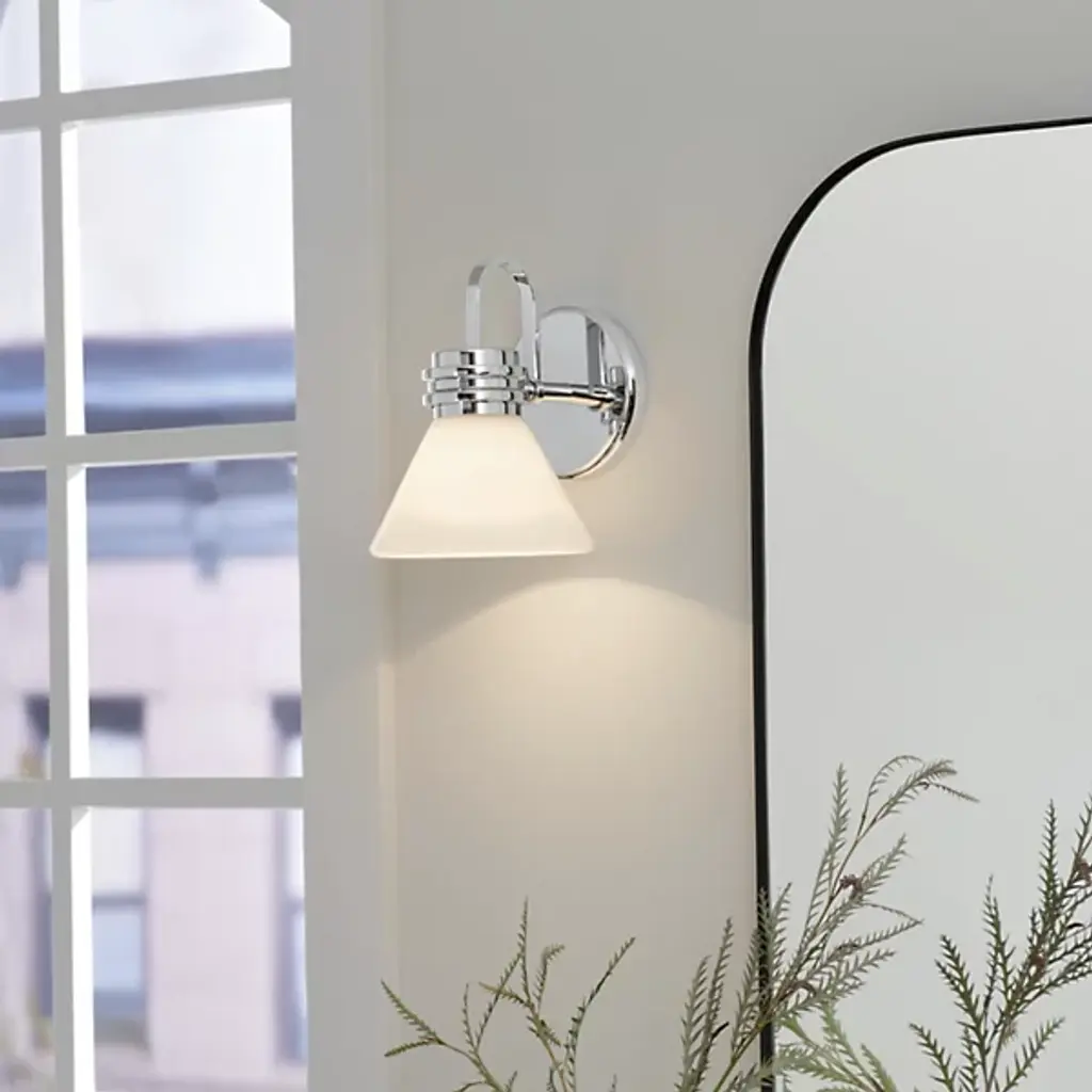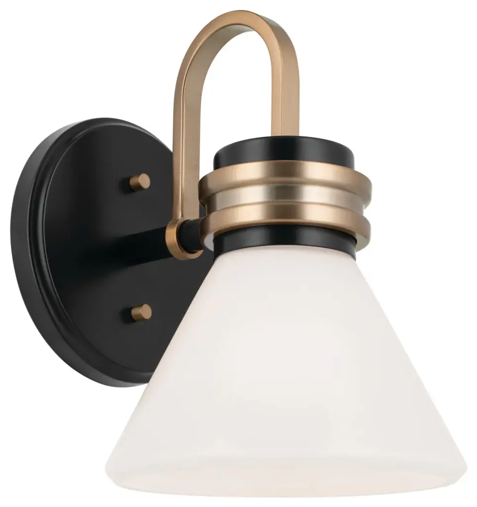 The Farum Wall Sconce by Kichler is a modern and stylish wall sconce that will add elegance to any room. This piece features a clean and simple design with a stepped frame and an opal glass shade. Its clean frame showcases subtle stepped detailing, and its Opal glass wonderfully illuminates. It is also dimmable so that you can create the perfect mood for any occasion. Ideal for a bedroom, bathroom, home office, or reading nook.