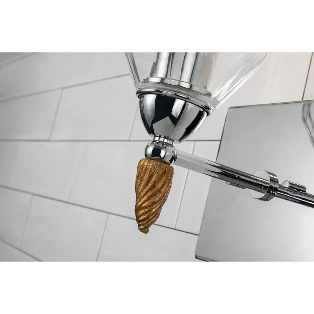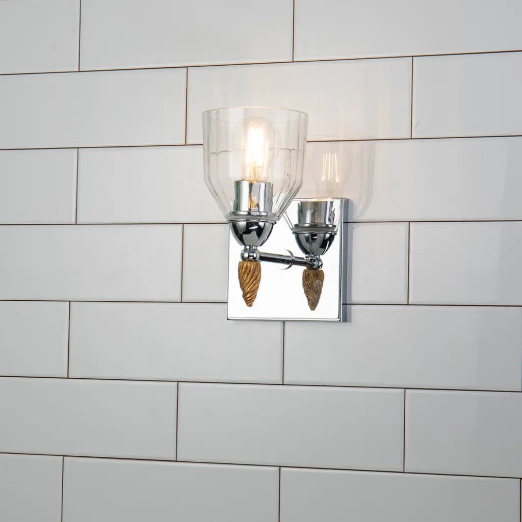 Drawing inspiration from a classic design, this silver and gold 1-light vanity wall sconce is the perfect pick for any contemporary or traditional space. This unique finial design showcases a simple, rectangular 5" square backplate, dome shaped glass shade, and a decorative unique acorn-shaped gold finial. Easily installed in pairs on either side of a mirror or art work, this one-light sconce is suitable for damp spaces, and is finished in a beautiful polished chrome.
