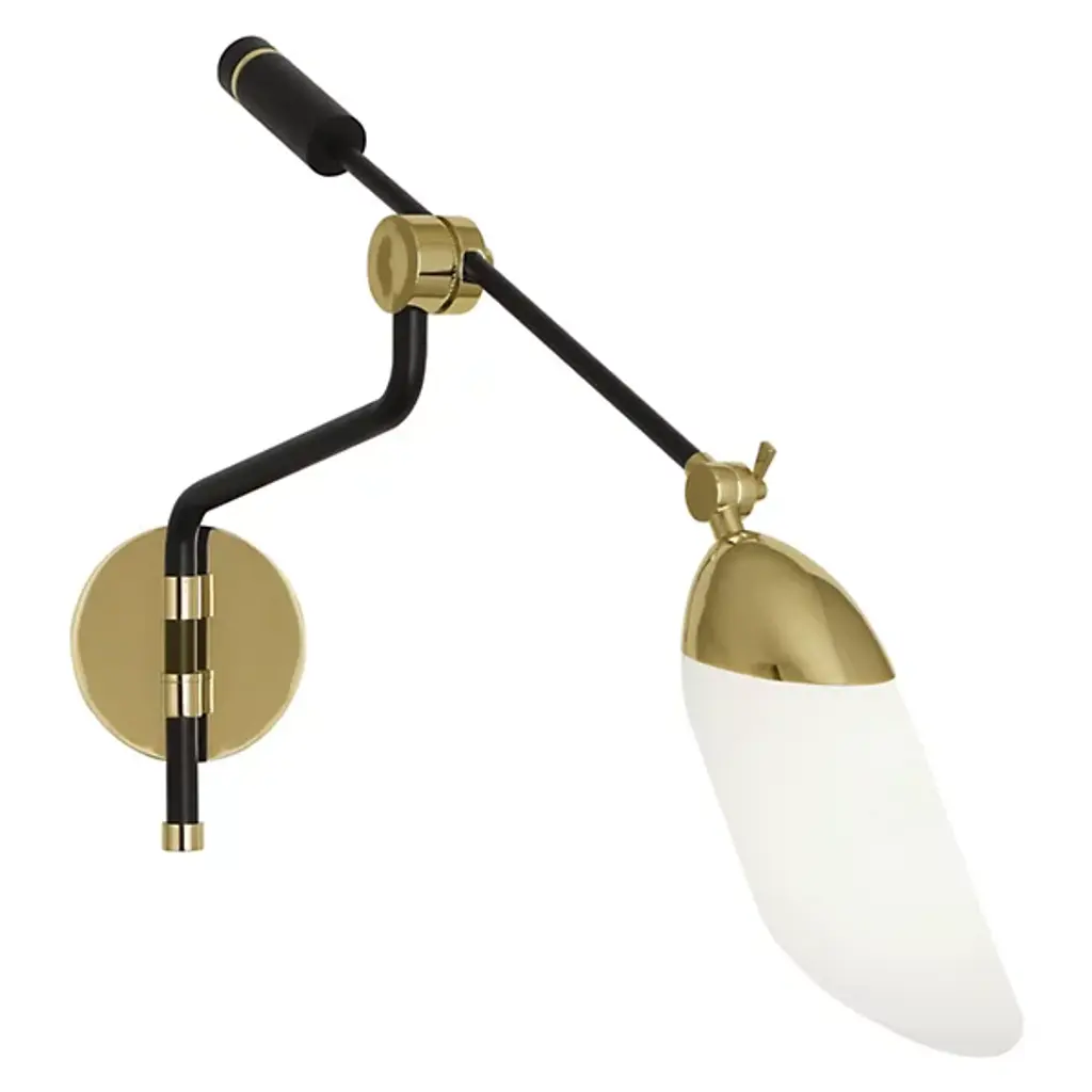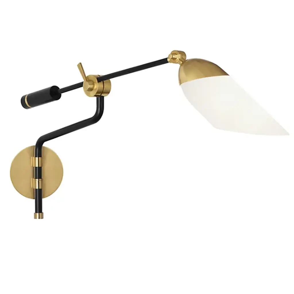 Add a graceful and elegant demonstration of modern lighting design to the walls in your home with the Ferdinand Wall Sconce from Robert Abbey. Smooth metal is beautifully accented by brass throughout, creating a tasteful and eye-catching silhouette. A flat, rounded wallplate gently holds the thin body as it gracefully curves, leading to an adjustable rod that contains a handle and sharply angled lampshade. A single bulb rests within the cased white glass shade, precisely directed as the room requires.