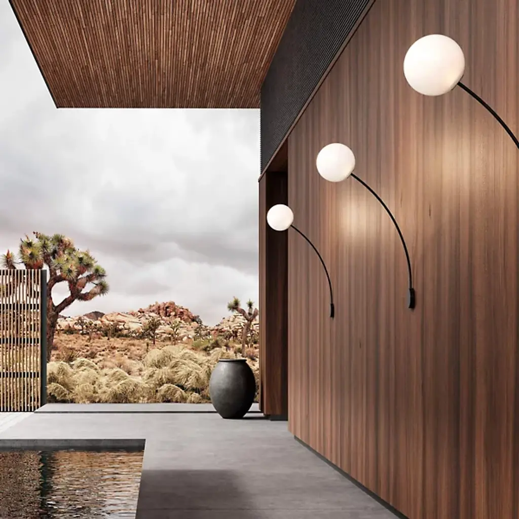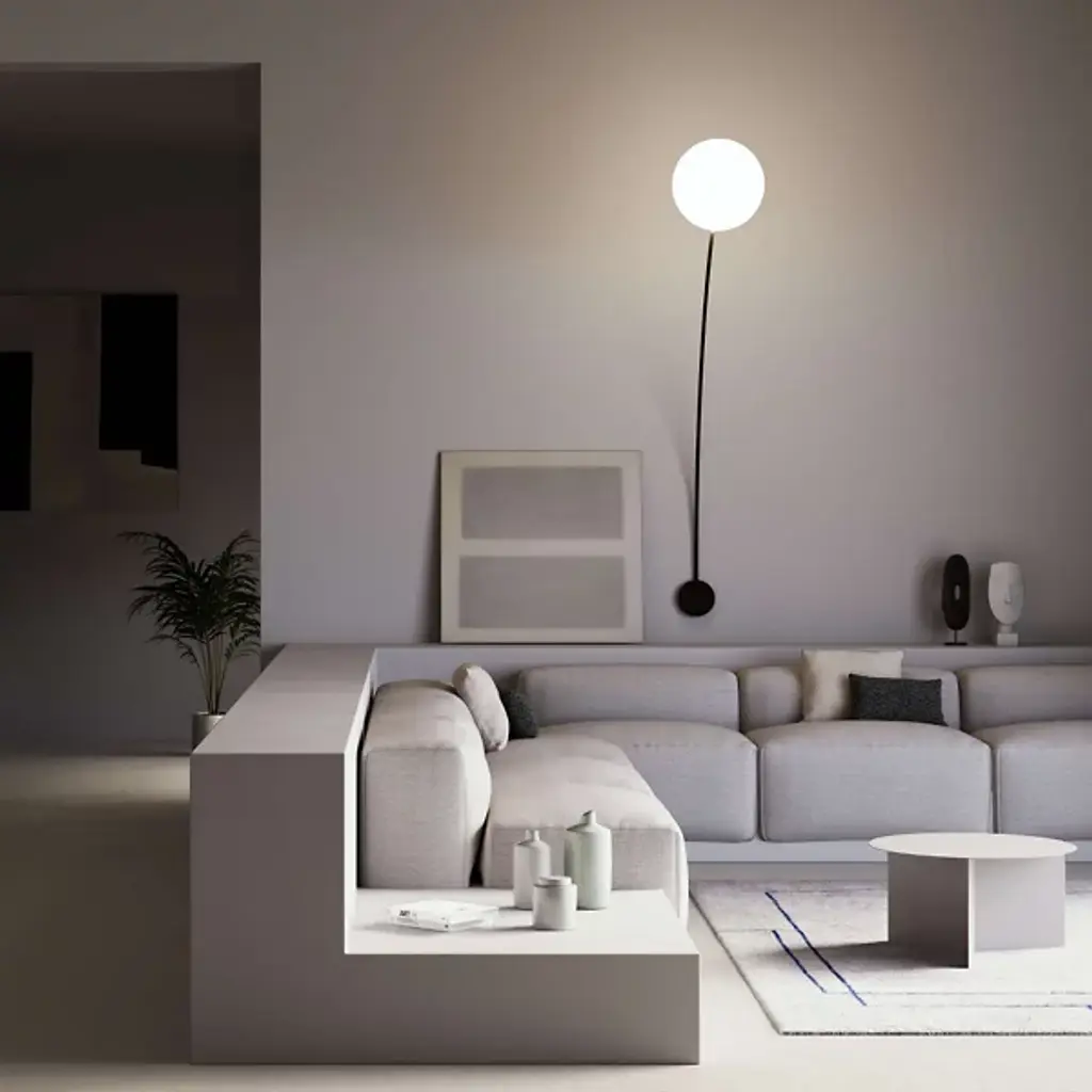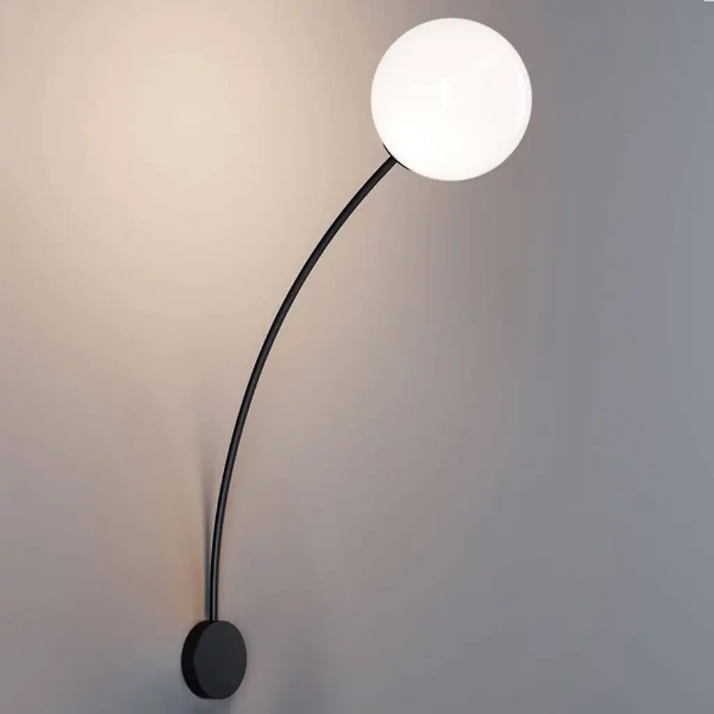 The Filo Wall Sconce from Italamp distills light from a pure geometric form. Designed by Defne Koz and made in Italy, the piece begins with a circular steel wall plate that anchors a slender, arcing arm. At its end, a white glass globe diffuser softens an inner light, spreading brightness into an even, welcoming glow. The globe seems to hover in balance with the curved metal frame, creating a composition that contrasts structure and light while maintaining a refined, contemporary character.