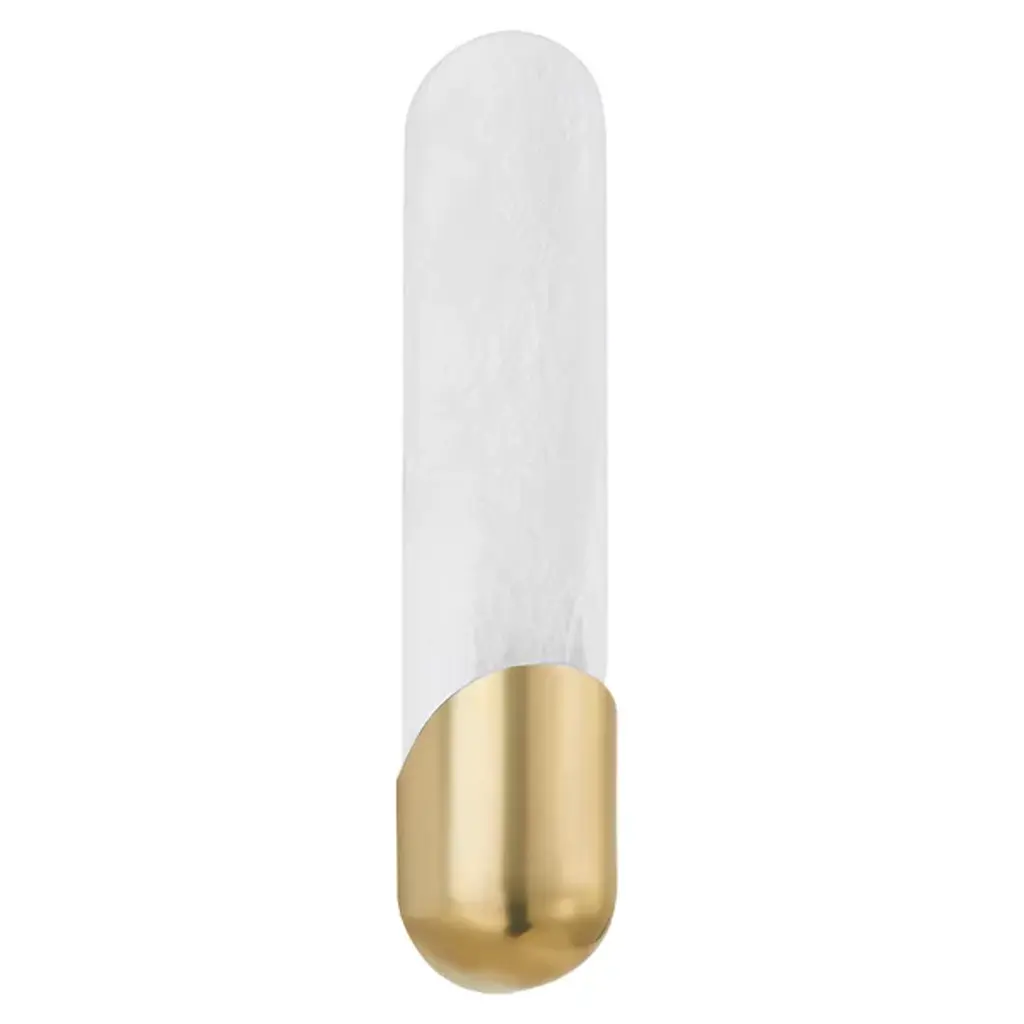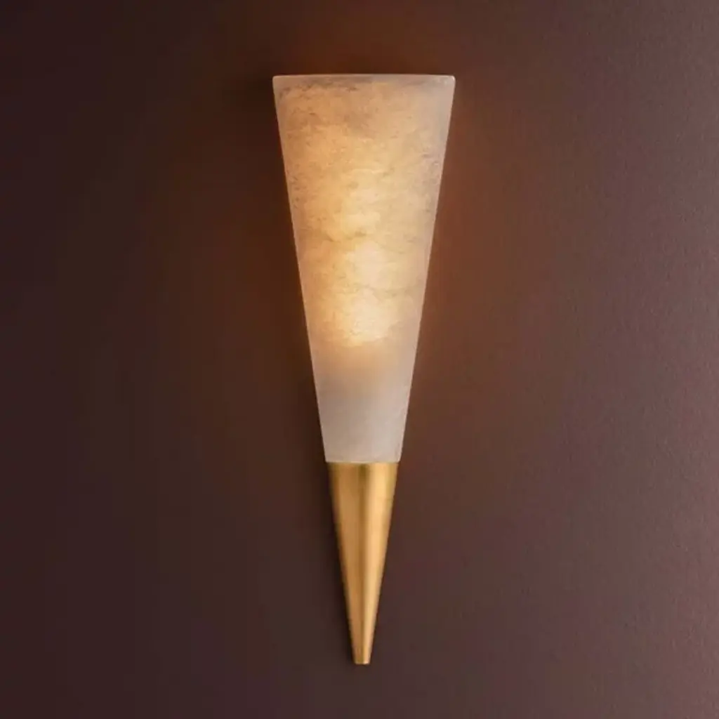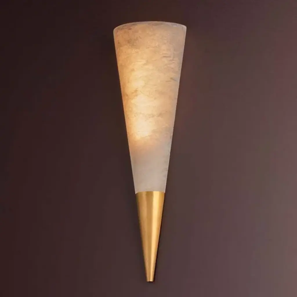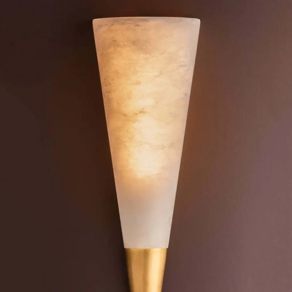 The Fion LED Wall Sconce from Corbett Lighting centers on a conical alabaster shade that appears to hover on the wall. The natural stone diffuser sits atop a minimal metal accent piece that conceals the mounting hardware. Light filtering through the alabaster reveals its unique veining patterns. The sconce's geometric profile and composed proportions make it an effective addition to both transitional and modern interiors. This fixture reveals how simple shapes and quality materials can create notable lighting solutions.
