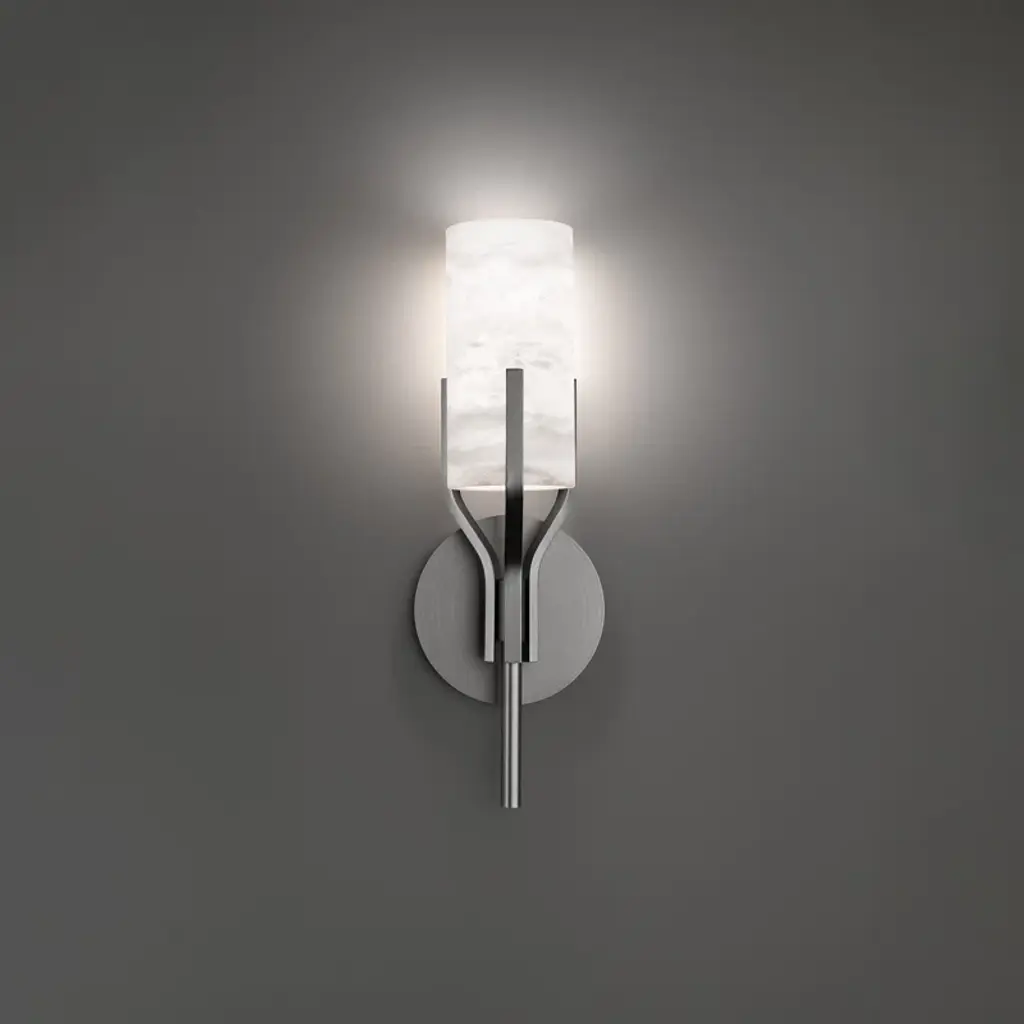 Simply stunning. A cylindrical shade of natural Spanish alabaster bracketed within slender arms showcases its translucent opulence while beautifully illuminating walls with an inviting glow.