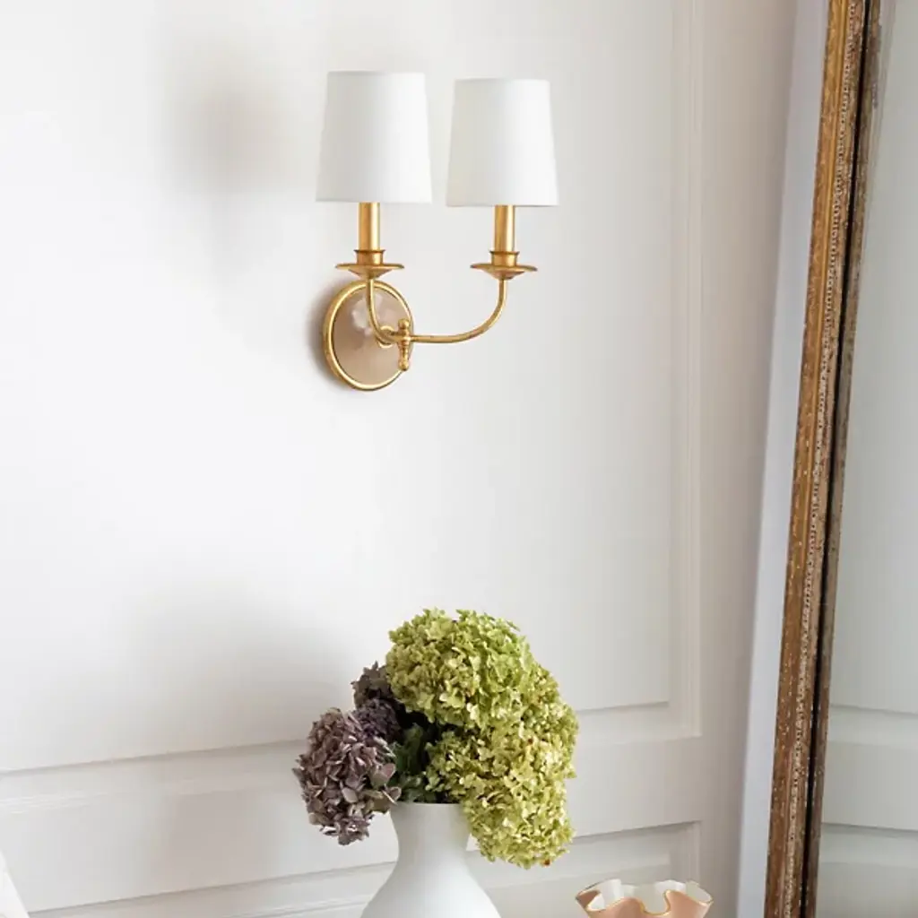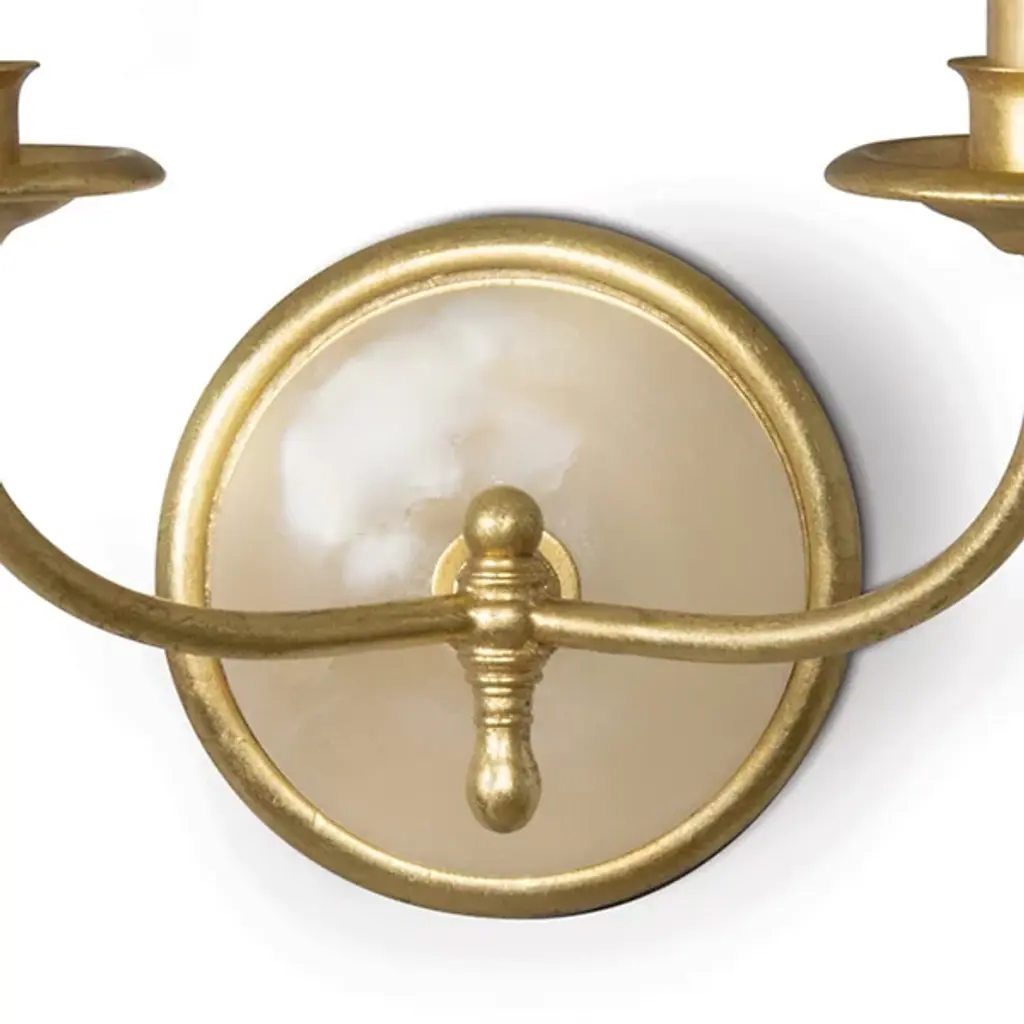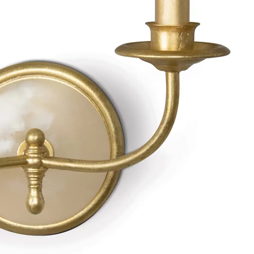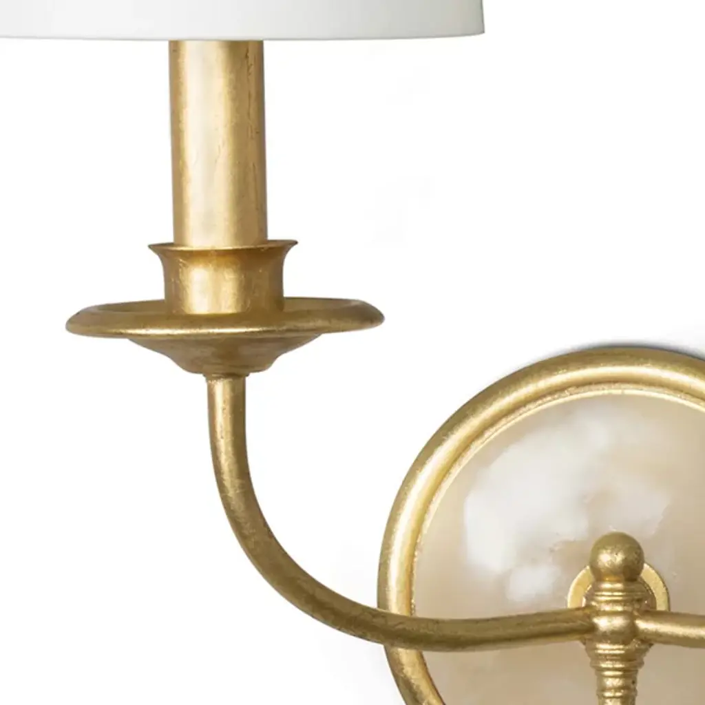 Presented by Regina Andrew, the Fisher Double Wall Sconce adds a touch of elegant style to your home. With a serene alabaster dome backplate finished in gold leaf, this fixture brings a level of sophistication to any decor. A natural linen shade completes the refined look atop a delicate candle cup and long, decorative stem. Place the Fisher Sconce in a bathroom, entryway, or on either side of a bed for gentle, gilded illumination.