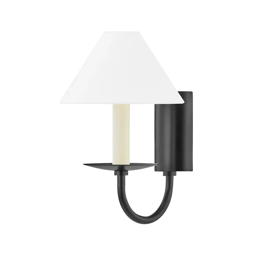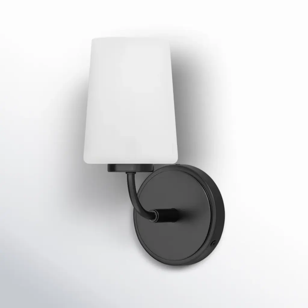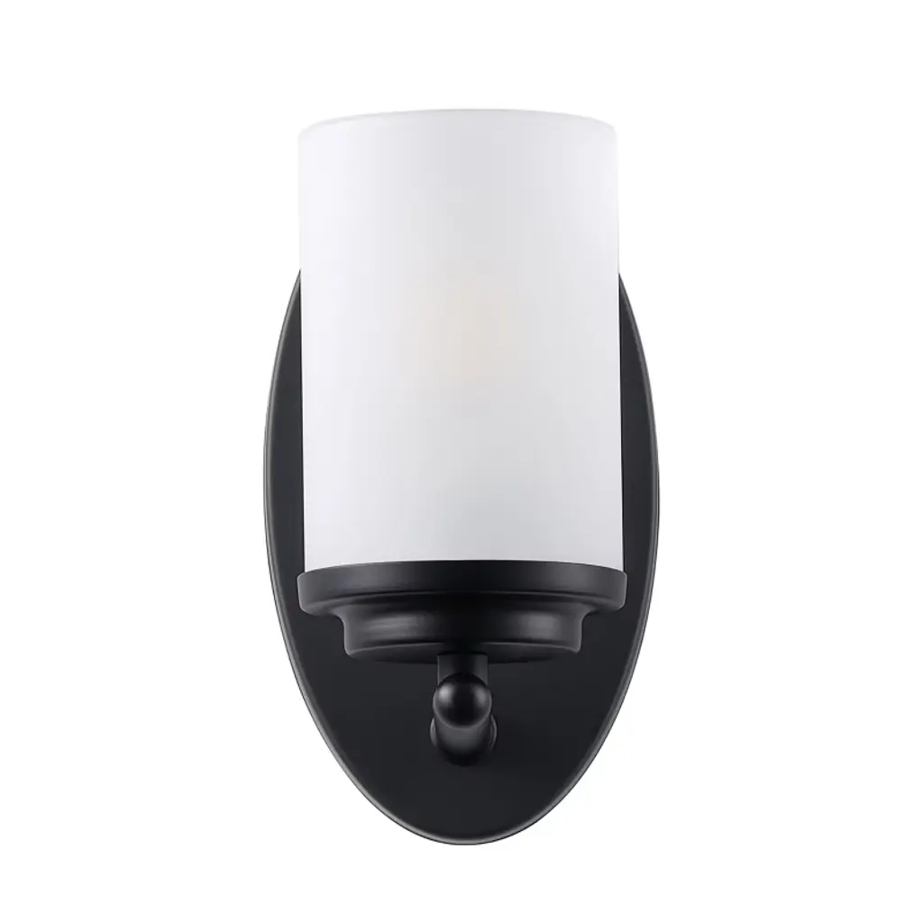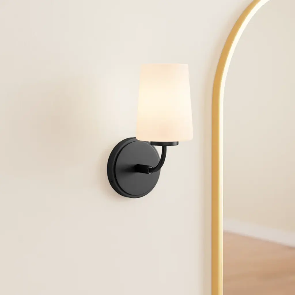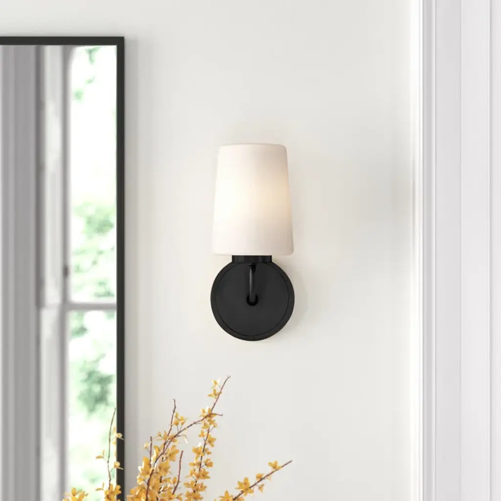 This sconce has a minimalist, pared-down silhouette that still manages to be super sleek. It's made from metal and mounted on a circular backplate with a thin, curved support arm. An etched opal glass shade completes the look as it filters light from a 100W bulb (sold separately). We especially love this vanity light for its versatility: In addition to being easy to pair with almost anything, it's compatible with dimmer switches and safe to use in damp locations.