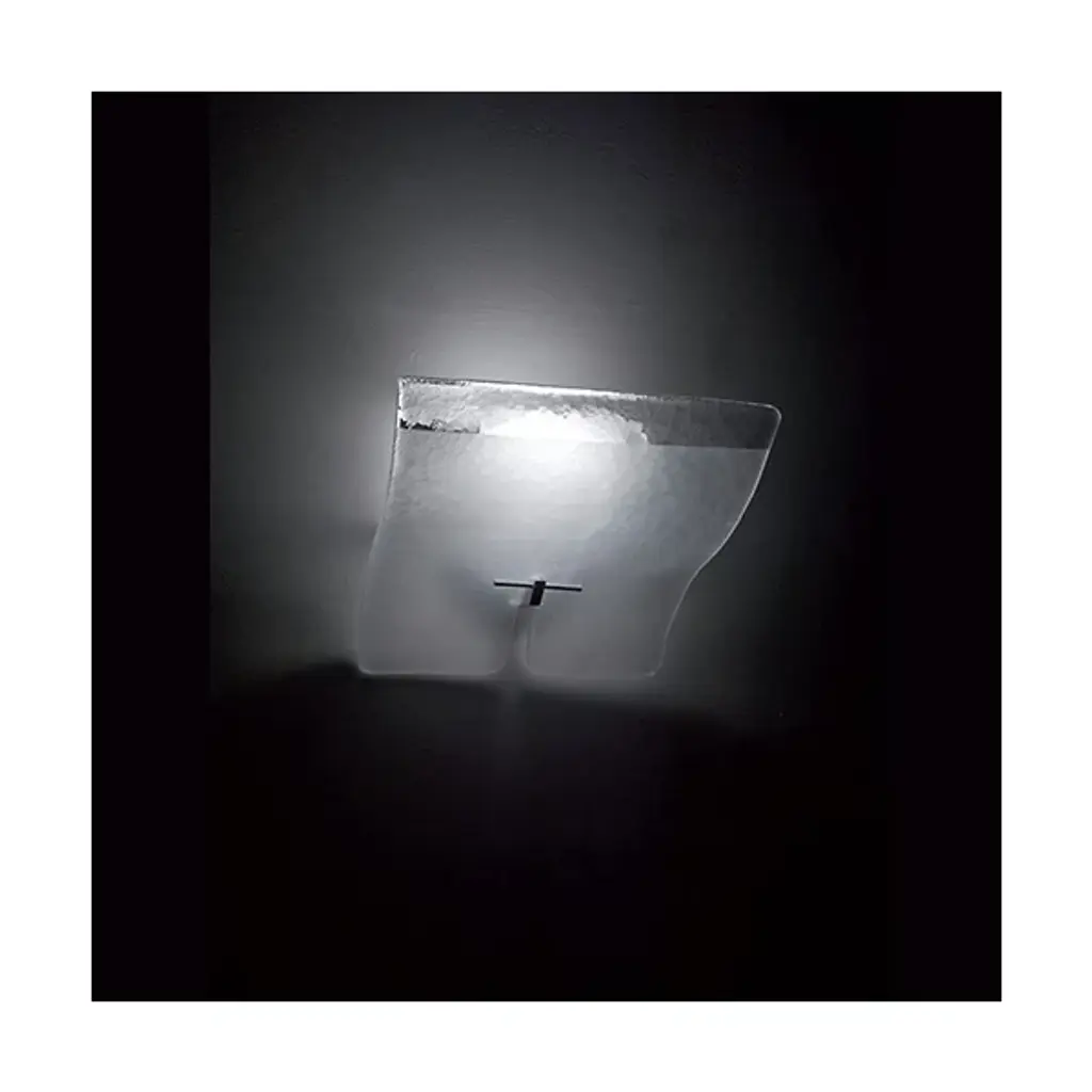A sculptural, floating visual drawing inspiration from an airplane’s dynamic wing. Soar into a sophisticated ambiance with the handcrafted glass filtered glow of the Flap Wall Sconce from Mazzega 1946. Created by the designers at Mazzega, the piece represents the company’s imaginative contemporary approach to highlighting the Murano glass-making tradition. The sconce shows this contemporary aesthetic through its focus on pure, beautiful shape. It starts by mounting to the wall with a hidden backplate. A metal holder presents itself at the front as a sleek accent lifting the glass. The wavy glass shade angles upwards like an airplane’s wing when descending. The shade pleases the eye as it shields it from frontal glare through its stylish clear and frosted combo. When turned on, clean light glazes the glass and the back wall as an opulent ambient glow.