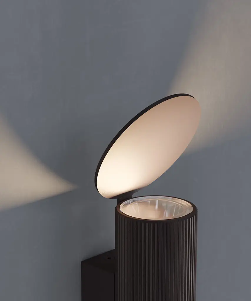 Inspired by the shapes of organs and flutes, Flauta's dual spotlights stand out thanks to a small circular reflector that captures and reverberates the light emitted. The cylindrical body is characterized by the surface etching in two refined variations: Flauta Riga, with vertical lines, and Flauta Spiga, characterized by an elegant and sophisticated herringbone pattern. The wall sconces come in three different heights, two surface textures, and a total of nine finishes, providing various personalization possibilities. The Flauta collection meets a desire for the creation of an adaptable, changing project, ideal for contract or residential environments, both indoor and outdoor." - Patricia Urquiola Please note that all fixtures include a circular backplate, not always shown in the images. This authentic design is produced in Italy exclusively by Flos.