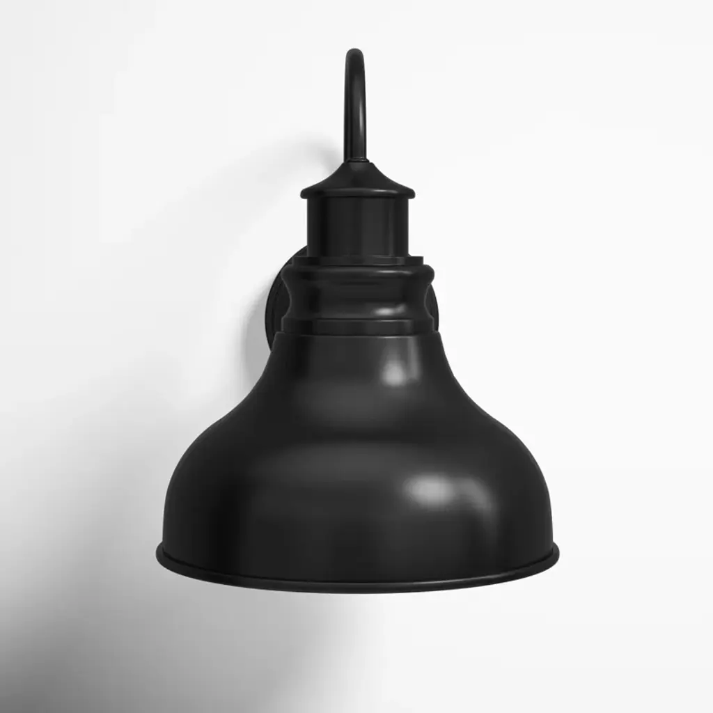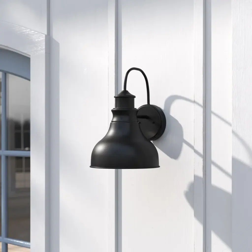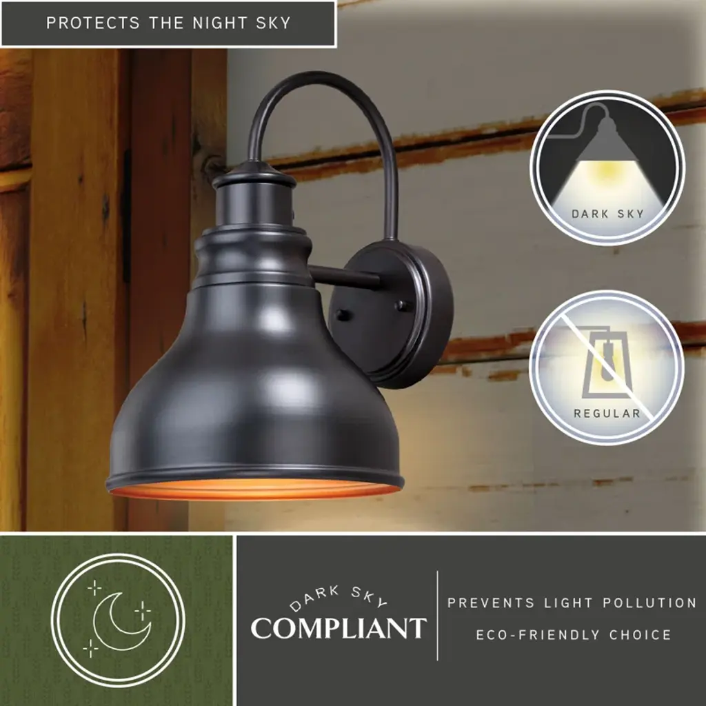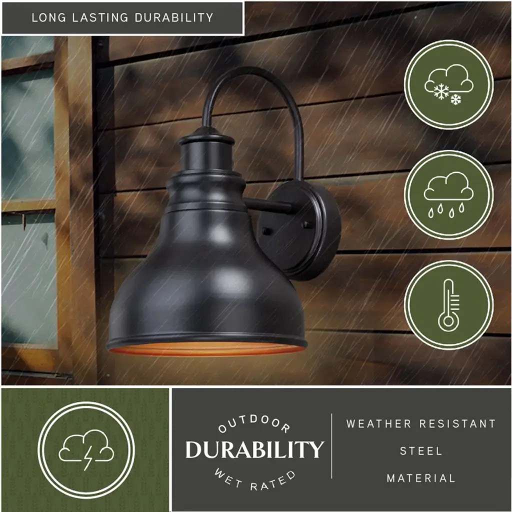 This outdoor barn light is a versatile style that's just right for lighting your morning coffee and alfresco dinners. It's crafted with a steel bell shade and arched arm in a rustic, oil-burnished bronze finish, with a copper-colored interior that catches the light from inside. Its hardwired design holds up to dampness, so it's just right for your covered porch. This 1-light outdoor wall lantern takes a single standard bulb up to 100W (sold separately). Plus, it's dimmable, so you can set just the right lighting level for any time of day.