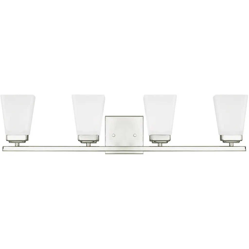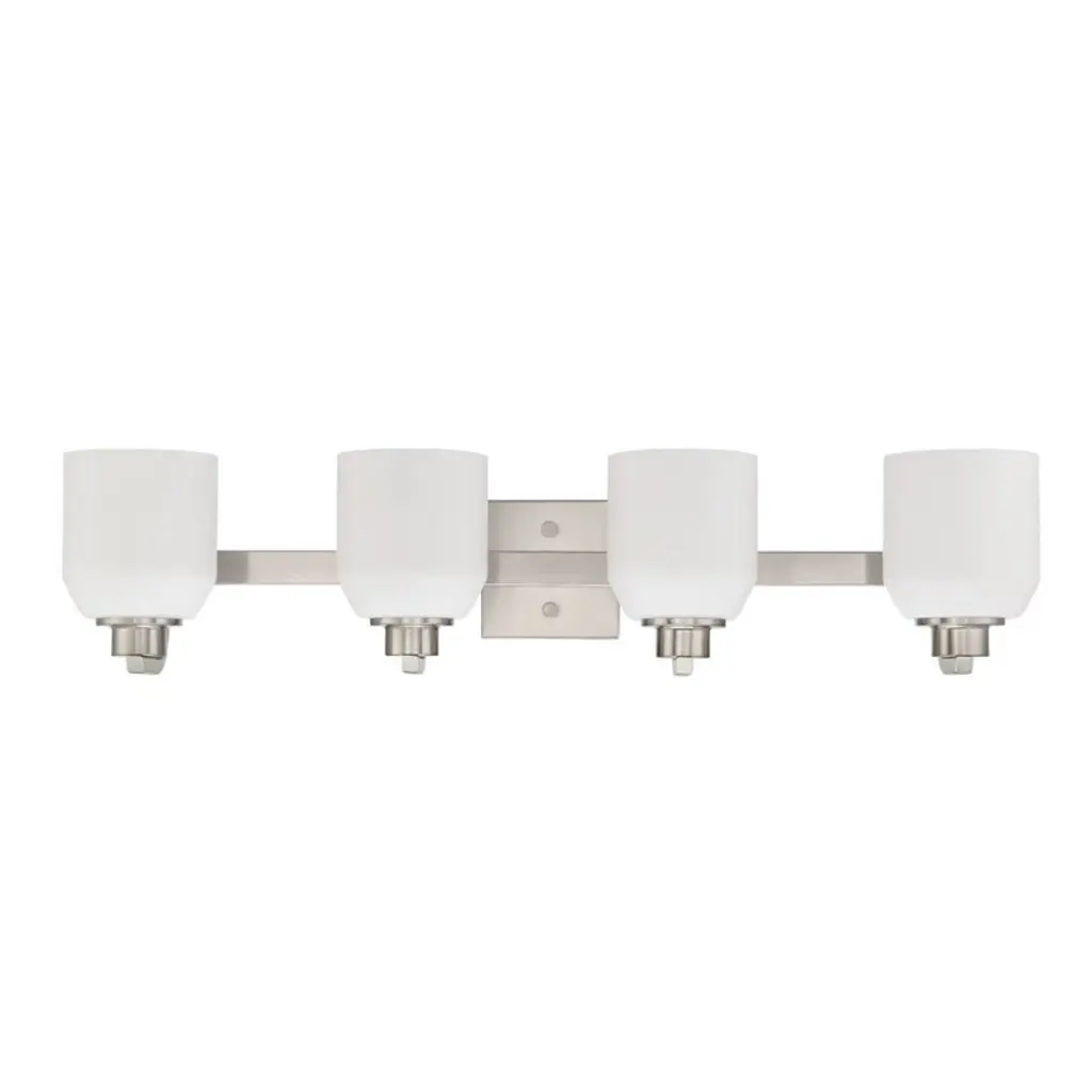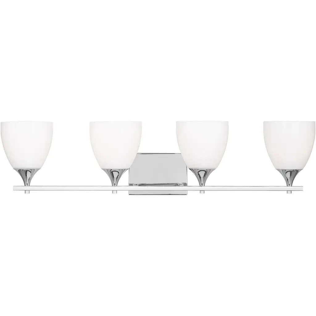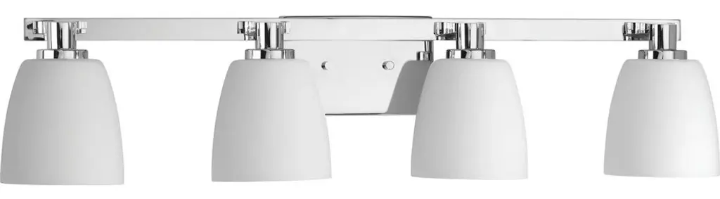 The four-light bath fixture emulates European faucet designs. Fleet is compromised of a distinct die cast arm and cup and highlighted by etched opal glass.Collection: FleetLighting Specifications: Wattage: 100 WNumber of Bulbs Required: 4Bulbs Included: NoLamp Type: IncandescentSocket Base: MediumDamp Location ListedWire Length: 6 in1 year warranty