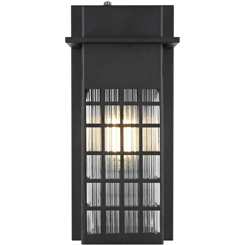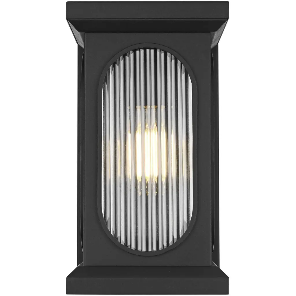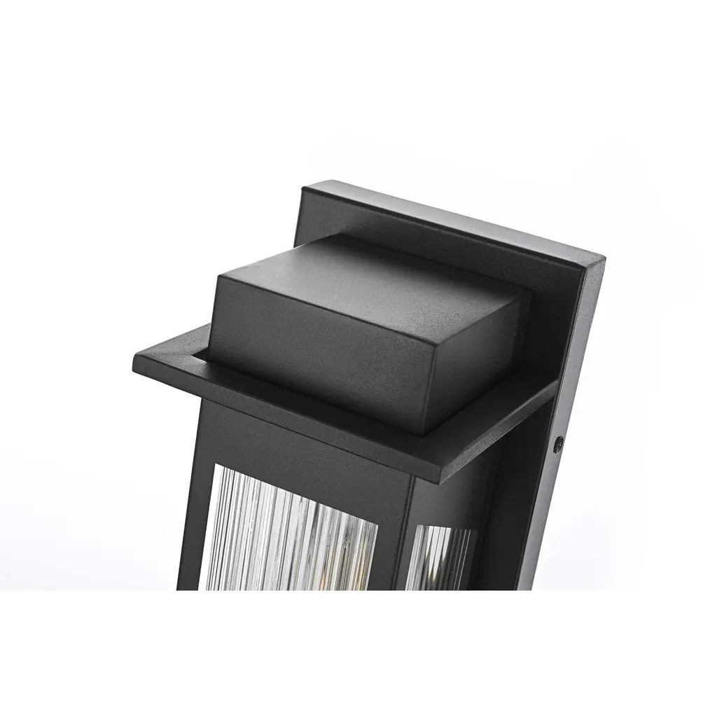Bring a refined touch to your outdoor spaces with this modern wall sconce, thoughtfully designed to enhance any exterior setting. Constructed from robust iron, this wall sconce features a unique combination of fluted glass that culminates in a sophisticated metal ring trim, and a structured top composed of thick bold square top. The slim, extended backplate offers clean lines that perfectly complement the architectural elements of the fixture. The E26 socket accommodates various bulb types, letting you create your ideal level of lighting. Whether you want to brighten an entryway or add a decorative touch to a garden path, this sconce merges durability and striking style for an ideal outdoor lighting solution.
