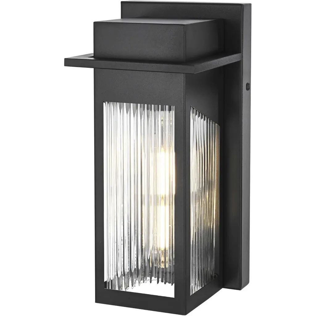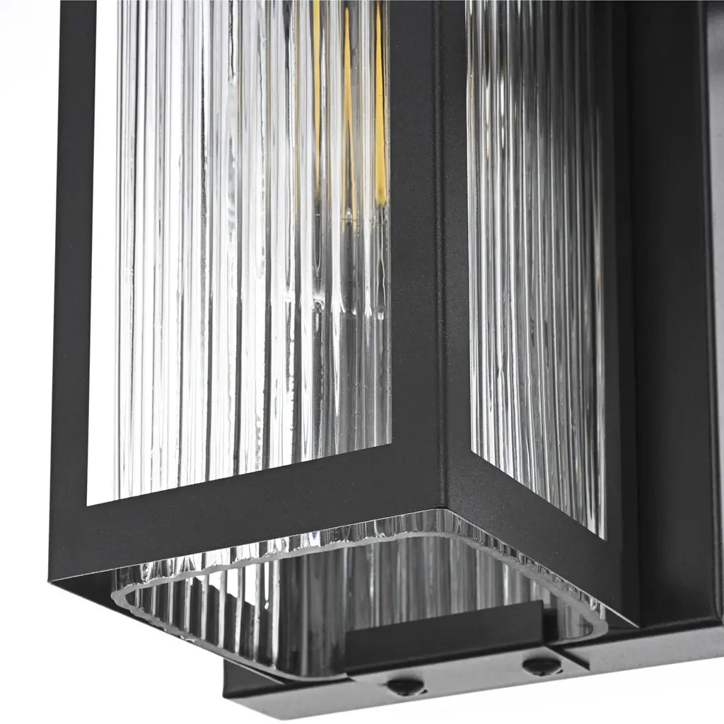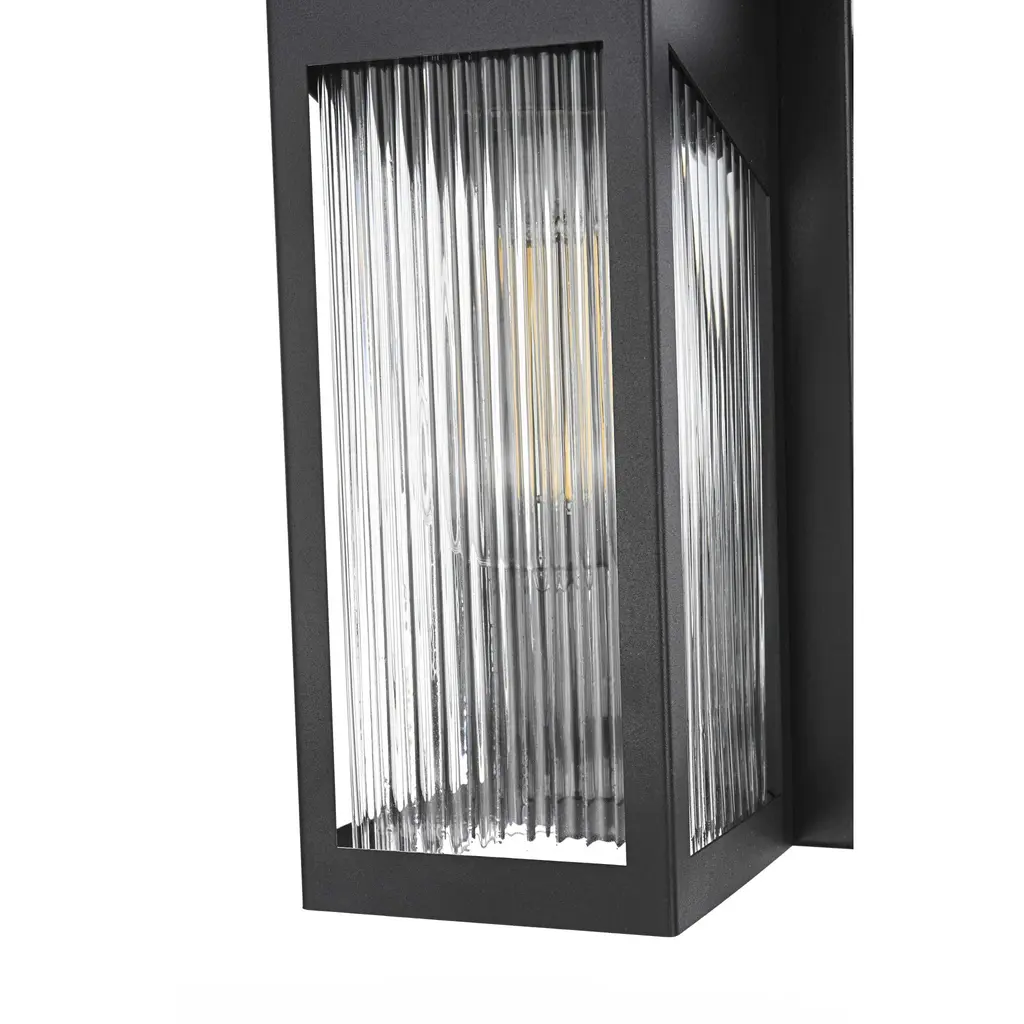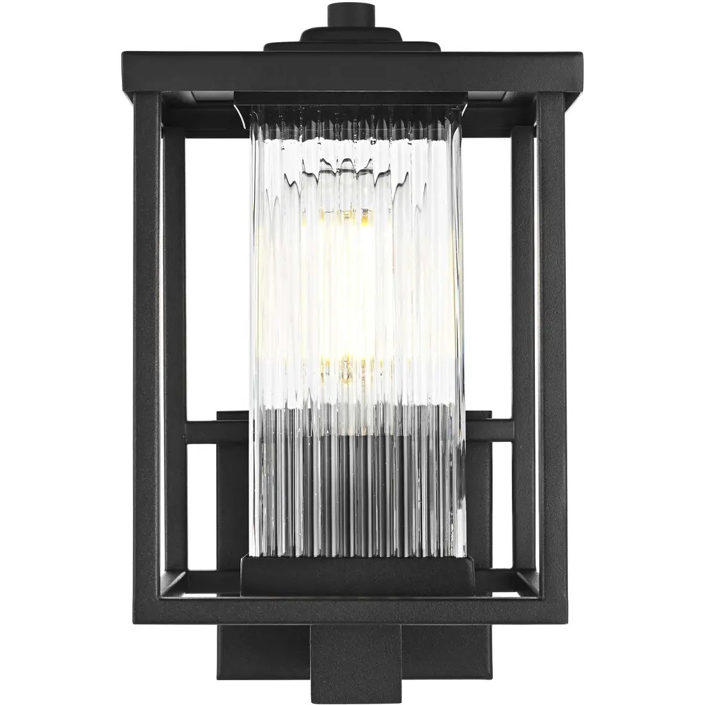 Bring a refined touch to your outdoor spaces with this modern wall sconce, thoughtfully designed to enhance any exterior setting. Constructed from robust iron, this wall sconce features a unique combination of fluted glass that culminates in a sophisticated metal ring trim, and a structured top composed of thick bold square top. The slim, extended backplate offers clean lines that perfectly complement the architectural elements of the fixture. The E26 socket accommodates various bulb types, letting you create your ideal level of lighting. Whether you want to brighten an entryway or add a decorative touch to a garden path, this sconce merges durability and striking style for an ideal outdoor lighting solution.