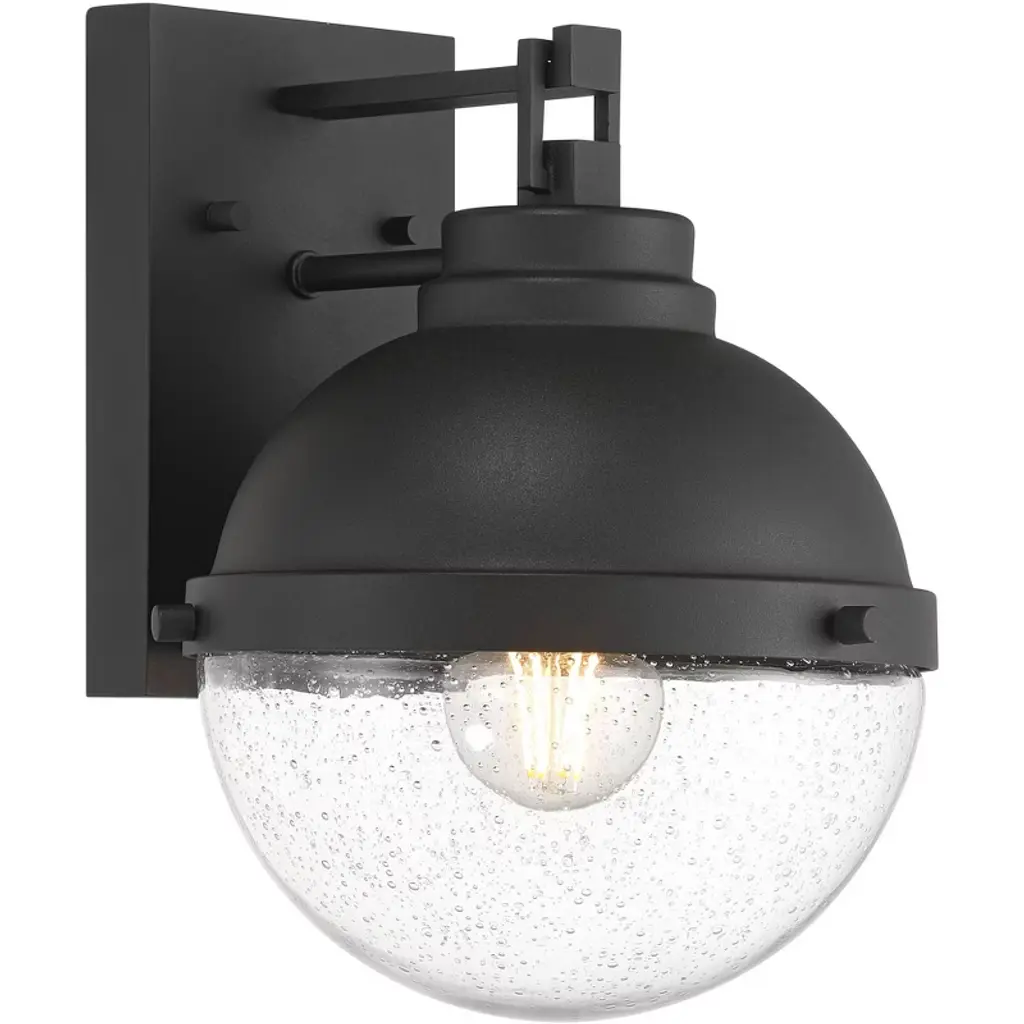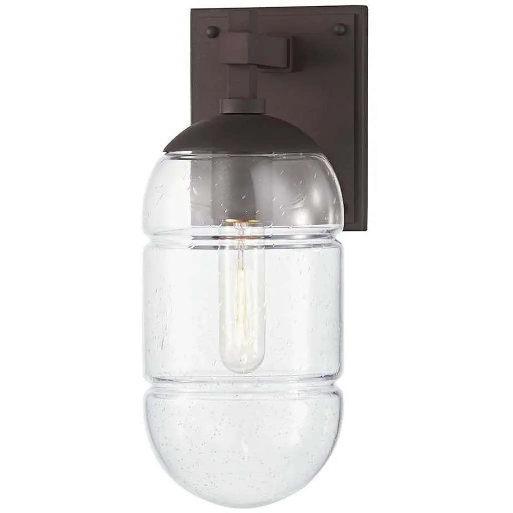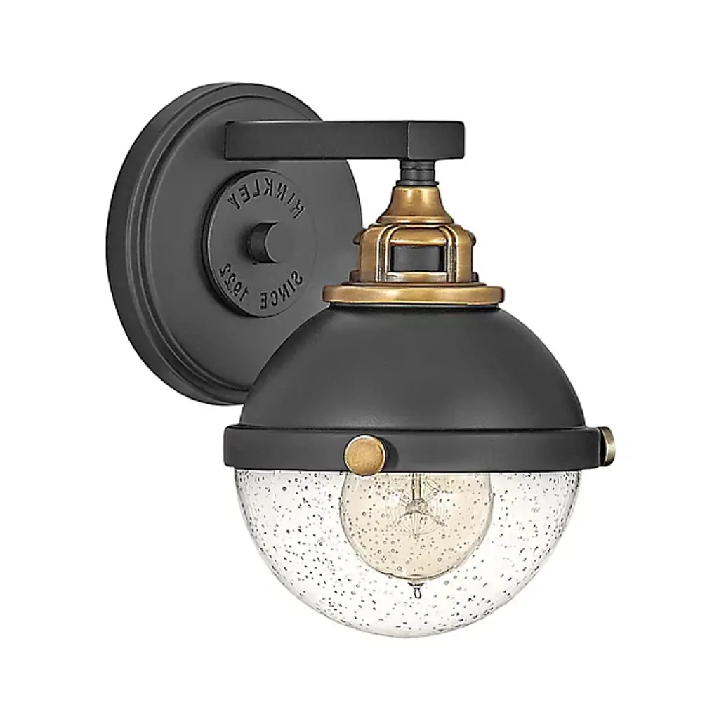 Relax under the industrial illumination of the Fletcher 5170 Wall Sconce by Hinkley Lighting. A sturdy, stepped-disc wall mount offers stability, while a rectangular arm held out from its upper end suspends the downward-facing socket which is set into a steel bowl housing. The lamping itself is damp-rated and sits under a rounded shade of clear seeded glass – just the material to moderate bright glare into a pleasant glow still bright enough to light the way.