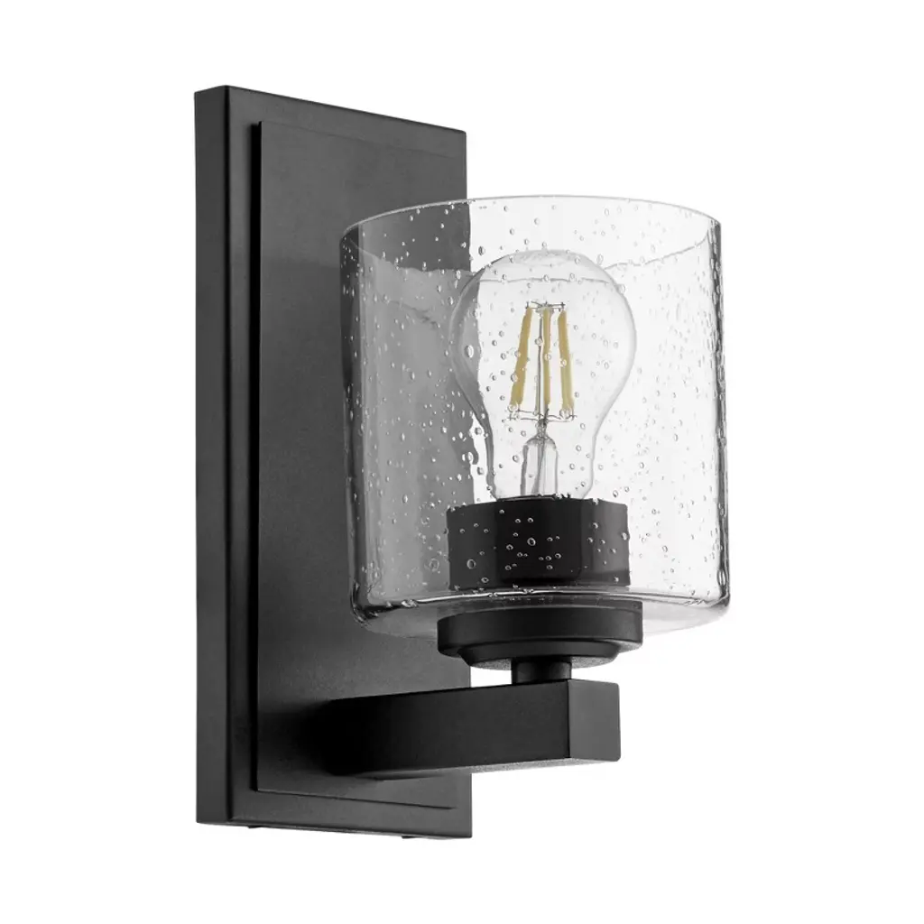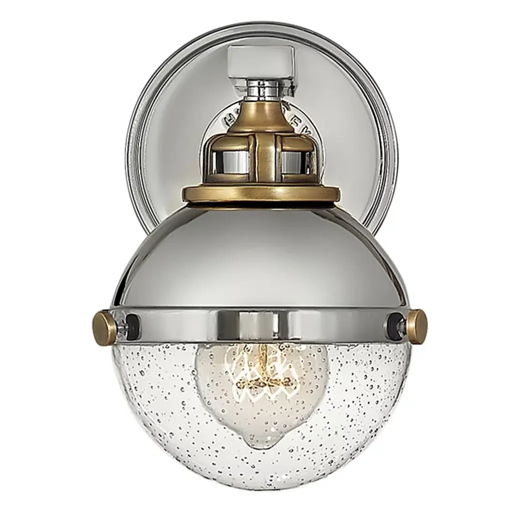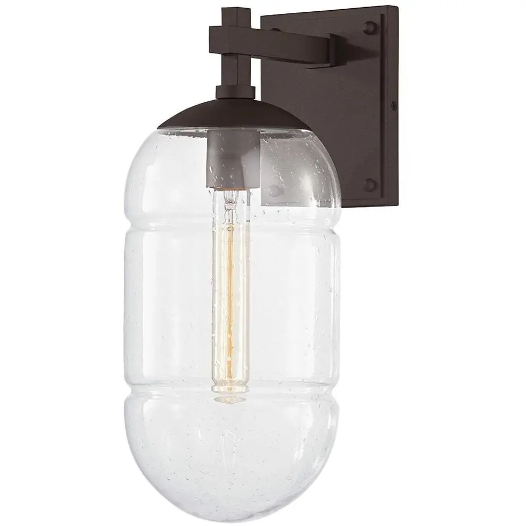 Relax under the industrial illumination of the Fletcher 5170 Wall Sconce by Hinkley Lighting. A sturdy, stepped-disc wall mount offers stability, while a rectangular arm held out from its upper end suspends the downward-facing socket which is set into a steel bowl housing. The lamping itself is damp-rated and sits under a rounded shade of clear seeded glass – just the material to moderate bright glare into a pleasant glow still bright enough to light the way.