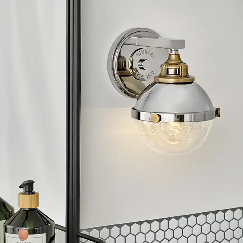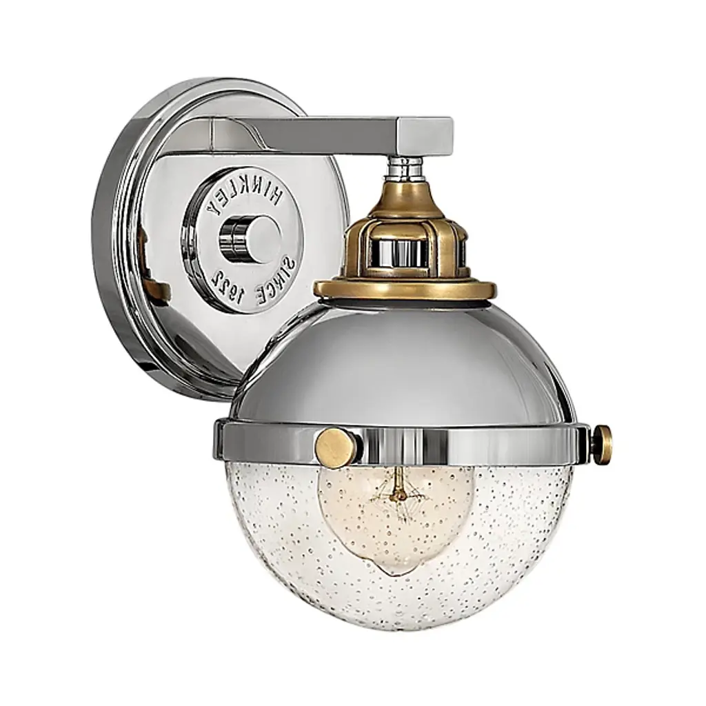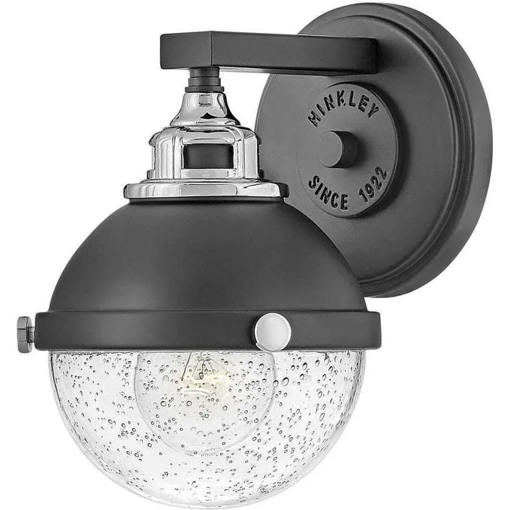 Relax under the industrial illumination of the Fletcher 5170 Wall Sconce by Hinkley Lighting. A sturdy, stepped-disc wall mount offers stability, while a rectangular arm held out from its upper end suspends the downward-facing socket which is set into a steel bowl housing. The lamping itself is damp-rated and sits under a rounded shade of clear seeded glass – just the material to moderate bright glare into a pleasant glow still bright enough to light the way.