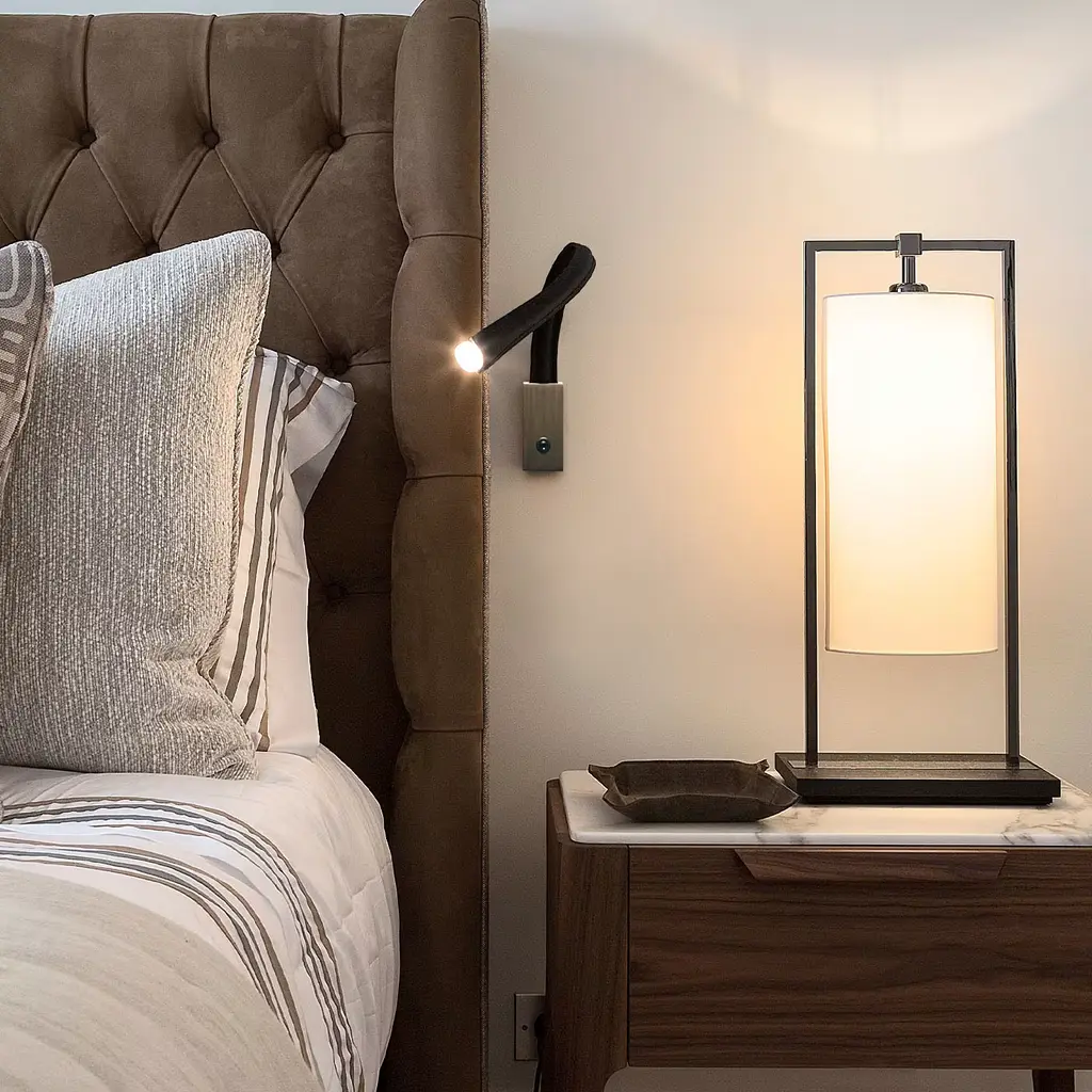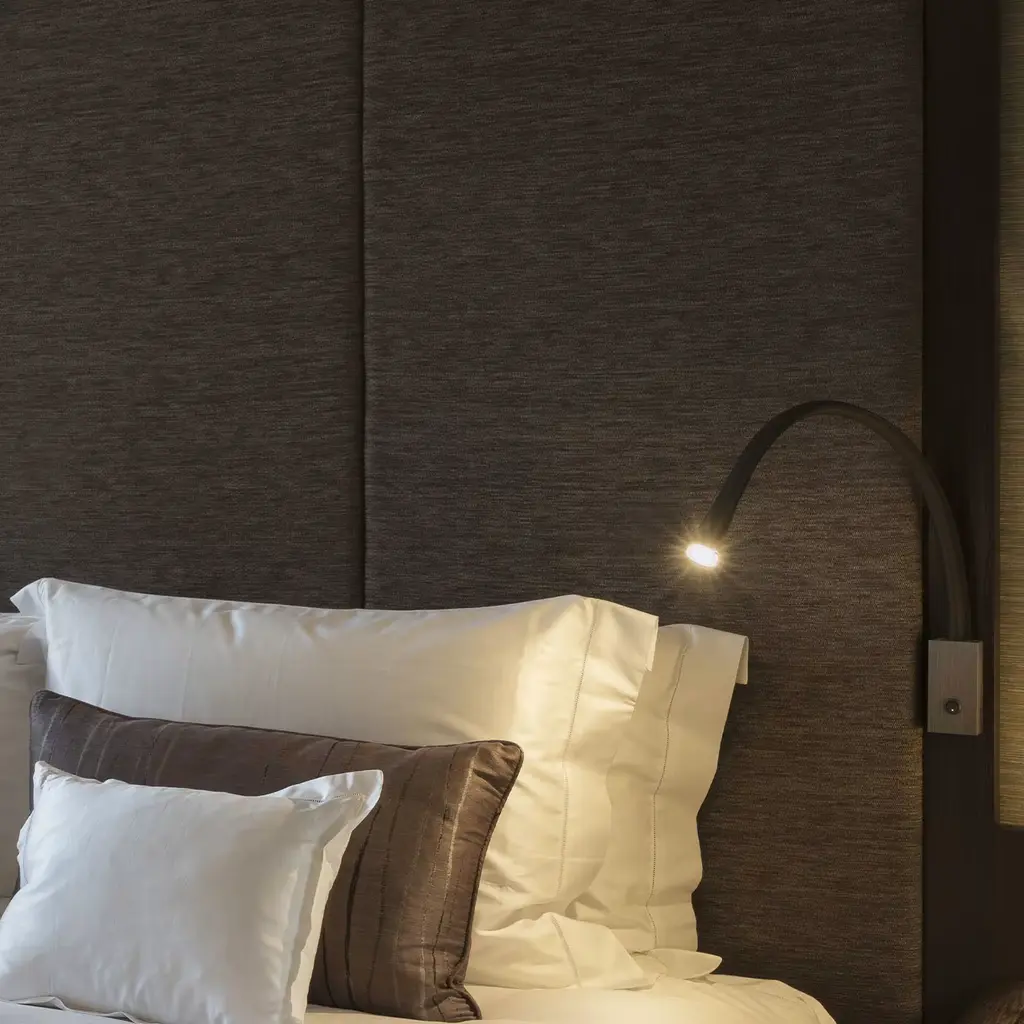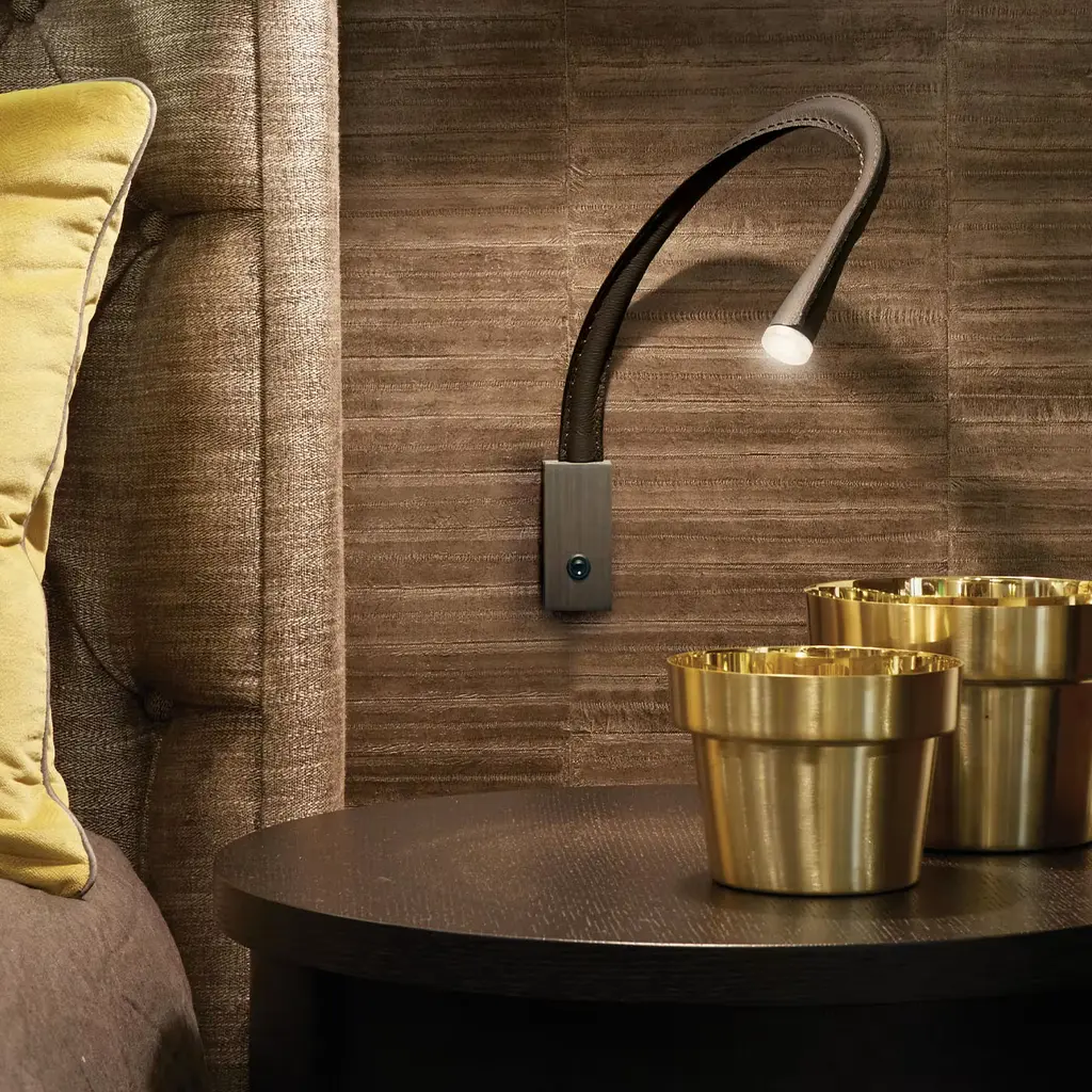 An iconic Contardi model, Flexiled is available in "STEEL" version and in "LEATHER" version: in the first one the flexible arm is covered with a braided steel mesh, then wrapped in a transparent sheath. In the second one it is covered by leather with double stitching on the sides. Flexiled is characterized by high-quality standards, starting with the use of a flexible brass arm (12 mm diameter), which guarantees solidity and absence of squeaking even after prolonged use. A high level of engineering and dissipation of the LED make sure that the temperature on the lamp head remains within the correct limits even after 24 hours of uninterrupted use. Easily "customizable" in leather colors, arm length and shape and the wall plate finish. Light source: 1 X 3W Custom LED Light. Contract and commercial certifications available upon request.
