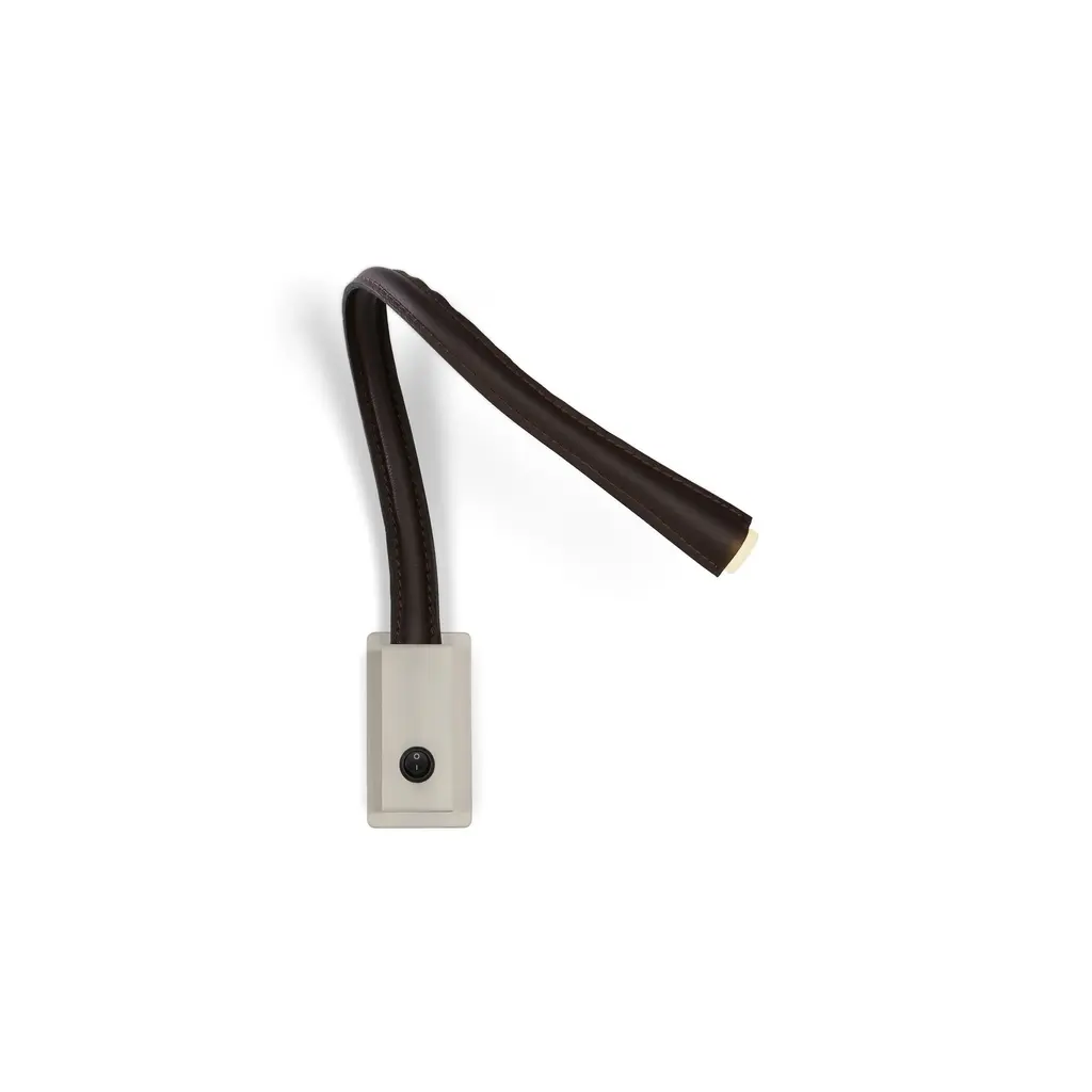 An iconic Contardi model, Flexiled is available in steel and leather versions. In the metal model, the flexible arm is covered with a woven steel mesh, then wrapped in a transparent sheath. The latter version is inserted into a leather sheath with double stitching on the sides. Flexiled is characterised by high quality standards, starting with the use of a flexible brass arm (12 mm diameter), which guarantees solidity and prevents squeaking, even after prolonged use. Advanced engineering and the efficiency of the LED ensure that the temperature on the lamp head remains within the correct limits, even after 24 hours of uninterrupted use. Flexiled is easily “customisable” with a choice of various leather colours, arm length and shape, and finish of the wall plate. Features