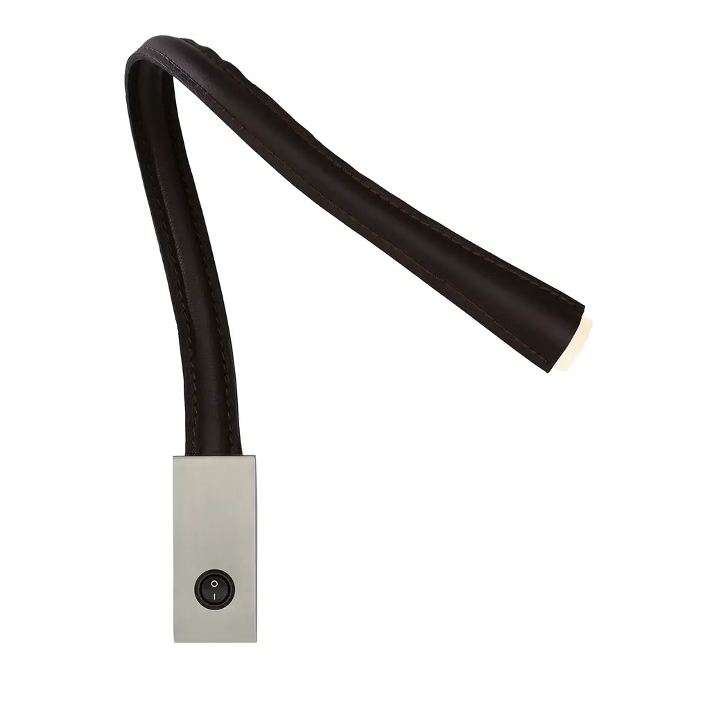 An iconic Contardi model, Flexiled is available in steel and leather versions. In the metal model, the flexible arm is covered with a woven steel mesh, then wrapped in a transparent sheath. The latter version is inserted into a leather sheath with double stitching on the sides. Flexiled is characterised by high quality standards, starting with the use of a flexible brass arm (12 mm diameter), which guarantees solidity and prevents squeaking, even after prolonged use. Advanced engineering and the efficiency of the LED ensure that the temperature on the lamp head remains within the correct limits, even after 24 hours of uninterrupted use. Flexiled is easily “customisable” with a choice of various leather colours, arm length and shape, and finish of the wall plate. Features