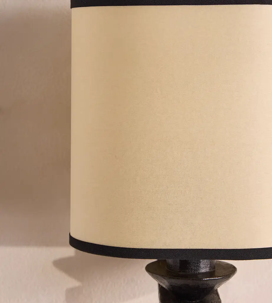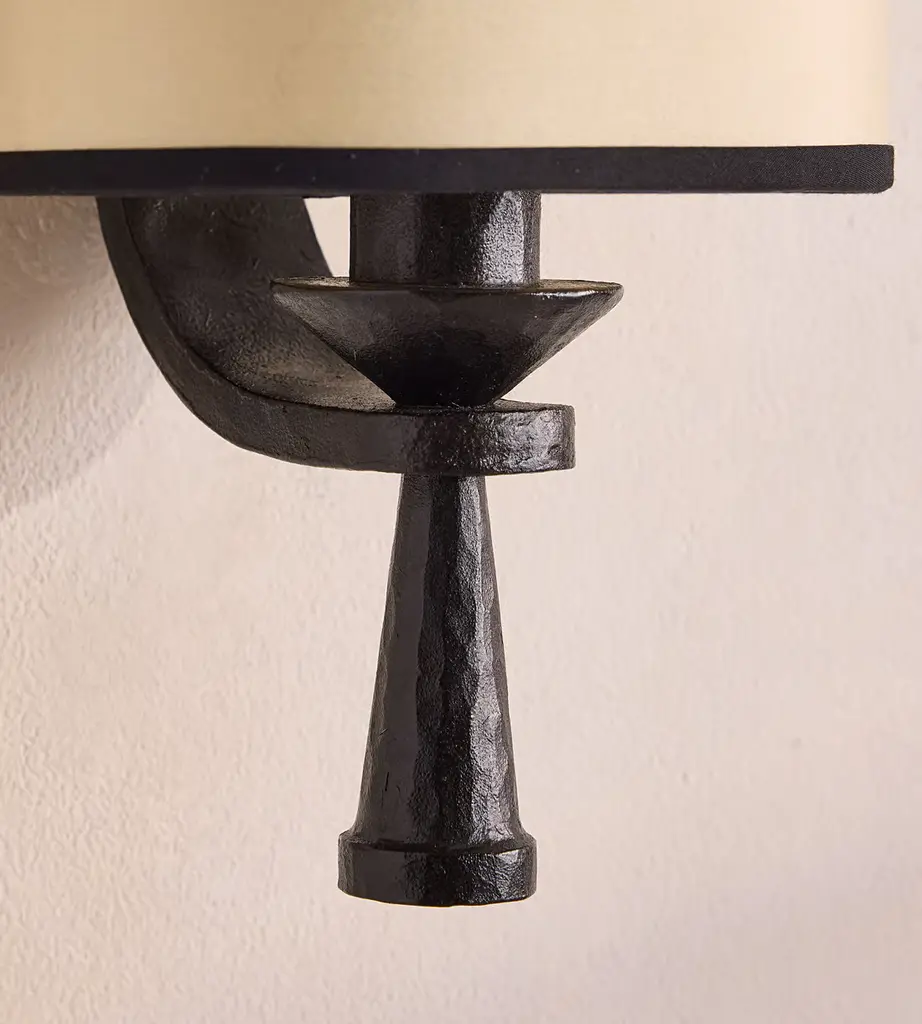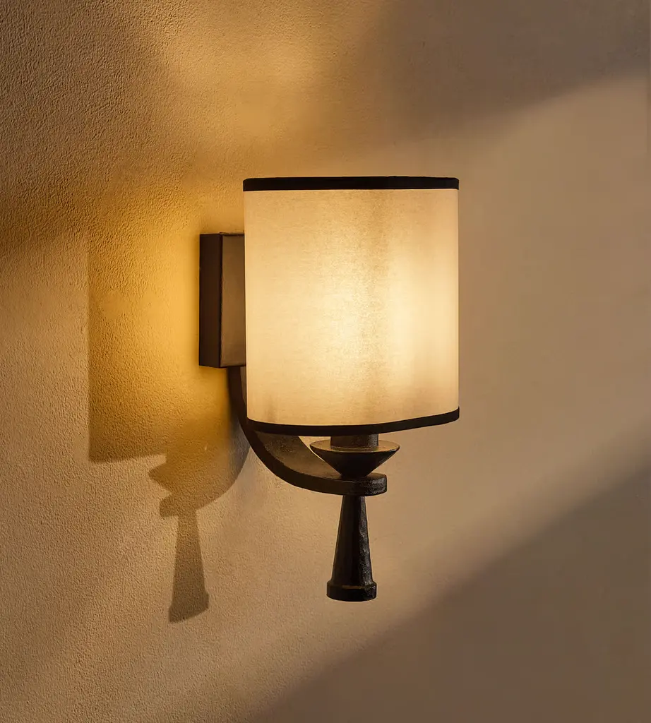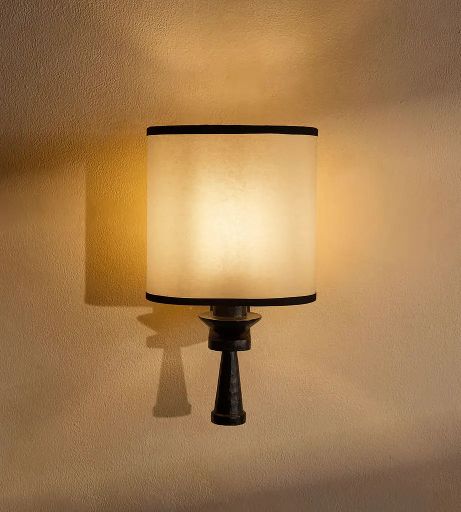 A curved, textured shade sits flush against the wall and is finished with contrasting leather detailing woven by hand. Our Flint wall light has a blackened brass frame treated to a subtly hammered finish, with a square backplate to help its curved shade sit against the wall.