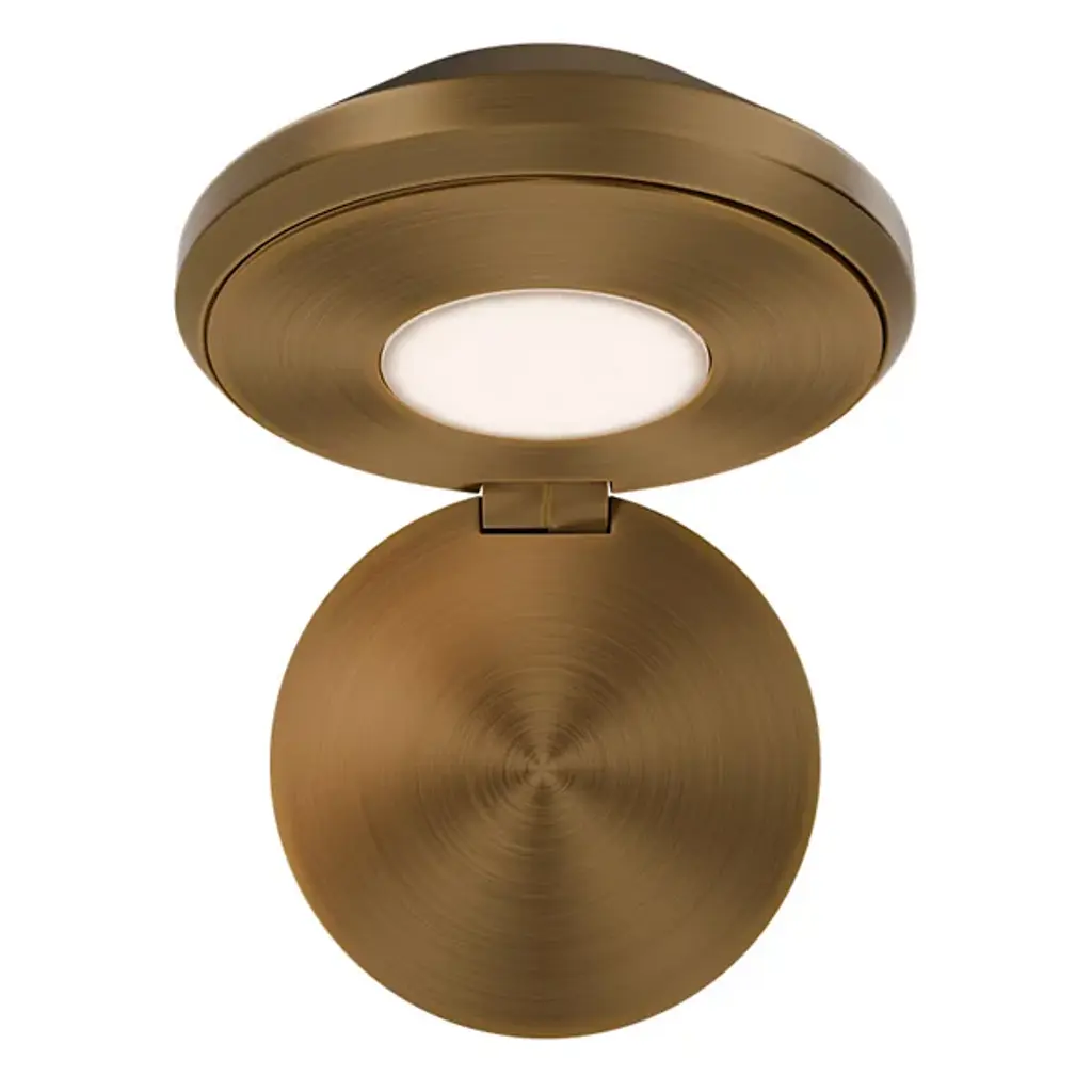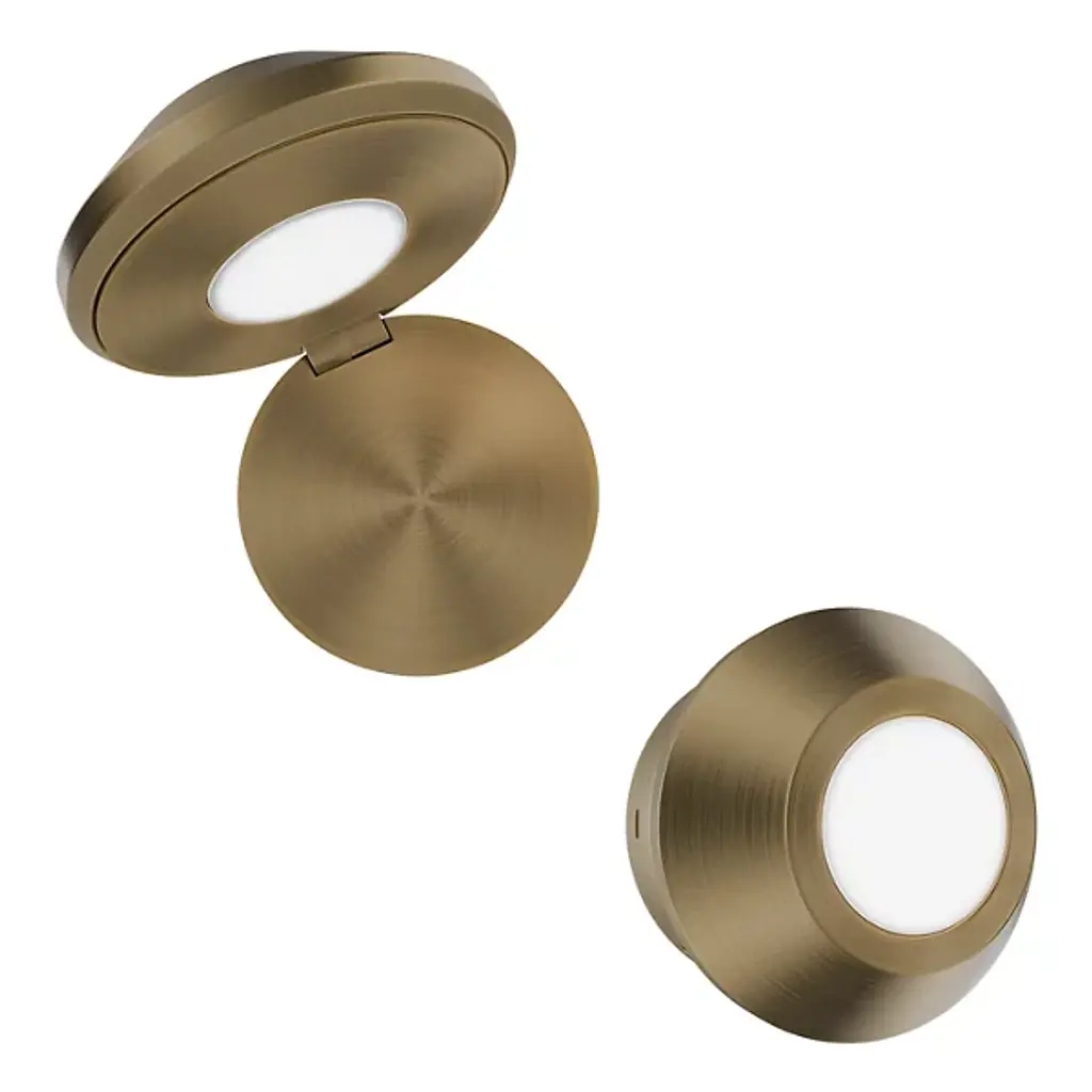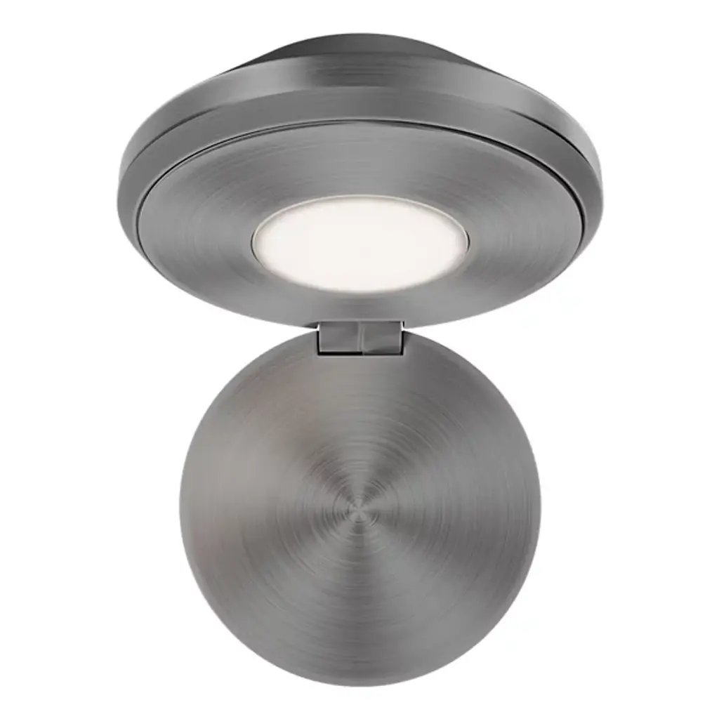 The Flipside LED Reading Wall Sconce from dweLED presents a minimalist circular form with a transformable lighting function. The disc rotates to reveal a dual-purpose design: closed, it provides soft ambient illumination; opened, it directs focused light downward for reading. This mechanical flexibility enables the sconce to adapt to various needs while maintaining clean, geometric lines. The compact profile suits tight spaces, with aluminum construction supporting the rotating mechanism. USB and USB-C charging ports integrate into the body, while frosted diffuser panels soften the LED output.