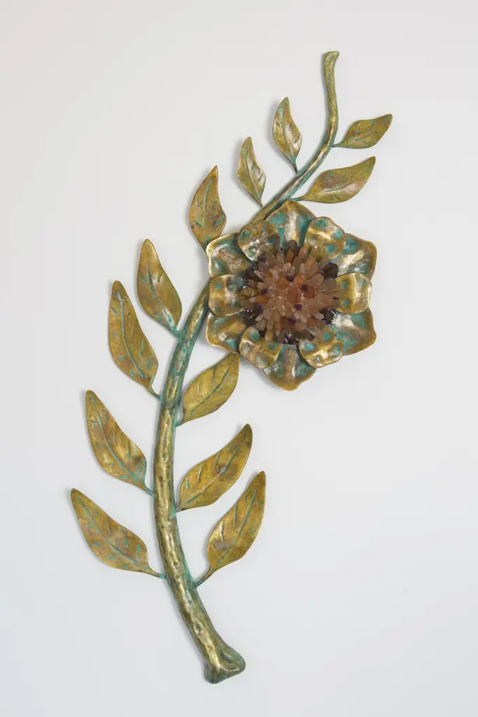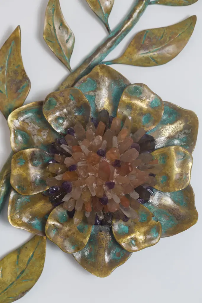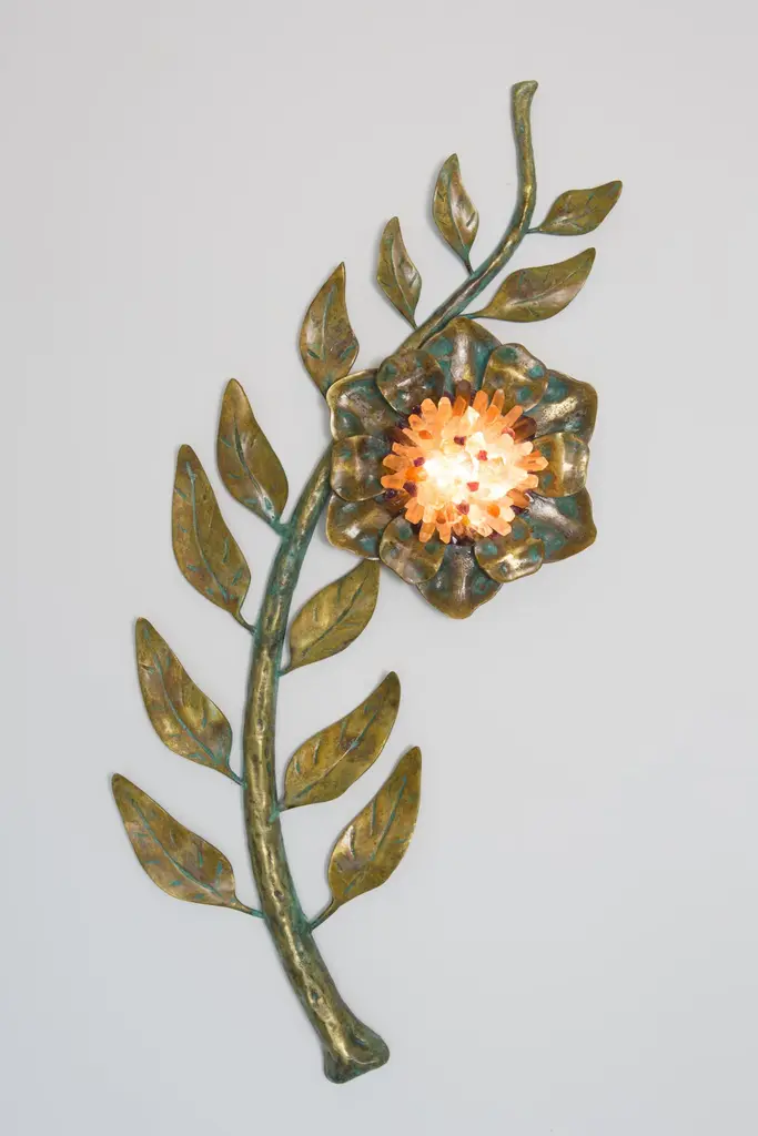 Flor de Tango wall lamp by Demian QuinckeDimensions: H 70 cmMaterials: 100% Casted brass, old green finishing, multi quartz hand arrangement White amber, amethyst, citrine, smoke quartz crystals1 micro LED Bi-Volt 120~220V 2,5W5.5 kgDemian Quincke develops unique handmade decorative objets d’art from precious stones that are carefully selected and perfectly fitted together, creating amazing forms of brilliance and beauty. The final appearance is like a bouquet of beautifully illuminated flowers, rendered in natural quartz, unfolding their petals.Demian’s artistry is a product of hard work, natural ability, and the unique artistic and cultural environment in which he was raised. Born in France to Uruguayan parents, Demian was exposed early to art by his artist mother and his father, who was a merchant in high decor and antique objects.When Demian was two years old, he relocated with his family to Uruguay, which began the process of broadening his world-view and developing his multi-cultural identity. After stops in California and Germany, he eventually arrived in Brazil at the age of fourteen, with an appreciation for the wide expanse of the World and his place in it.From the outset of his career, Demain worked to developed his unique style of artistic expression, all the while learning from other artists through observation. In 2010, upon returning from a study tour and research in New York City, he began to create, develop and produce his own pieces.In love with the natural beauty of semi-precious Brazilian stones, Demian uses them as the predominant material of his work. With them, he creates objets d’art that remind the viewer of the Earth’s natural beauty, even though the material has been transformed by his artistry. Internal or external lights enhance the brightness and beauty of the stones and highlight their artistic metamorphosis.