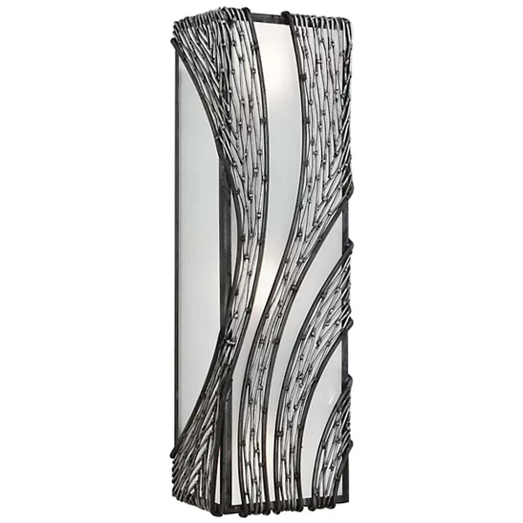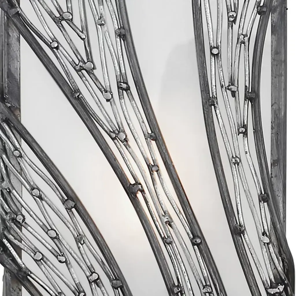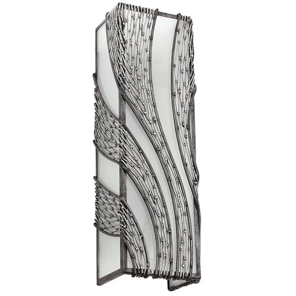 Defined by an intricate cascading pattern of hand-forged recycled steel, the Varaluz Flow Vertical Tall Wall Sconce adds a sophisticated, yet organic element to transitional and contemporary interiors. The rectangular recycled frost glass shade counterbalances fluid detail with a distinct shape and diffuse glow.