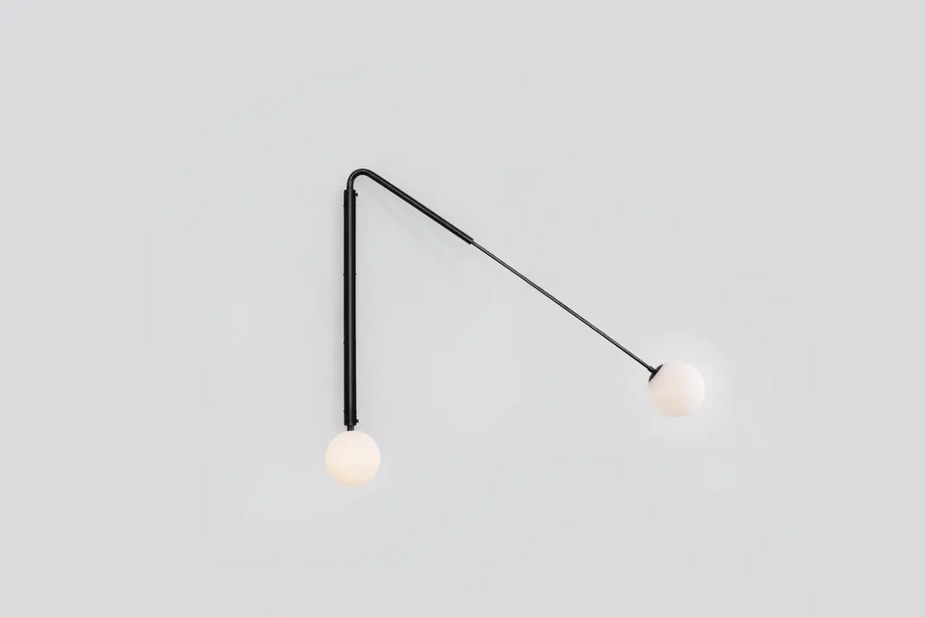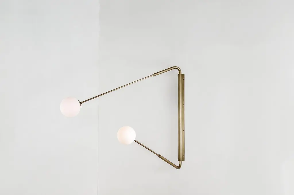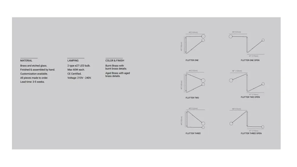 Flutter II, contemporary aged brass sconce by Paul MatterAvailable in black burnt brass or black burnt brass with etched glassTotal measure: 40” H x 48” WGlobe to globe dimensions when fully opened: 95”’Minimum 28” H x 34” WMaximum 60” H x 72” WThe long rotating arms are attached to a vertical, wall-mounted spine that results in a minimalist yet oversized fixture. Flutter comes in three variations, each with two elongated arms that can be adjusted to wherever light is needed. They can be hung alone or with others to create a unique wall composition, as well as primary and secondary light.Paul MatterPaul Matter is a contemporary light design studio that explores light design by blending the traditional with the experimental, form with function, and detail with the ordinary. The longevity of the designs is ensured by combining timeless visual language with materials that refine with age. The studio works closely with master craftsmen, developing hand-crafted products, finished and assembled with great attention to detail, one piece at a time.Drawing from a rich palette, the materials used include aged brass, copper,stone, leather and blown glass.All our lamps can be wired according to each country. If sold to the USA it will be wired for the USA for instance.