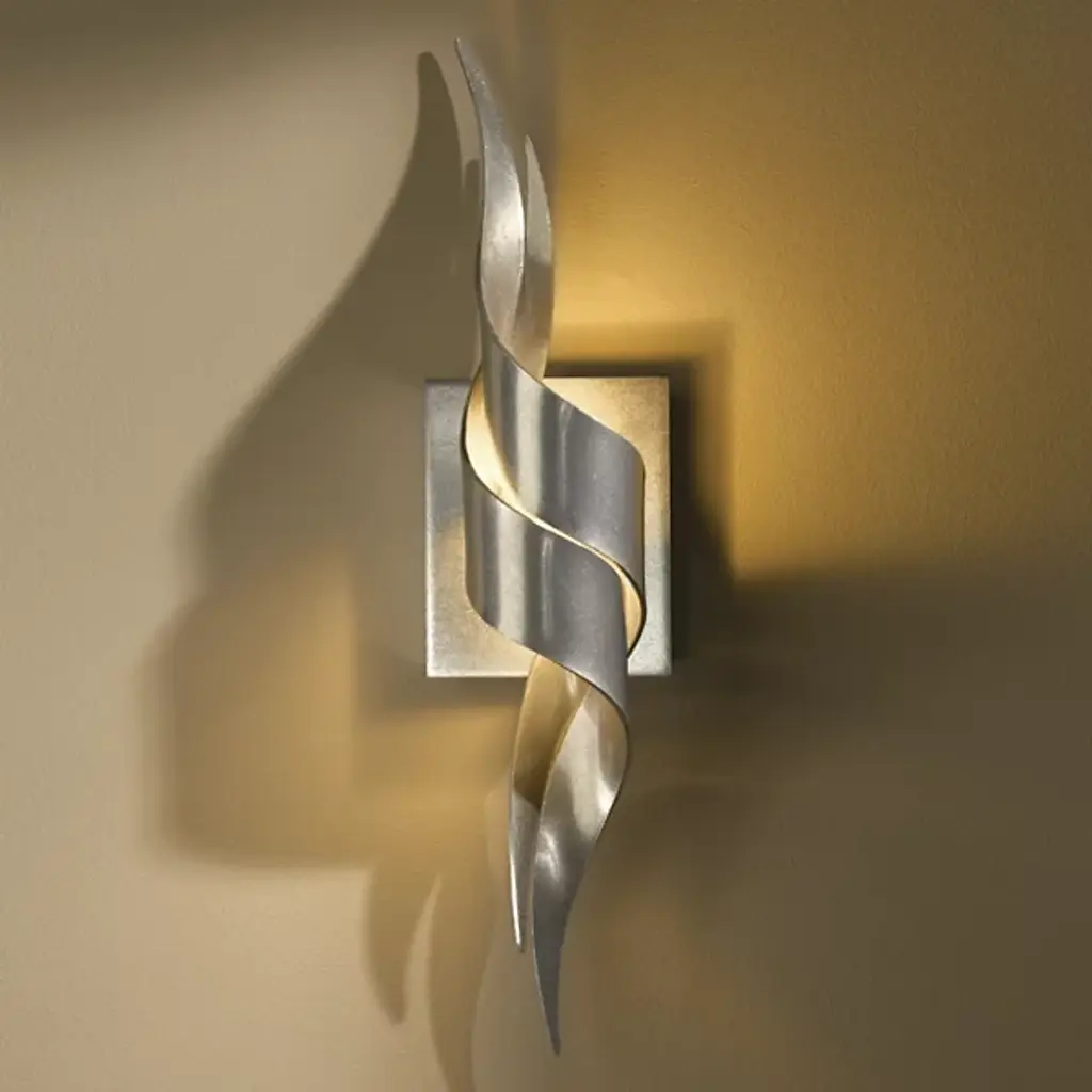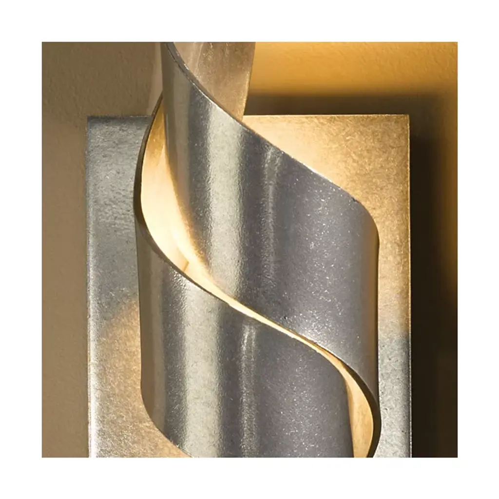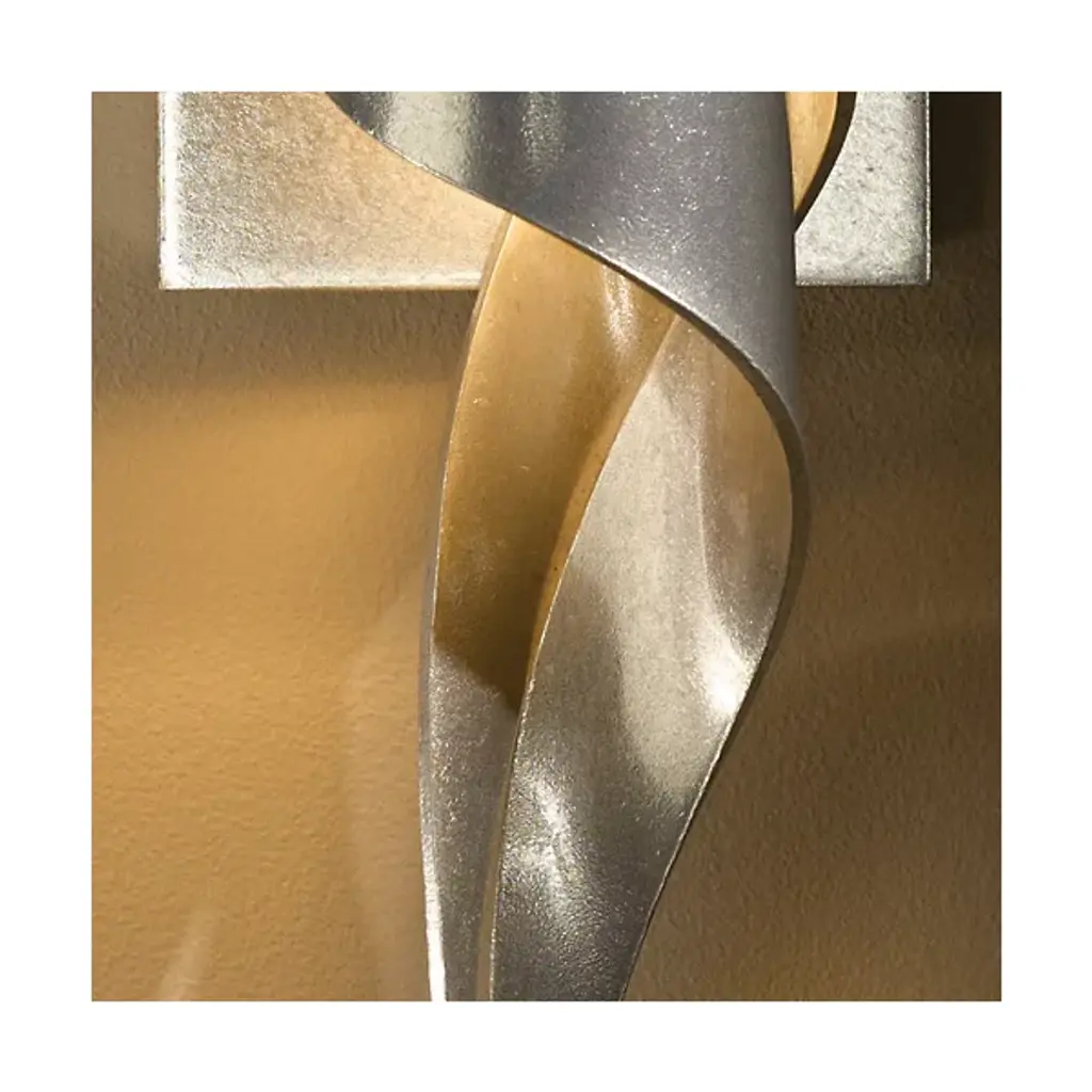 Fluid motion is captured in the Hubbardton Forge Flux Wall Sconce. Twin spirals of twisted aluminum are whirled together against a rectangular wall plate, conveying dynamic movement. Light peeks through from the main central curve and bounces dramatically off every edge and surface. A simple yet striking design, finished in sparkling metallics.