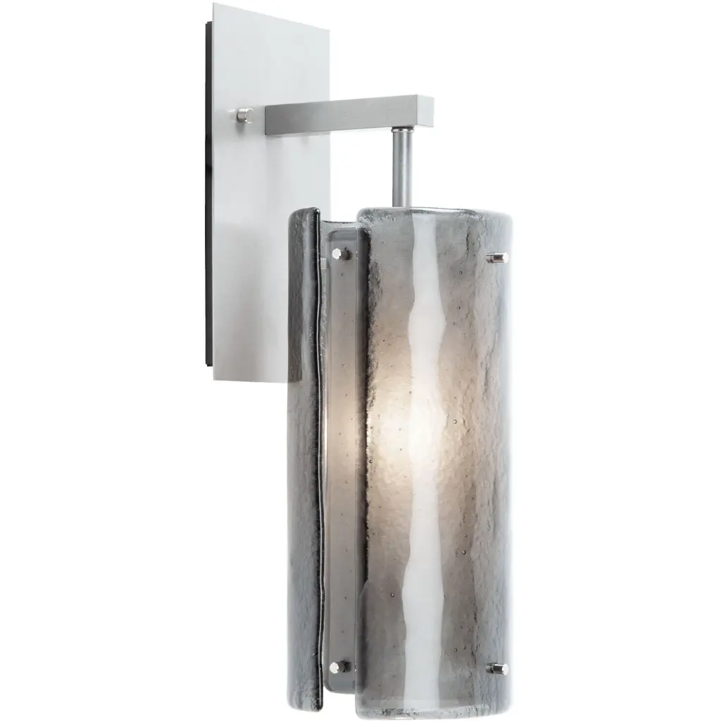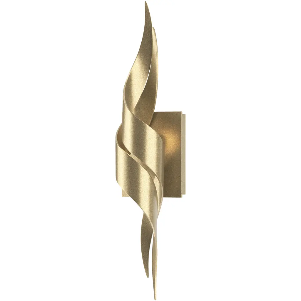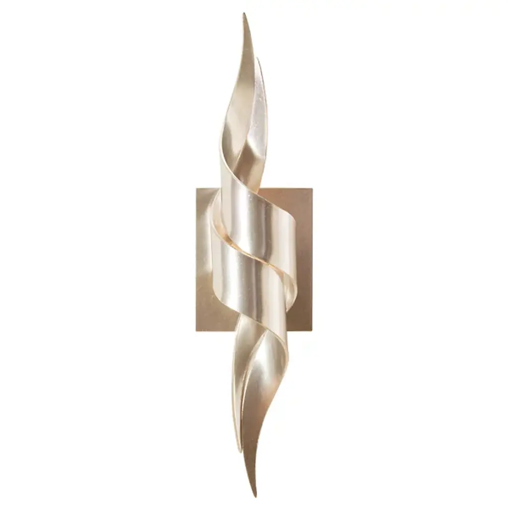 Fluid motion is captured in the Hubbardton Forge Flux Wall Sconce. Twin spirals of twisted aluminum are whirled together against a rectangular wall plate, conveying dynamic movement. Light peeks through from the main central curve and bounces dramatically off every edge and surface. A simple yet striking design, finished in sparkling metallics.