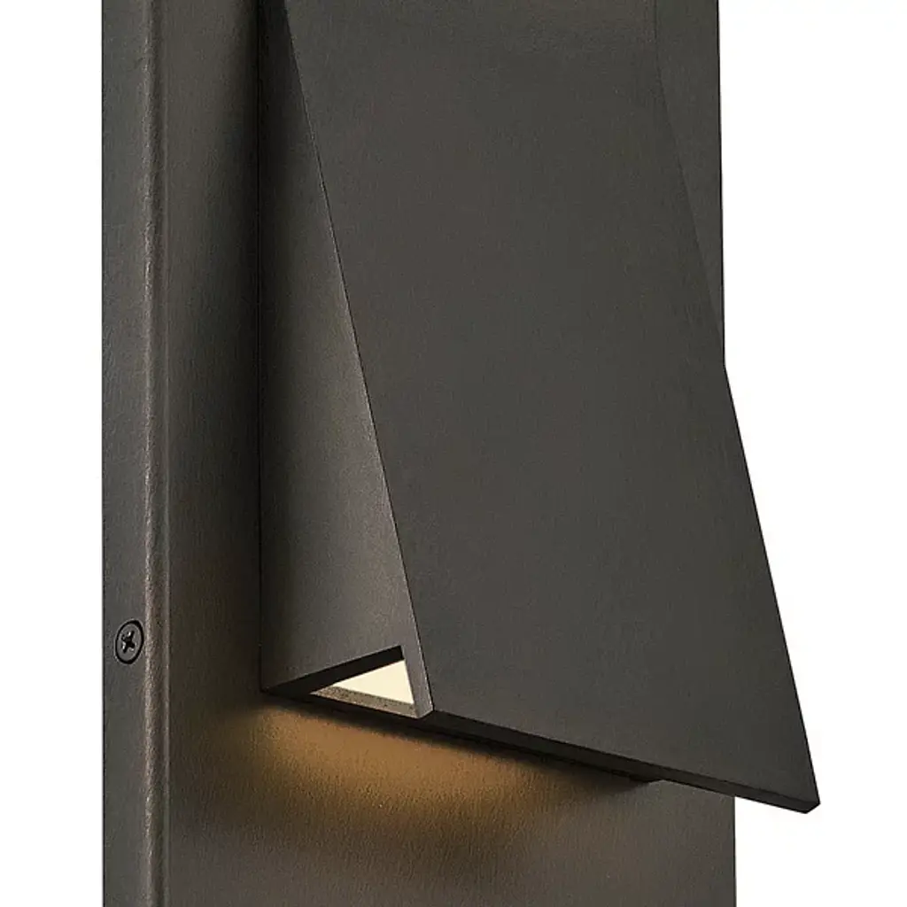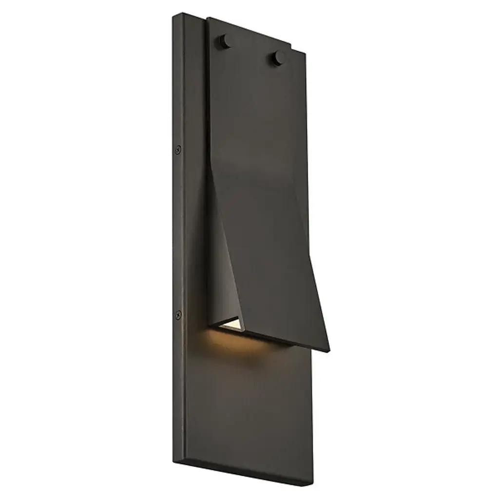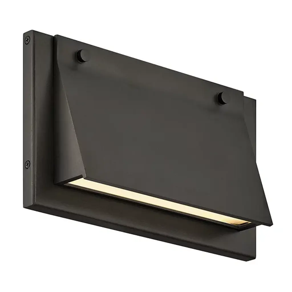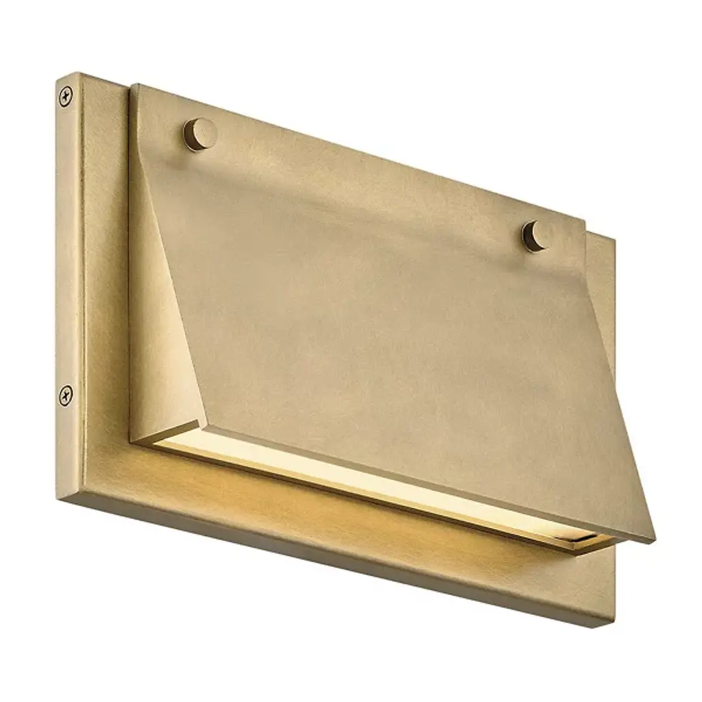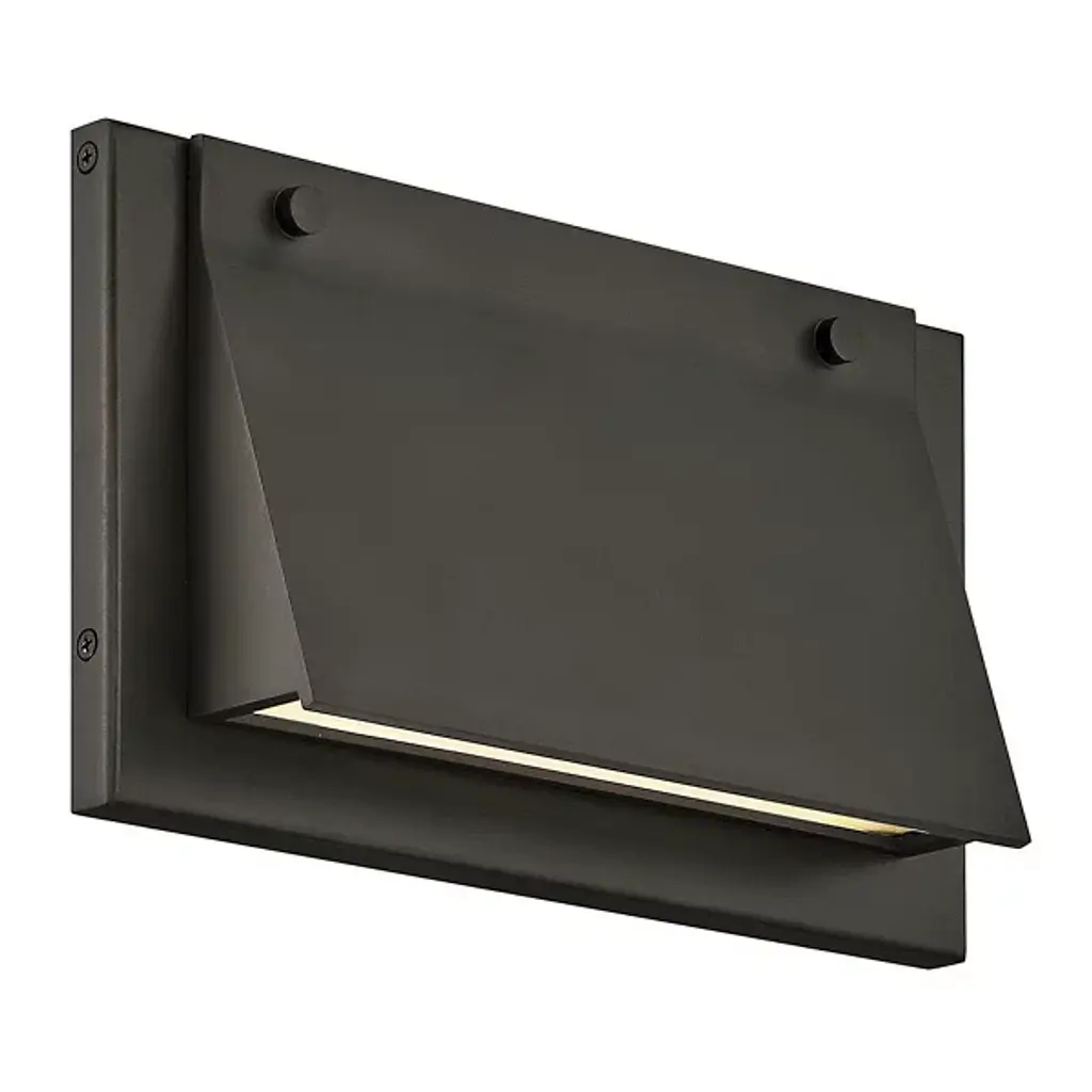 The Fold Outdoor LED Wall Sconce from Hinkley employs a modern downlight design with angular metal planes that direct illumination toward the ground. The creased aluminum construction creates geometric facets across the fixture's surface, with each fold adding dimension to the otherwise minimal form. Integrated LEDs provide energy-efficient illumination, and the etched glass diffuses the LED source while the folded metal housing shields direct view of the light. This wall sconce’s aluminum construction withstands exterior conditions while maintaining a compact profile.