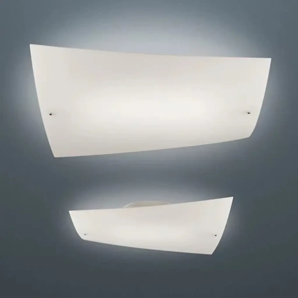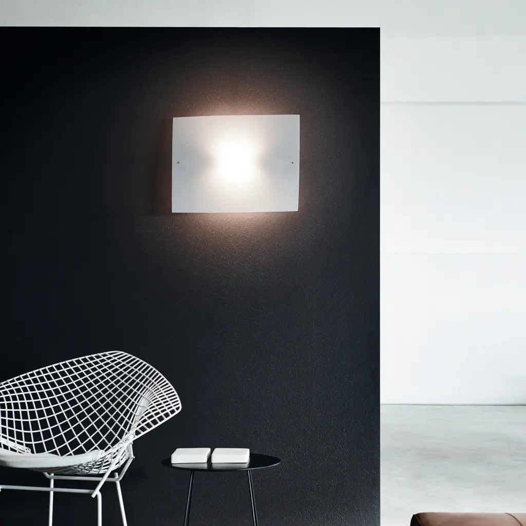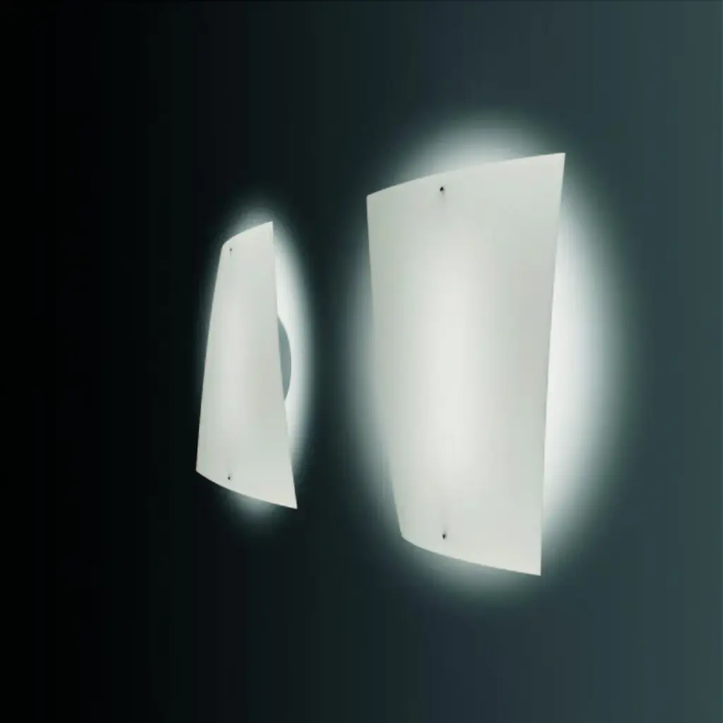 Designed by the founders of Foscarini in the first years of the company's life, Folio pays homage to the simplicity of the small gestures that make a lighting design decorative. This wall lamp evokes a sheet of paper being stretched. Two corners bend slightly towards the wall or the ceiling with a movement just hinted at but enough to give volume to the two dimensional shape of a sheet of paper. Two small screws hook the blown glass diffuser to the metal support and these two points become a delicate decorative element. Folio's light source is housed inside the metal support and diffuses a warm, intense light through its satin-finished screen. Features