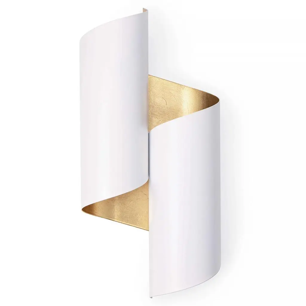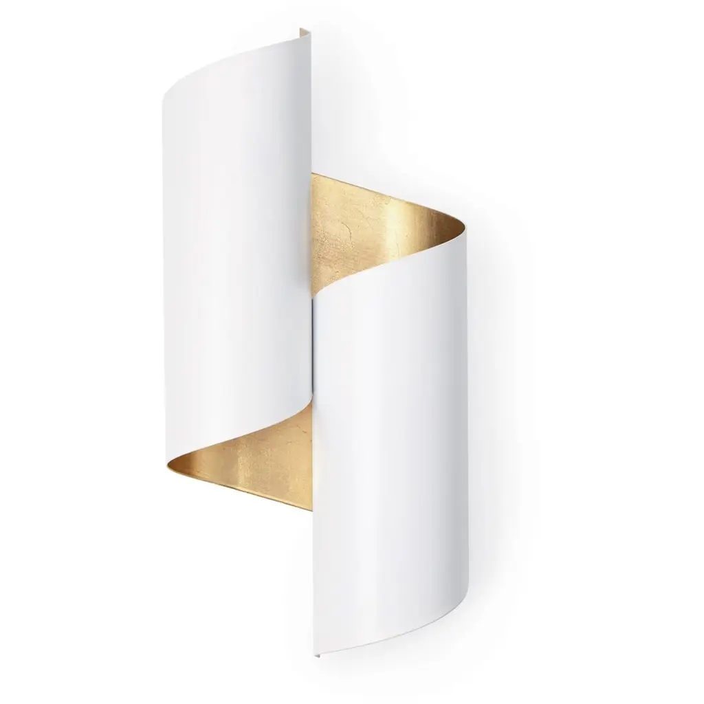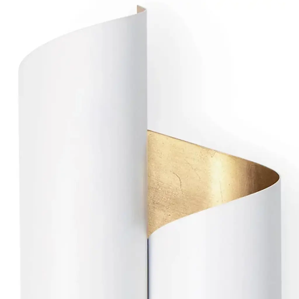 Unfurl your good taste across your wall and hallway spaces with the Folio Wall Sconce from Regina Andrew. Anchored by a concealed wall mount, this avant-garde sculptural assembly of diagonally-curled aluminum sheeting sweeps around two candelabra-style lamps, blocking bright glare from the sides, and focusing out a wall wash above and below. For a final note of elegance, the aluminum body’s interior is embellished with a metallic surface hue that glows with a sparkling, reflected ambiance.