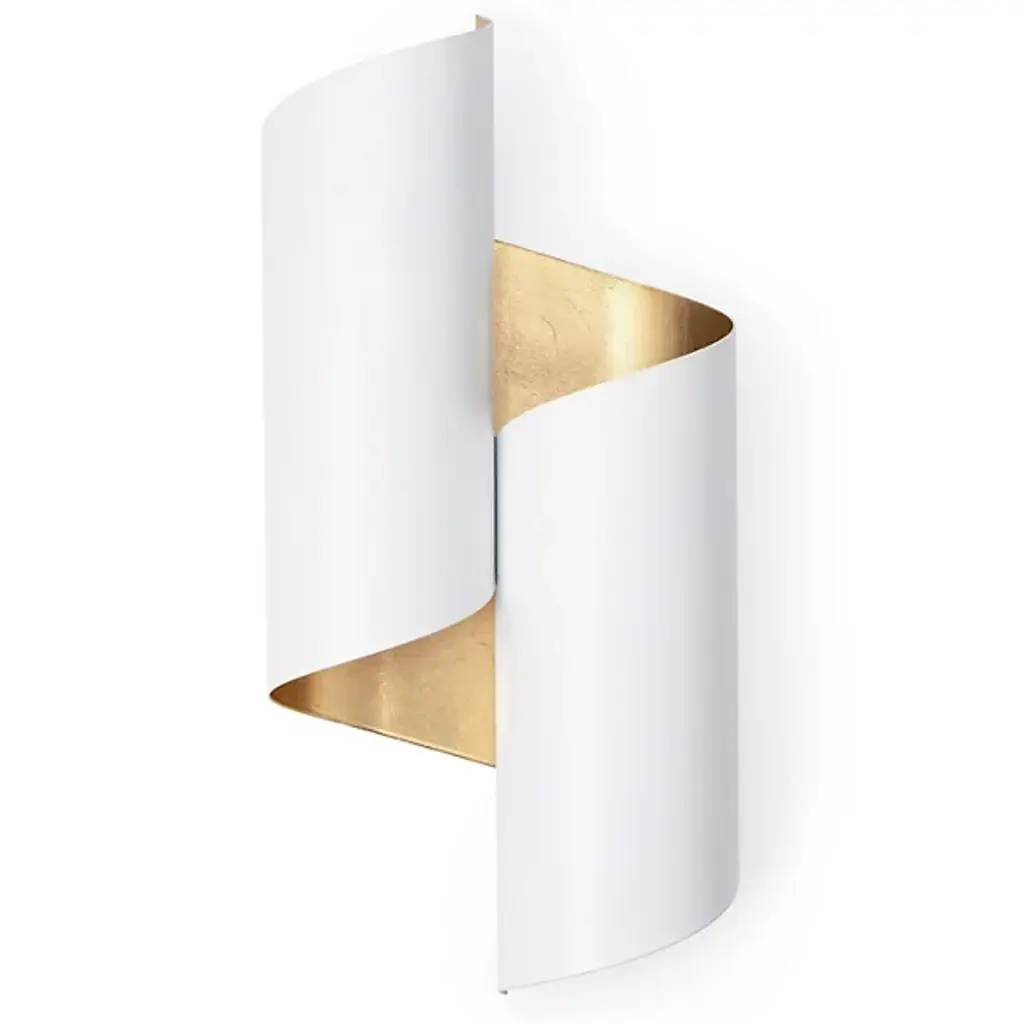 Unfurl your good taste across your wall and hallway spaces with the Folio Wall Sconce from Regina Andrew. Anchored by a concealed wall mount, this avant-garde sculptural assembly of diagonally-curled aluminum sheeting sweeps around two candelabra-style lamps, blocking bright glare from the sides, and focusing out a wall wash above and below. For a final note of elegance, the aluminum body’s interior is embellished with a metallic surface hue that glows with a sparkling, reflected ambiance.